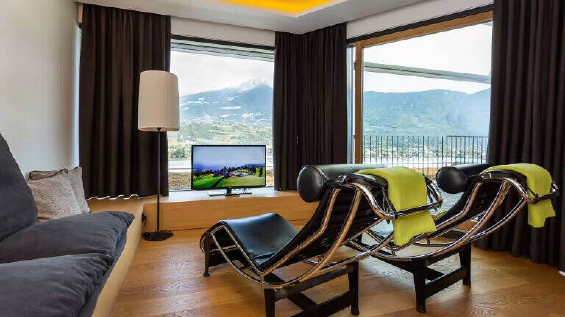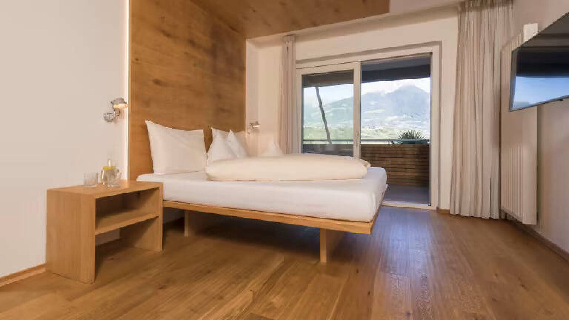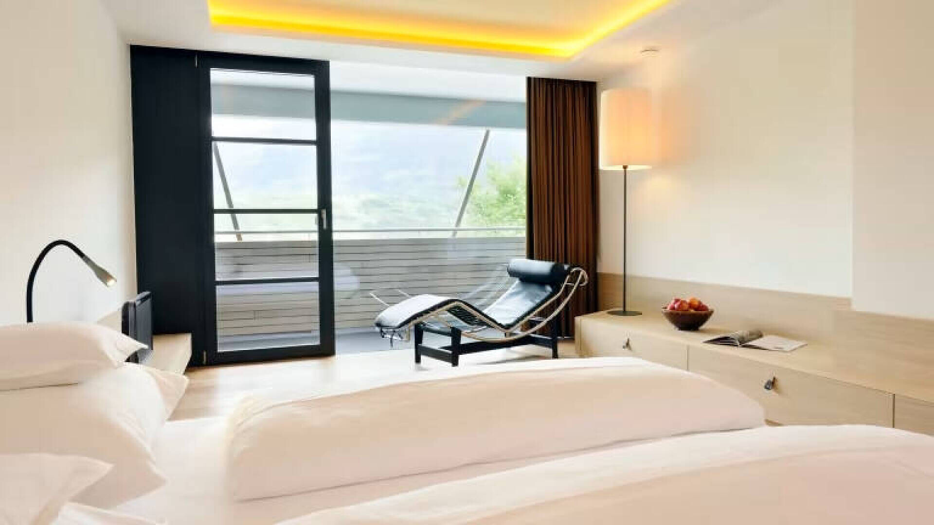 Puristico ed elegante con vista panoramica La camera convince per la sua luminosità, il design puristico e la vista panoramica attraverso la grande finestra e il balcone. Su circa 30 m² c'è spazio sufficiente per le vostre vacanze rilassanti. Il pavimento in legno naturale e il classico lettino Corbusier offrono un comfort accogliente. La vista dal balcone sulla vivace città termale di Merano e sulle montagne dell'Alto Adige è fantastica. Il bagno e la toilette sono separati.Dimensione della camera: 30 m2Puristic and stylish with panoramic view Raffreddamento senza rumore, senza correnti d'aria, 100% aria fresca, isolamento acusticoCamera doppia in stile naturale-moderno, pavimento in vero legno, ca. 30 m²Balcone con fantastica vista panoramica su MeranoLettino Le Corbusier per il relaxBagno con doccia a filo pavimento, WC separato, specchio per il trucco, asciugacapelliWireless Lan inclusa, TV, telefono, cassaforte, piccolo frigoriferoBorsa wellness con accappatoio