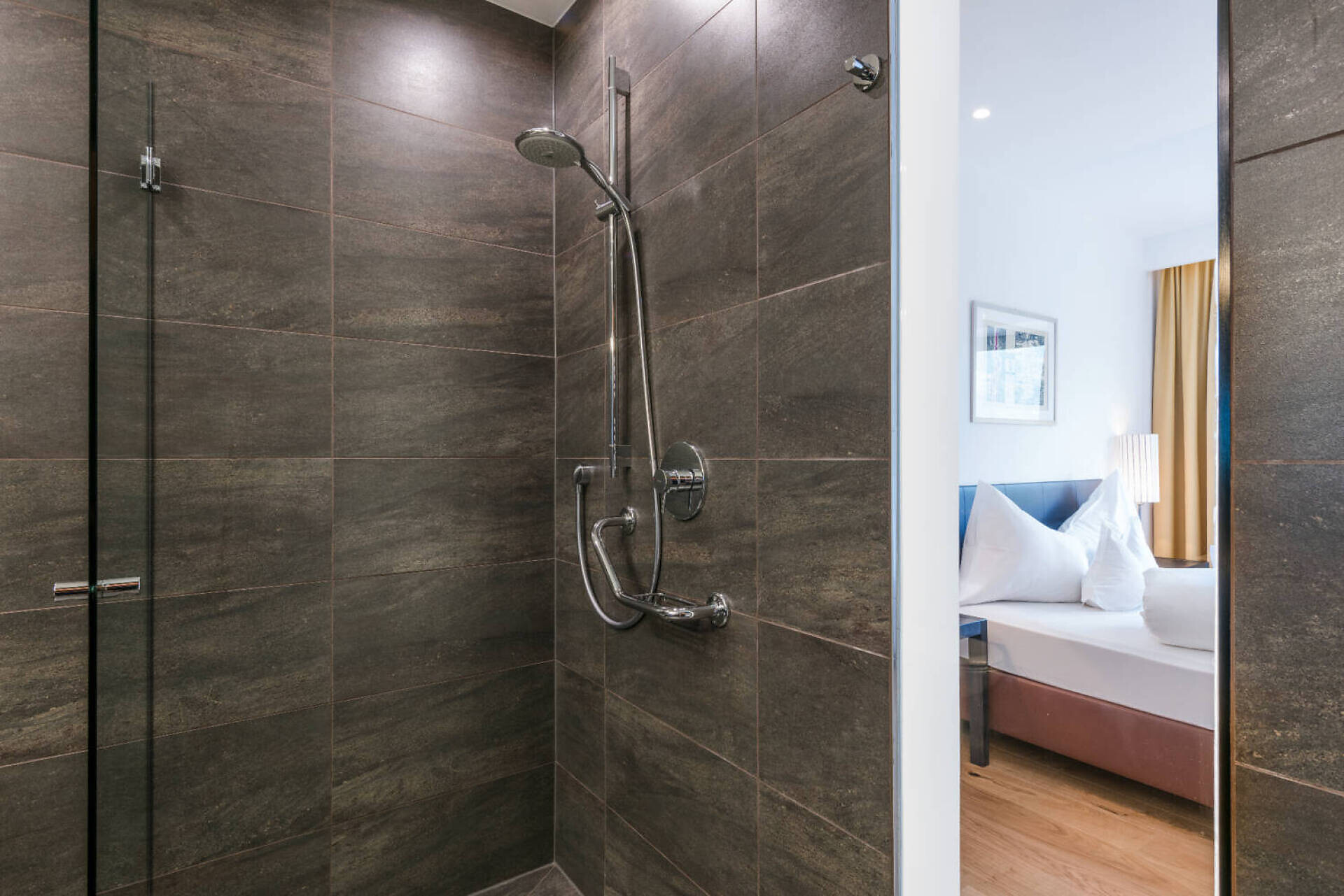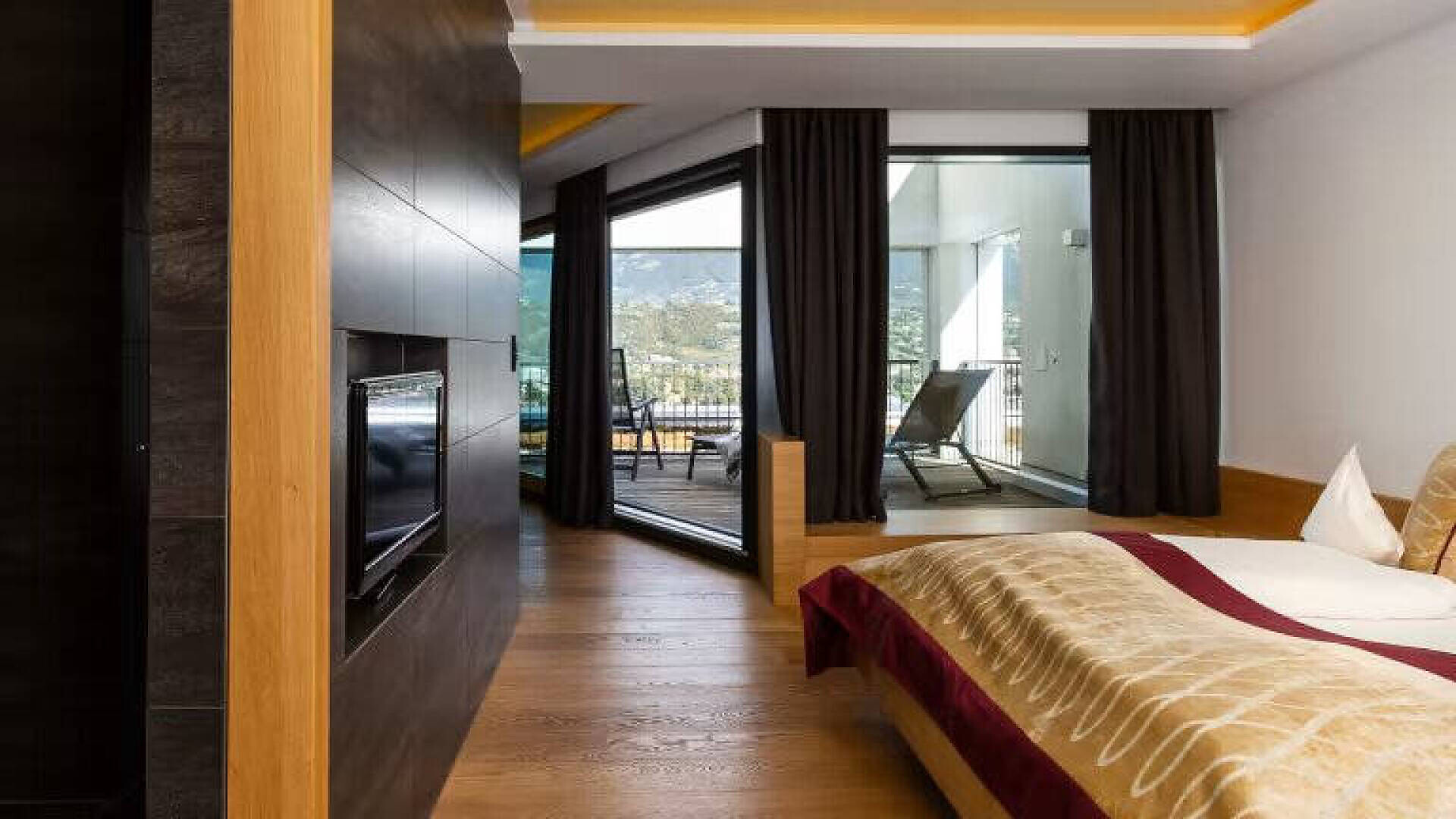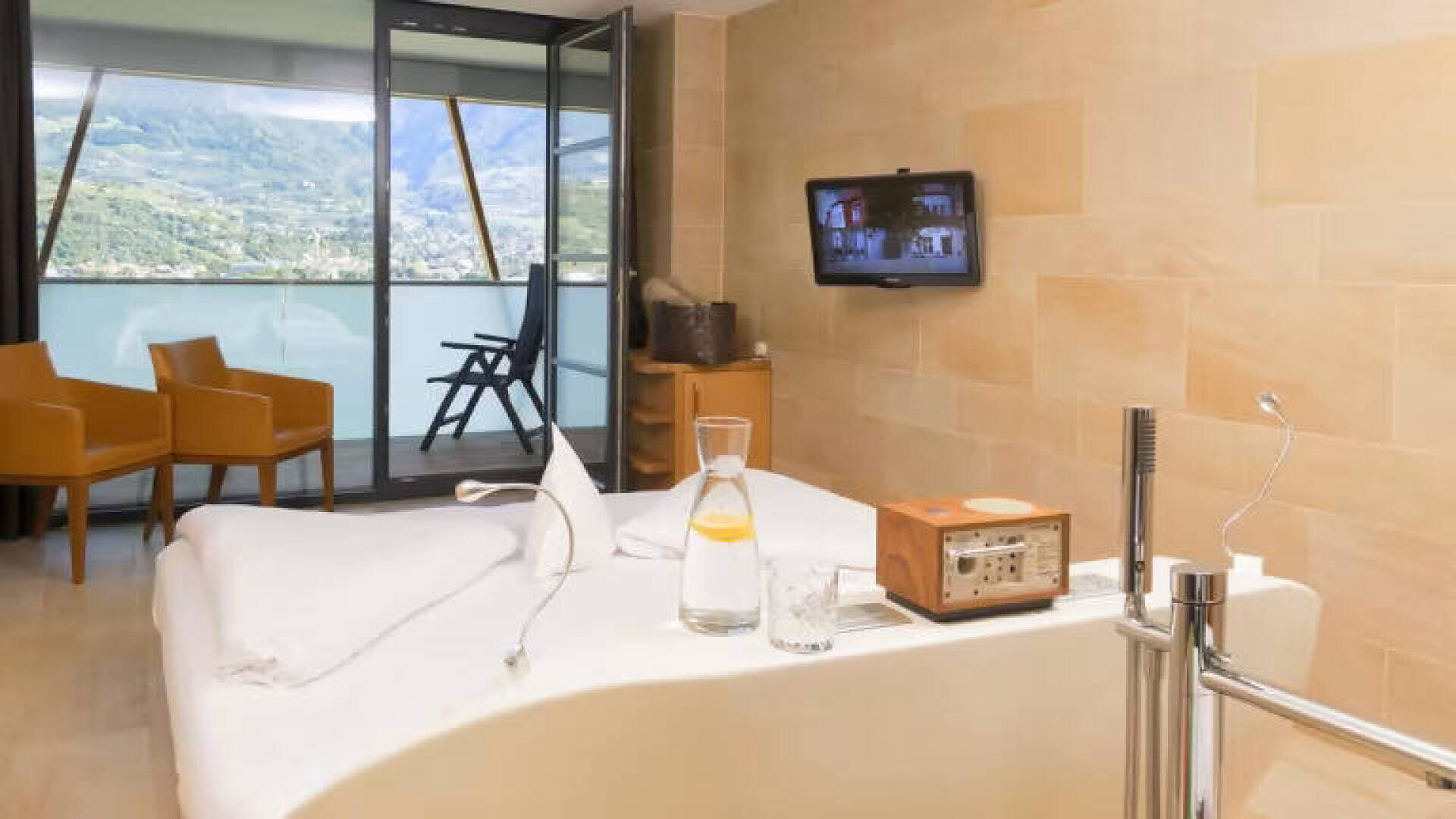 Puristico ed elegante con vista panoramica La camera convince per la sua luminosità, il design puristico e la vista panoramica attraverso la grande finestra e il balcone. Su circa 30 m² c'è spazio sufficiente per le vostre vacanze rilassanti. Il pavimento in legno naturale e il classico lettino Corbusier offrono un comfort accogliente. La vista dal balcone sulla vivace città termale di Merano e sulle montagne dell'Alto Adige è fantastica. Il bagno e la toilette sono separati.Dimensione della camera: 30 m2Puristic and stylish with panoramic view Raffreddamento senza rumore, senza correnti d'aria, 100% aria fresca, isolamento acusticoCamera doppia in stile naturale-moderno, pavimento in vero legno, ca. 30 m²Balcone con fantastica vista panoramica su MeranoLettino Le Corbusier per il relaxBagno con doccia a filo pavimento, WC separato, specchio per il trucco, asciugacapelliWireless Lan inclusa, TV, telefono, cassaforte, piccolo frigoriferoBorsa wellness con accappatoio