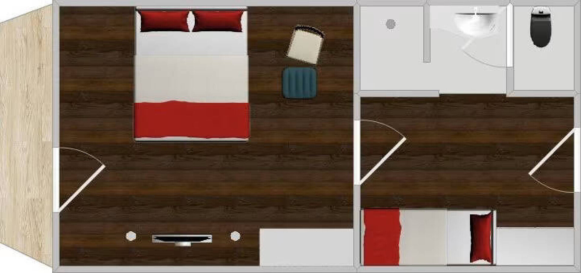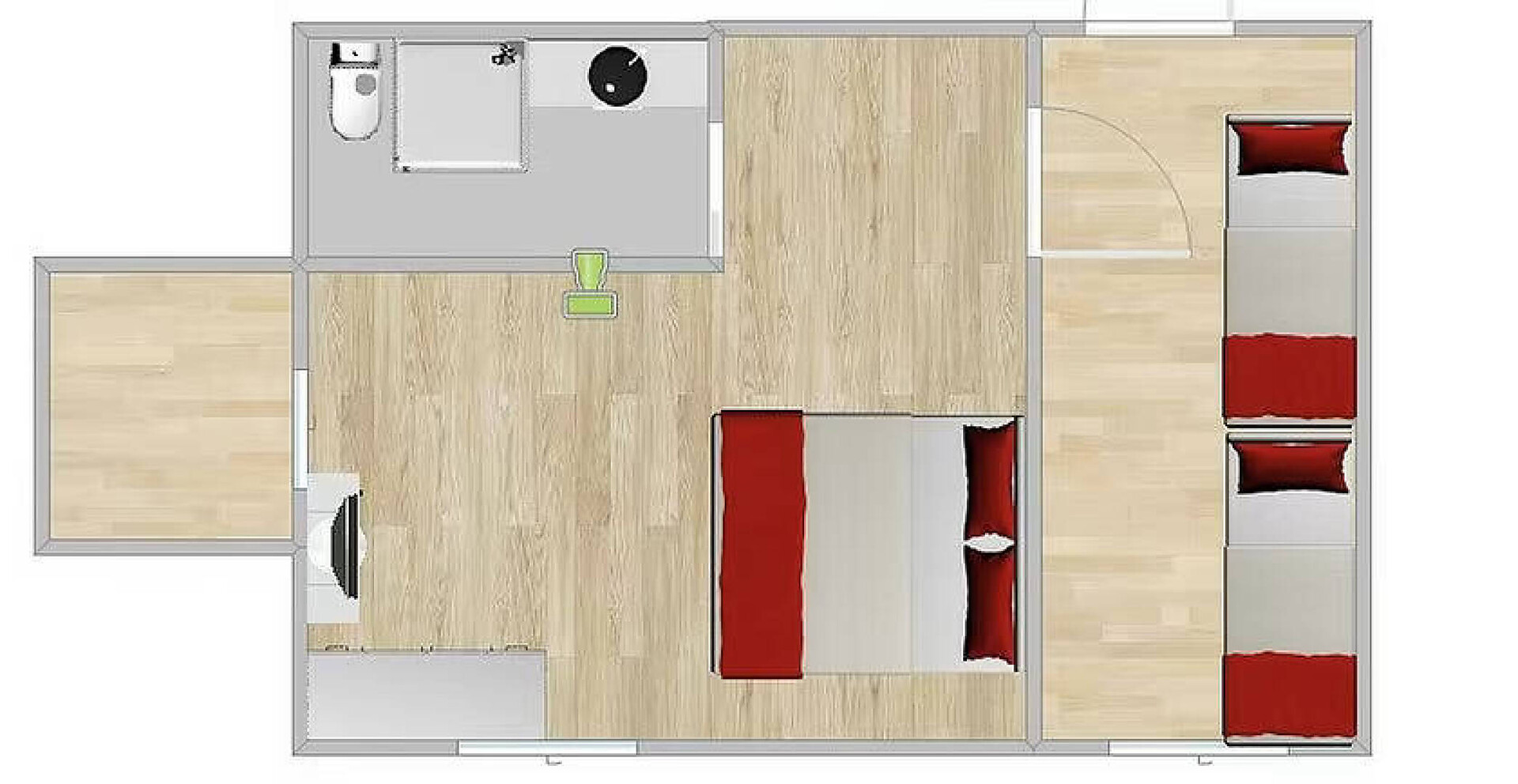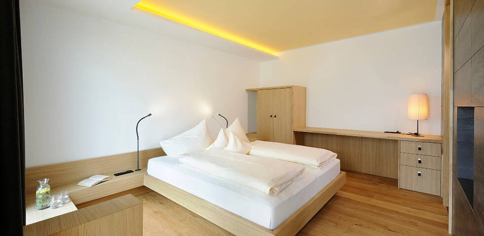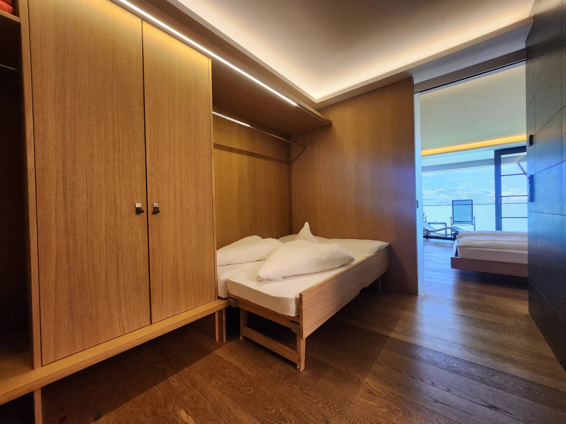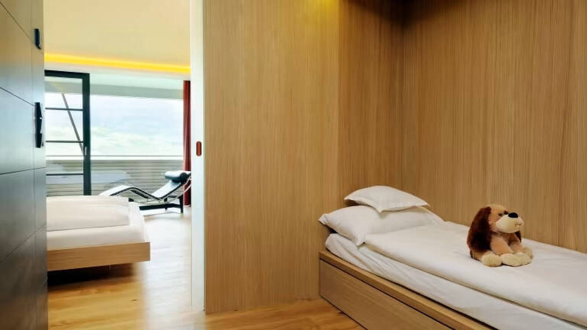 La camera convince per la sua luminosità, il design puristico e la vista panoramica attraverso la grande finestra e il balcone. Su circa 30 m² c'è spazio sufficiente per le vostre vacanze rilassanti. Il pavimento in legno naturale e il classico lettino Corbusier offrono un comfort accogliente. La vista dal balcone sulla vivace città termale di Merano e sulle montagne dell'Alto Adige è fantastica. Il bagno e la toilette sono separati. Anticamera con possibilità di dormire per 1 -2 bambini fino a circa 12 anni.Dimensione camera: 34 m2Raffreddamento senza rumore, senza correnti d'aria, 100% aria fresca, isolamento acusticoCamera doppia in stile naturale-moderno, pavimento in vero legno, ca. 34 m²Balcone con fantastica vista panoramica su MeranoChaise Longue Le Corbusier per il relaxterzo letto (1,80m x 1,50m) diviso dalla stanza centraleBagno con doccia a filo pavimento, WC separato, specchio per il trucco, asciugacapelliWireless Lan inclusa, TV, telefono, cassaforte, piccolo frigoriferoBorsa wellness con accappatoioCertificato O² OK34 m² per un maggiore comfort
