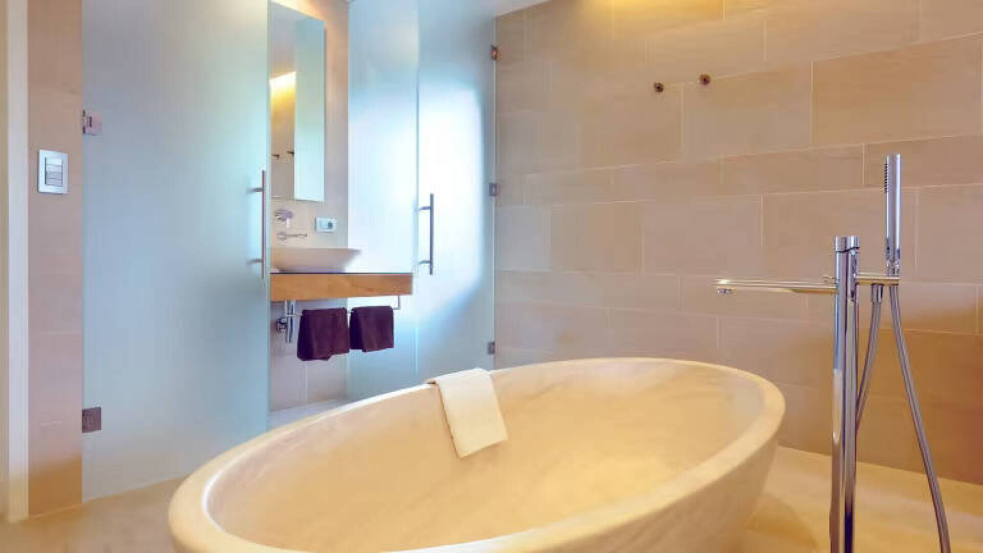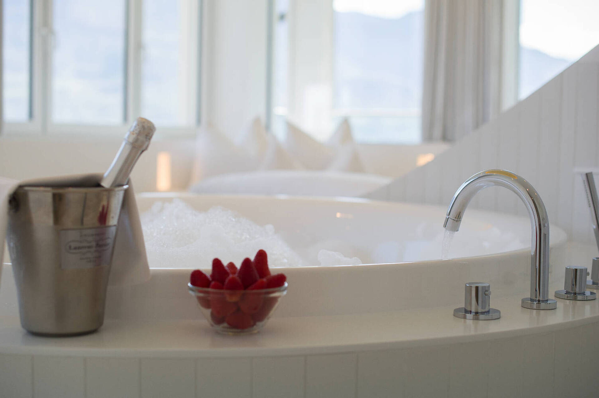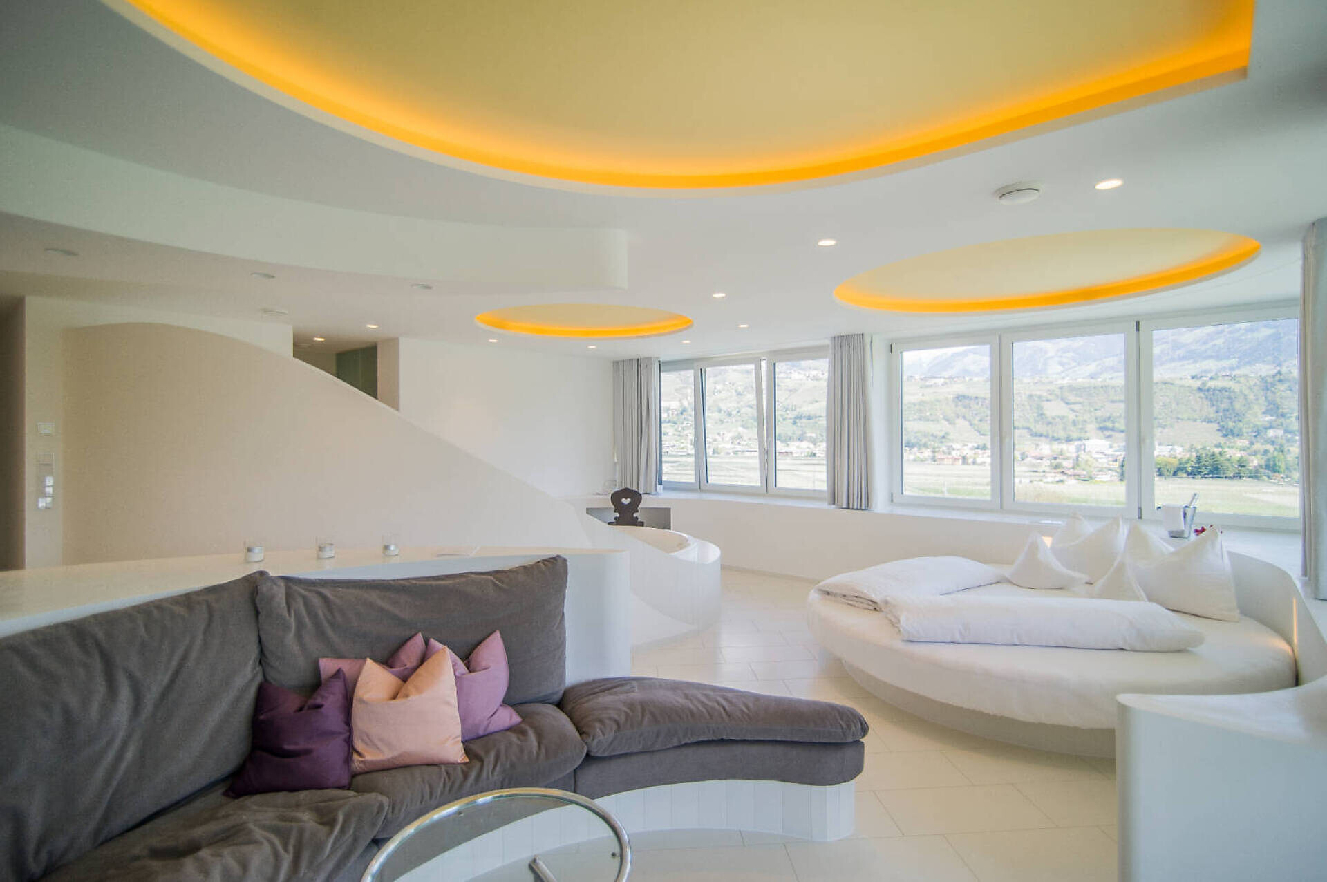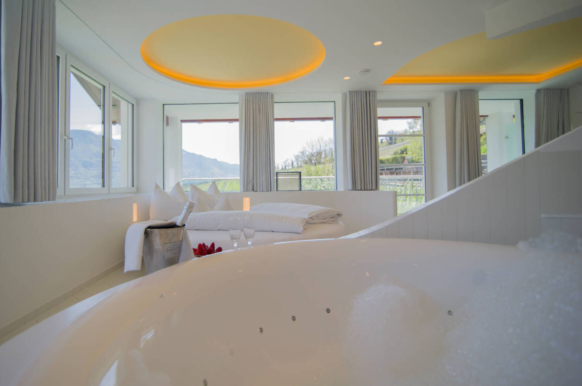 LA FRESCHEZZA INCONTRA L'ARMONIA Tempo per due in quella che è probabilmente la suite più originale dell'Alto Adige. O anche consigliata alle coppie di genitori con un bambino piccolo. Il design purista in bianco, combinato con colori e materiali caldi, si unisce nel vero senso della parola per formare un'oasi di benessere a tutto tondo: 45 m² con vasca idromassaggio privata integrata. Immergetevi in un bagno di bolle e mettetevi comodi nell'accogliente nido altrettanto rotondo, magari con un buon bicchiere della nostra cantina. Nella residenza Pazeider, collegata alla casa principale tramite un corridoio esterno aperto.- Adatto a chi soffre di allergie- Sistema di climatizzazione FACS: aria fresca a temperatura controllata al 100%, silenziosa e senza correnti d'aria.- Vasca idromassaggio in camera, grande letto rotondo, divano rotondo- Balcone con vista panoramica su Marlengo, Merano e le montagne altoatesine- Bagno con doccia, WC separato, asciugacapelli, specchio per il trucco- Pavimento in pietra serena- TV SATELLITARE- Frigorifero (non riempito)- Culla su richiestaSERVIZI PAZEIDER INCLUSI:- WLAN, telefono- Accappatoio e pantofole in spugna dell'hotel- Acqua potabile al fluoro della sorgente Pazeider da imbottigliare autonomamente