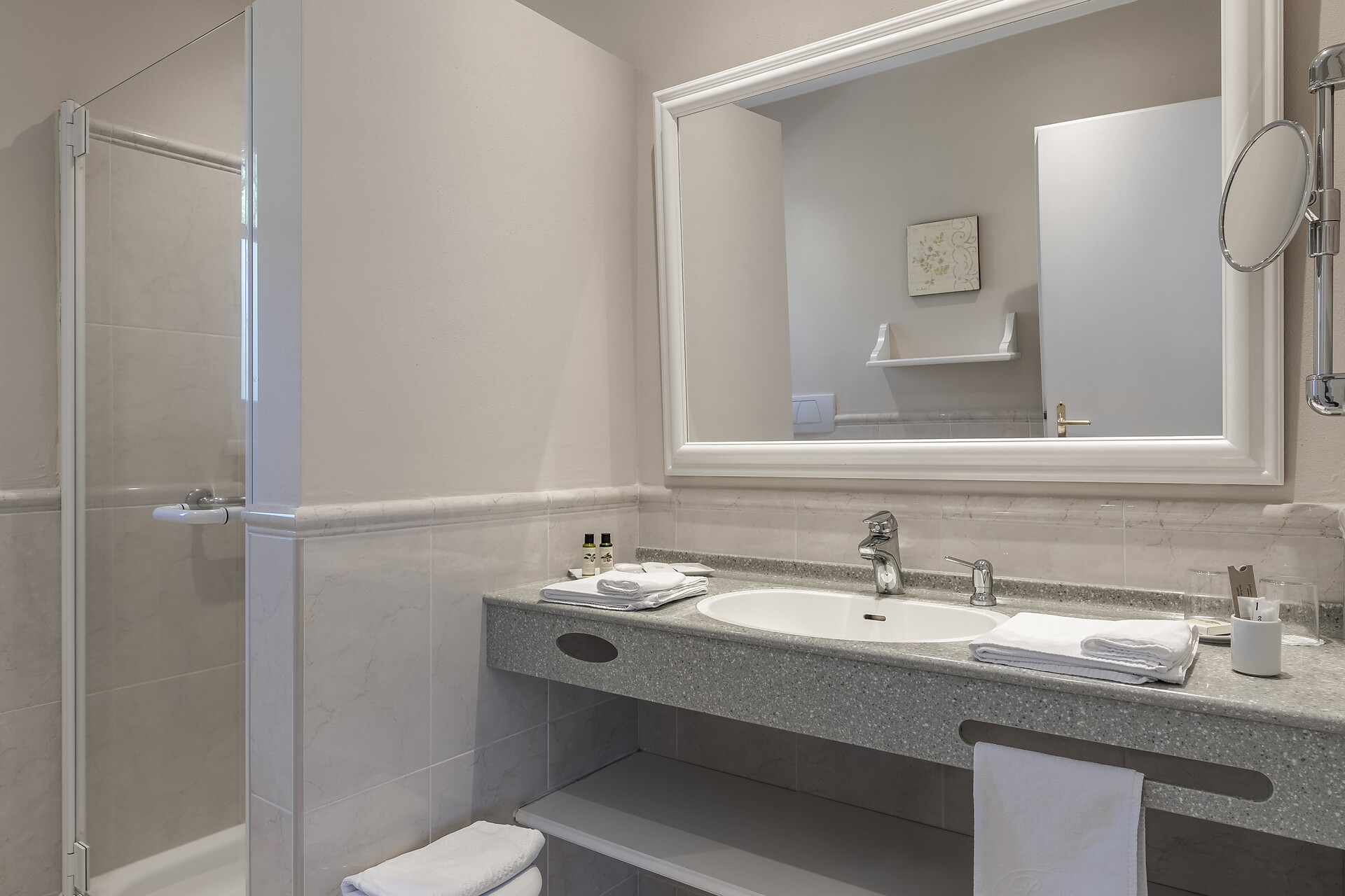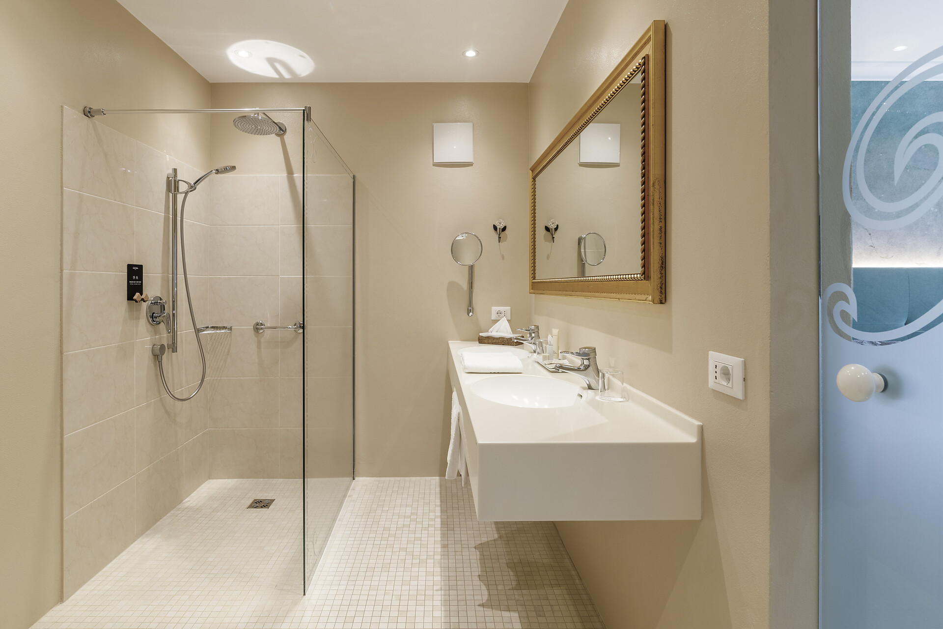 L'Hotel Pienzenau am Schloßpark dispone di 2 doppie per persone con esigenze speciali, dotate di bagno ampio con doccia a pavimento attrezzata ma senza seggiolino e wc con maniglie di sostegno. Servizi interni dell'albergo agibili senza particolari difficoltà (compresa zona wellness), in parte raggiungibili con ascensore (140x110 cm, porta 80 cm). Disponibilità di parcheggio esterno e garage sotterraneo, entrambi comodi.