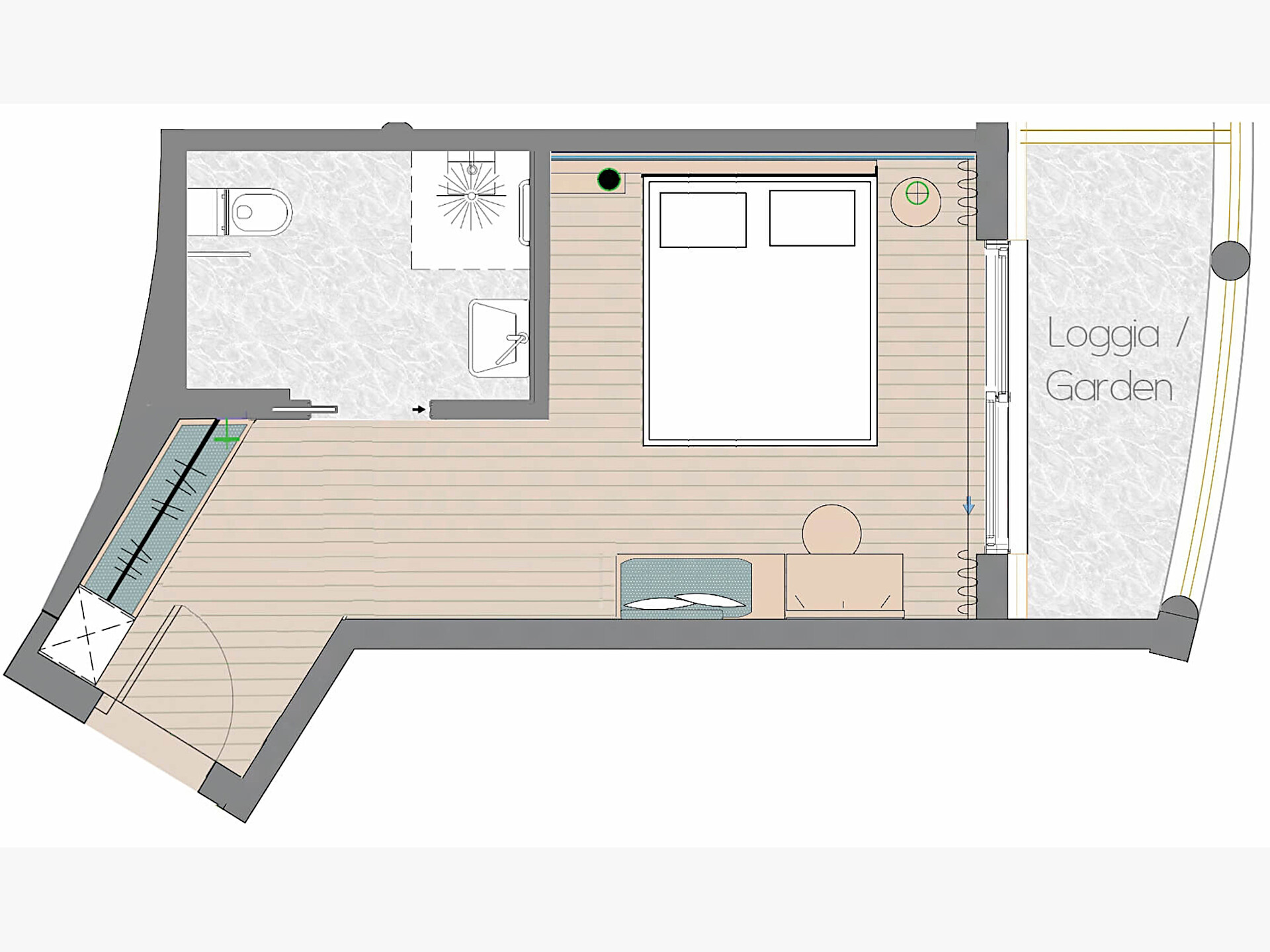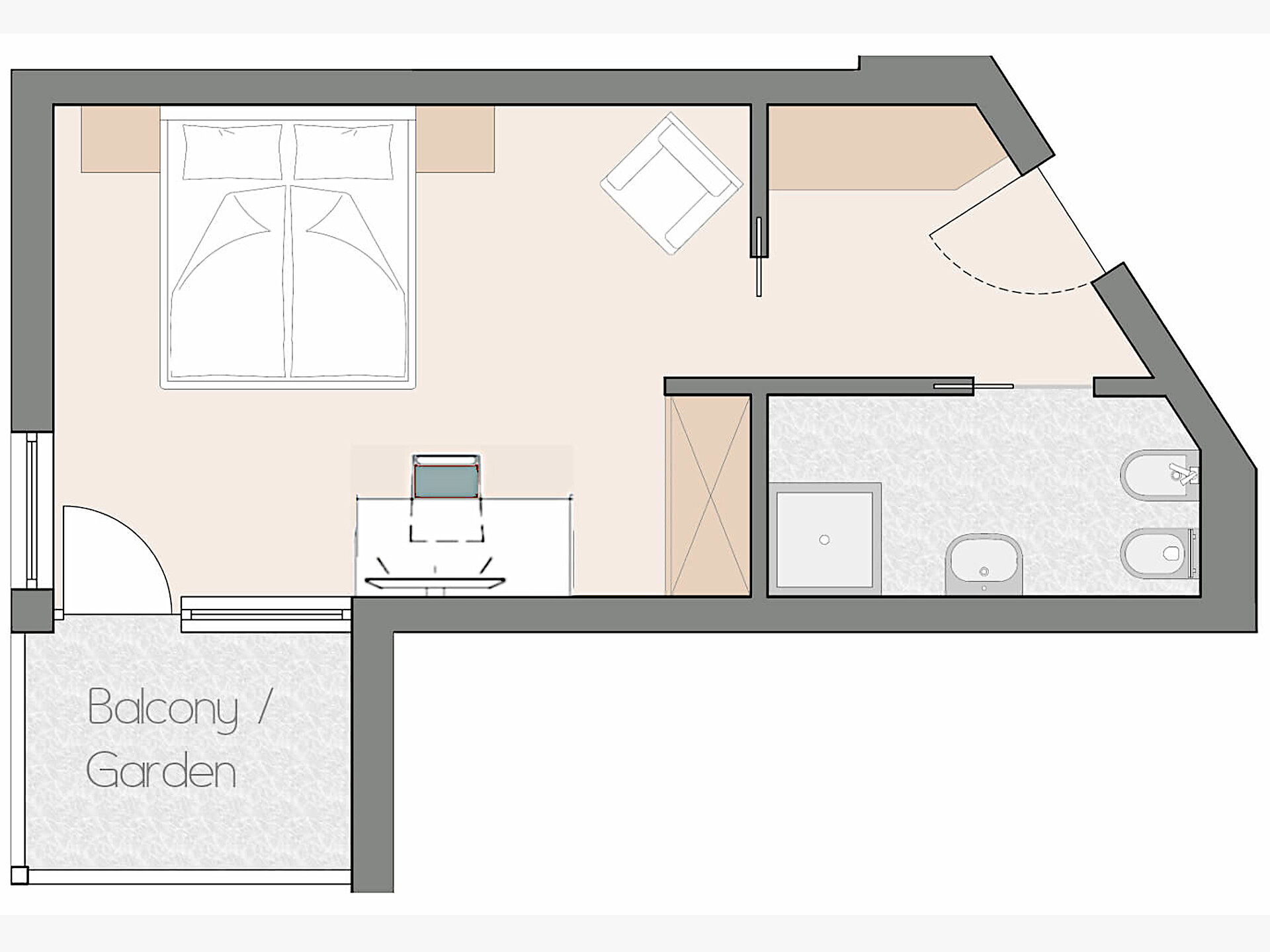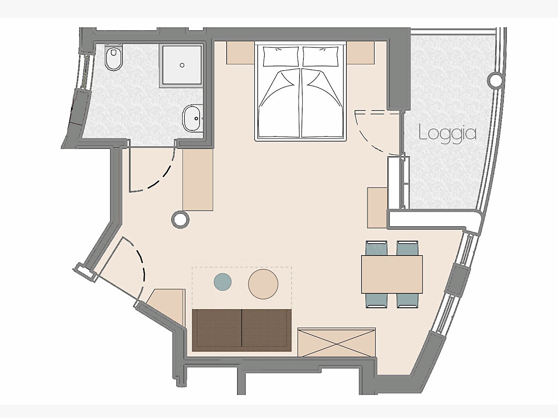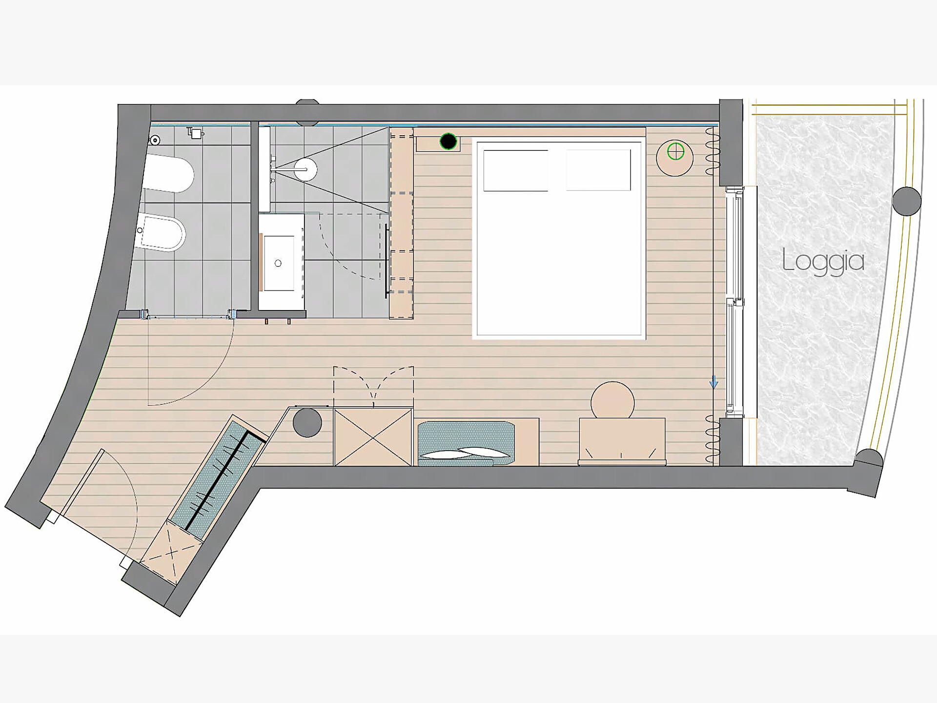 una moderna e aperta camera doppia comfort (22m²) con letto matrimoniale king-size e loggia privata, bagno con grande doccia a pioggia, WC seperato con bidet, specchio per il trucco e asciugacapelli, TV satellitare con schermo piatto, cassaforte per portatili, WIFI internet, telefono, frigorifero e bollitore