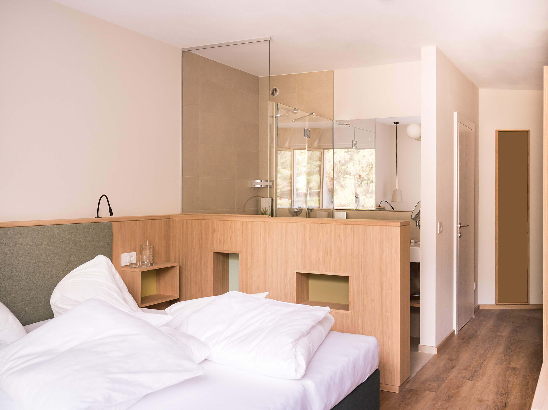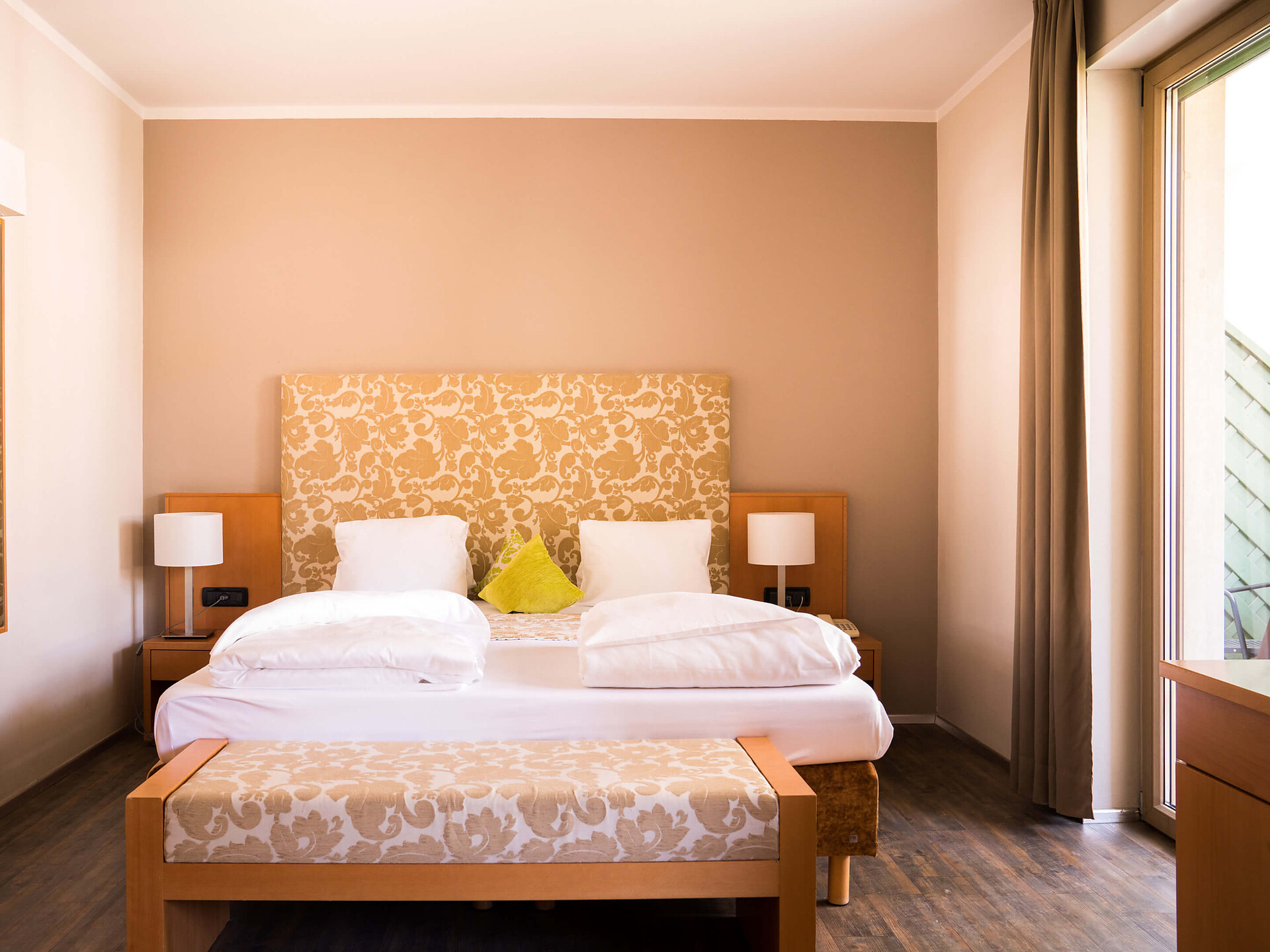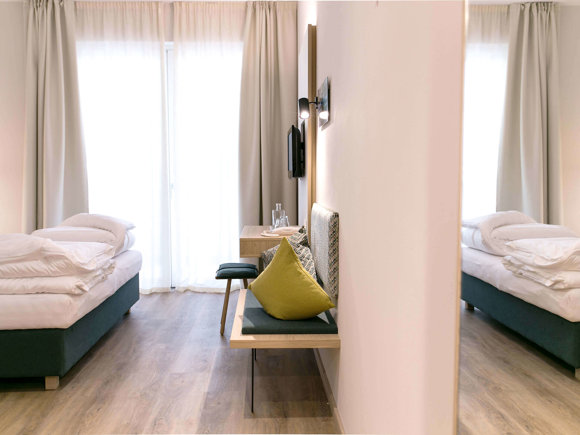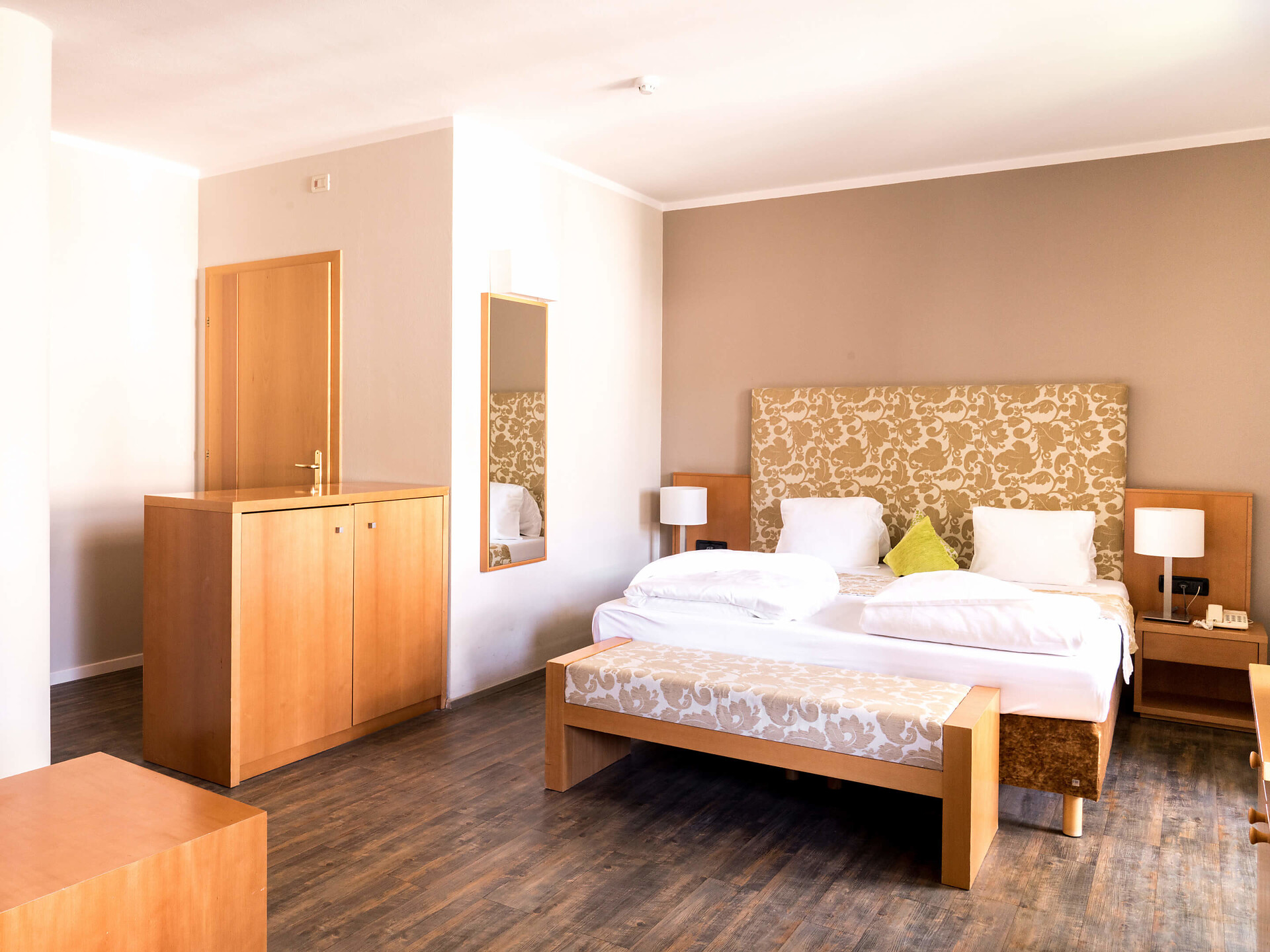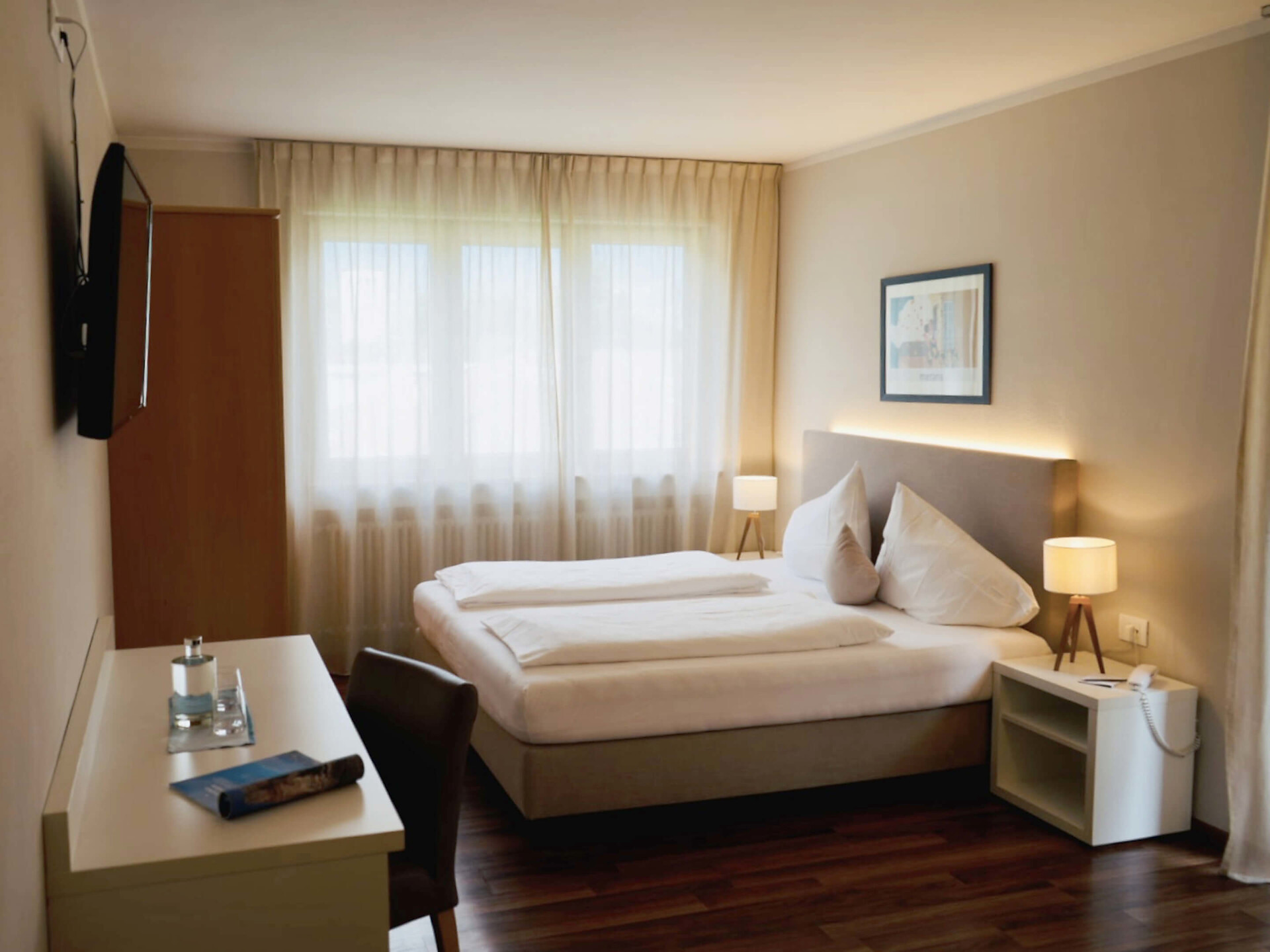 una moderna camera doppia comfort (22m²) con letto matrimoniale king-size e loggia privata, bagno (alcuni sono senza barriere) con grande doccia a pioggia, WC, specchio per il trucco e asciugacapelli, TV satellitare con schermo piatto, cassaforte per portatili, WIFI internet, telefono, frigorifero e bollitor