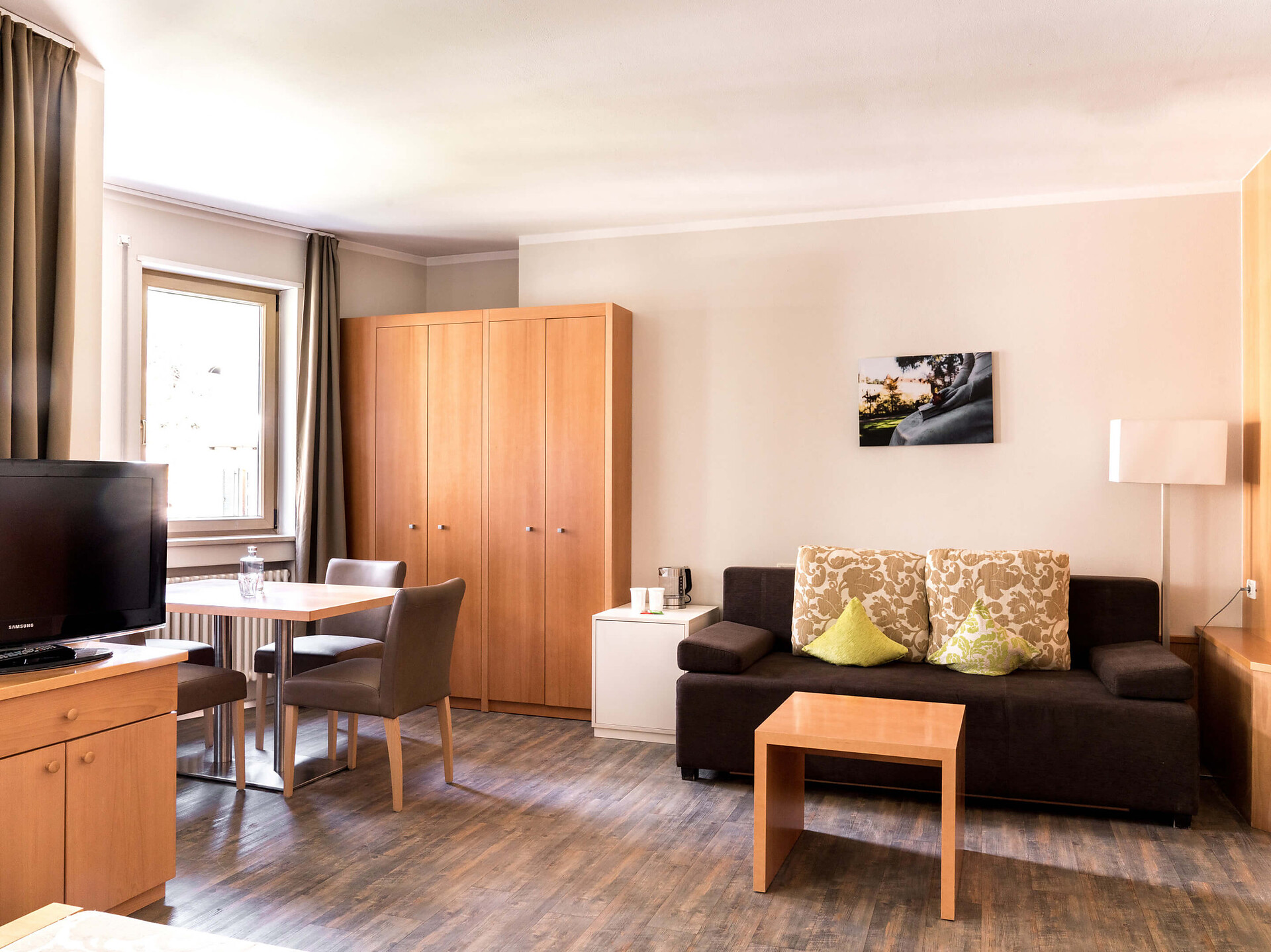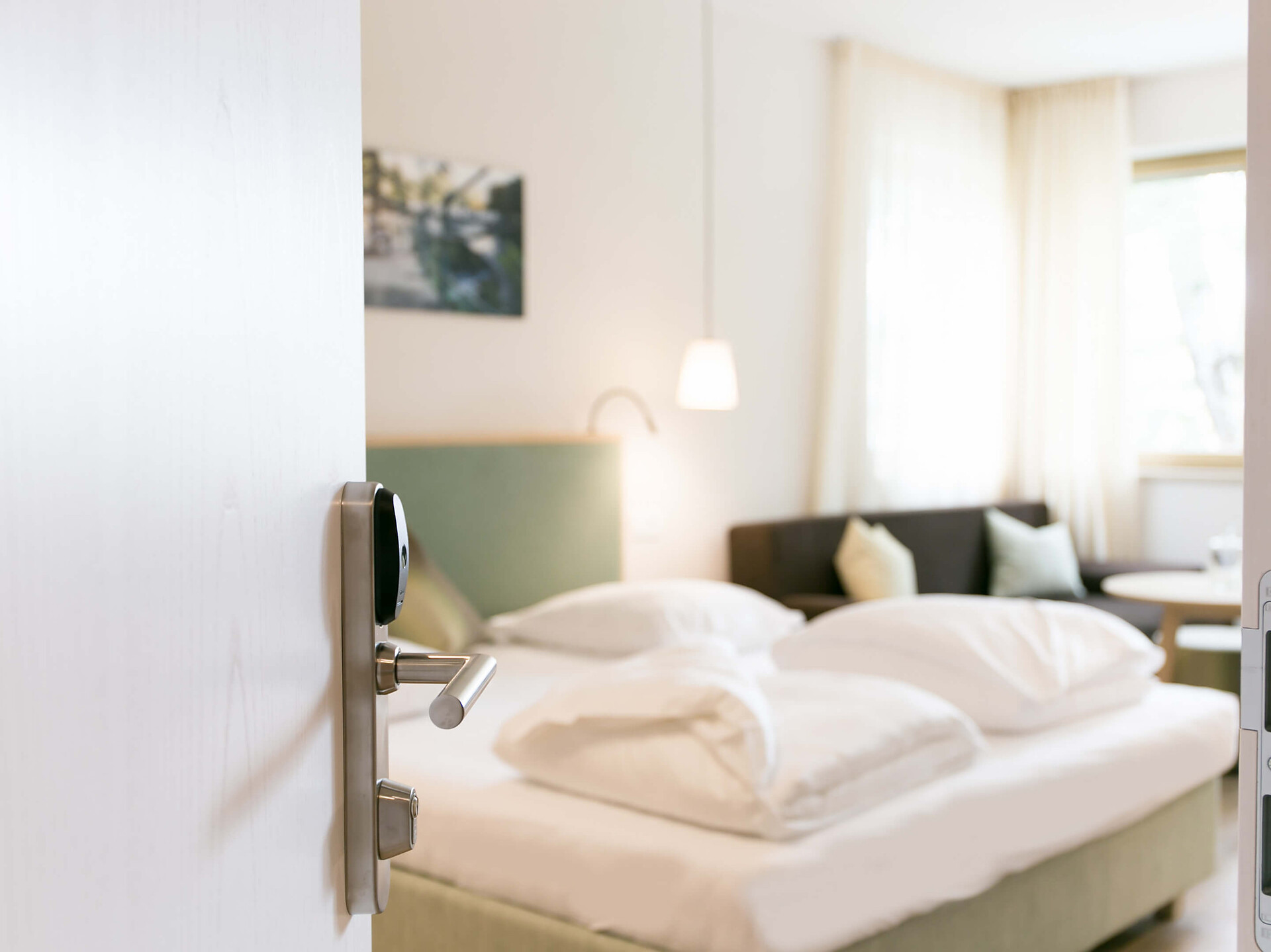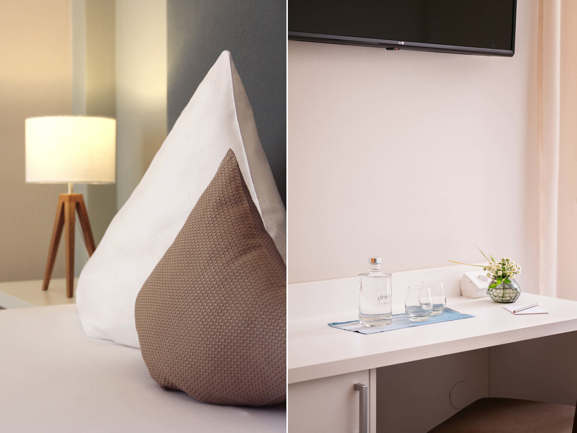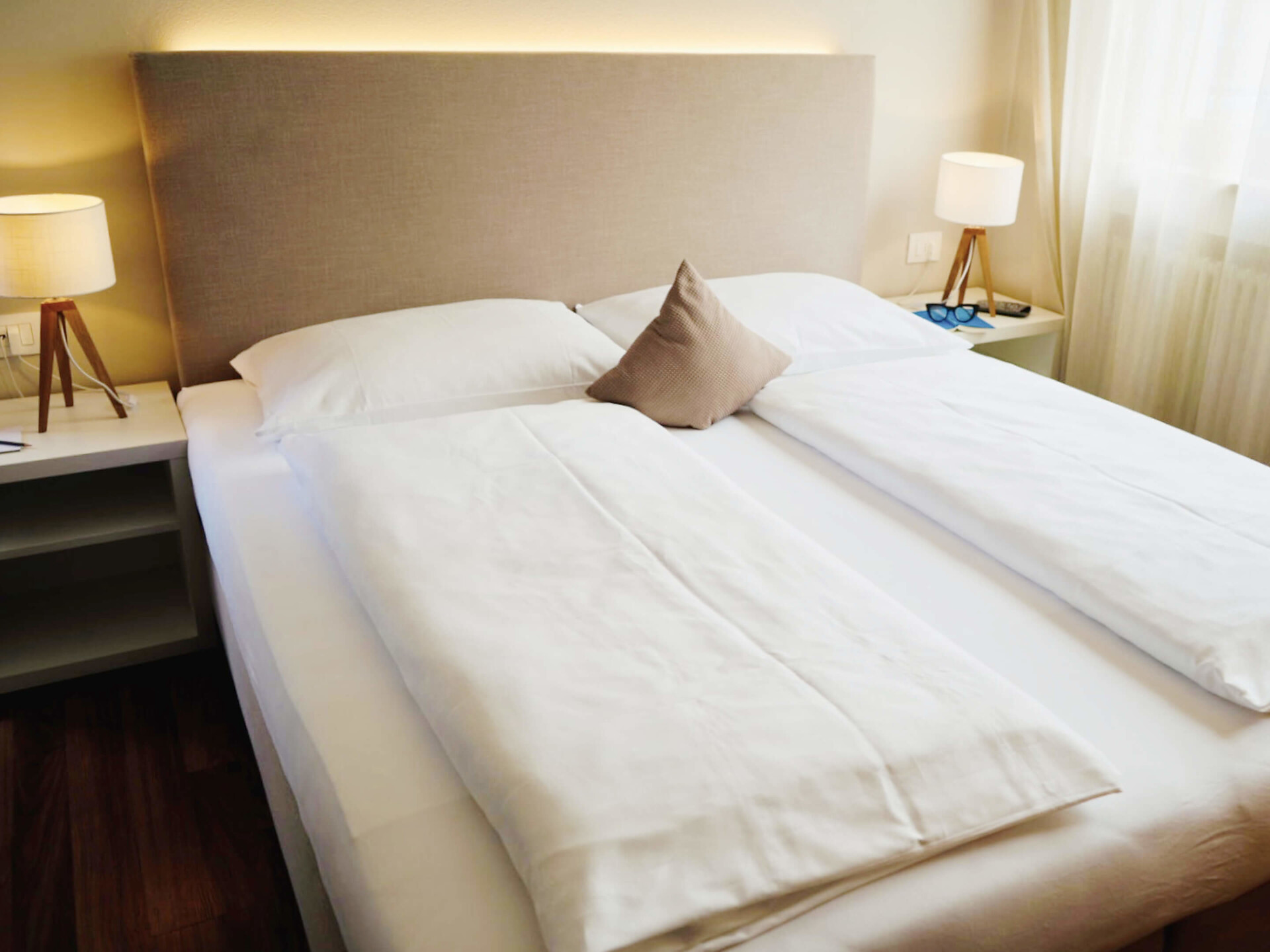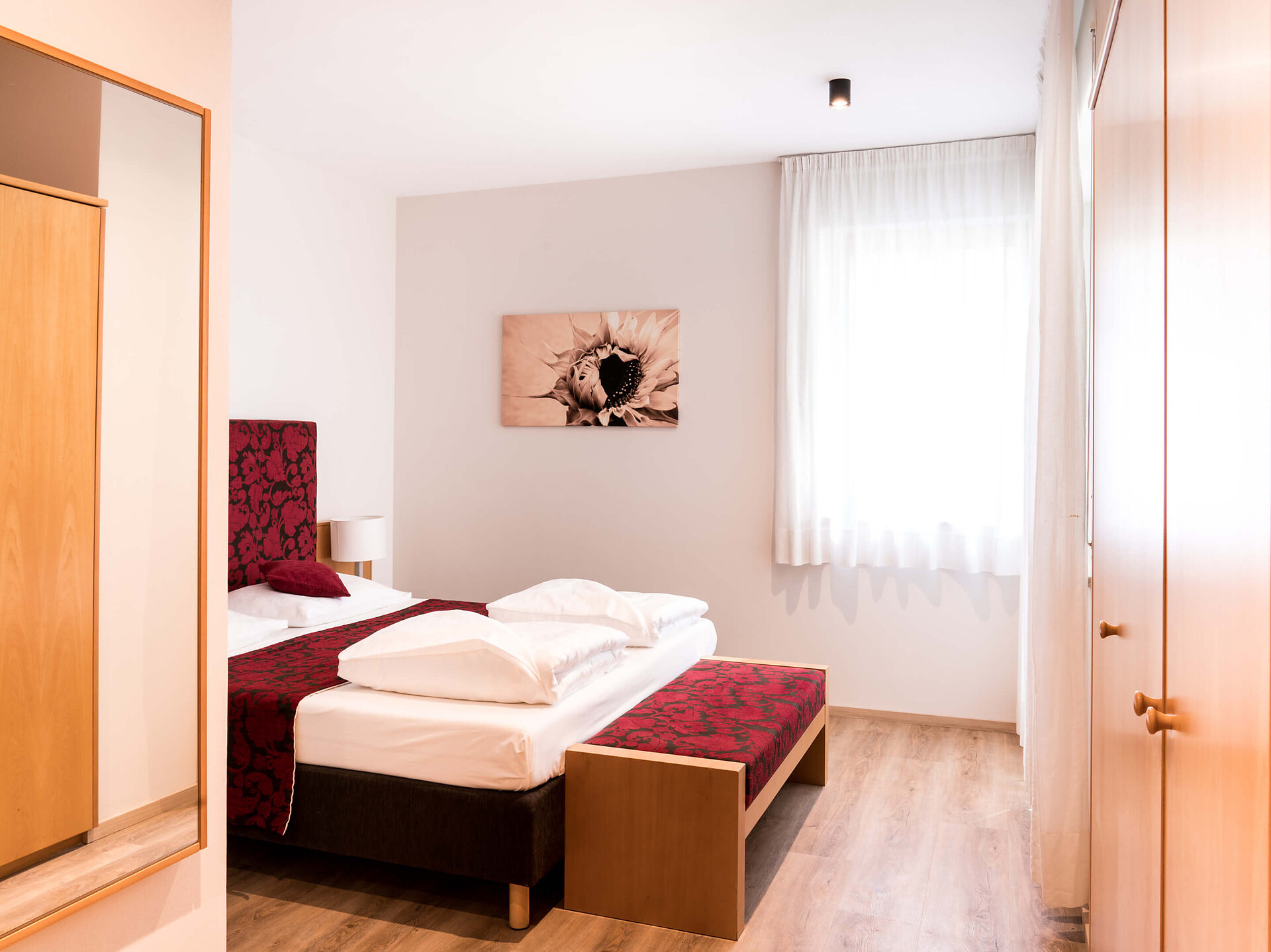 una moderna camera doppia comfort (22m²) con letto matrimoniale king-size e loggia privata, bagno (alcuni sono senza barriere) con grande doccia a pioggia, WC, specchio per il trucco e asciugacapelli, TV satellitare con schermo piatto, cassaforte per portatili, WIFI internet, telefono, frigorifero e bollitor