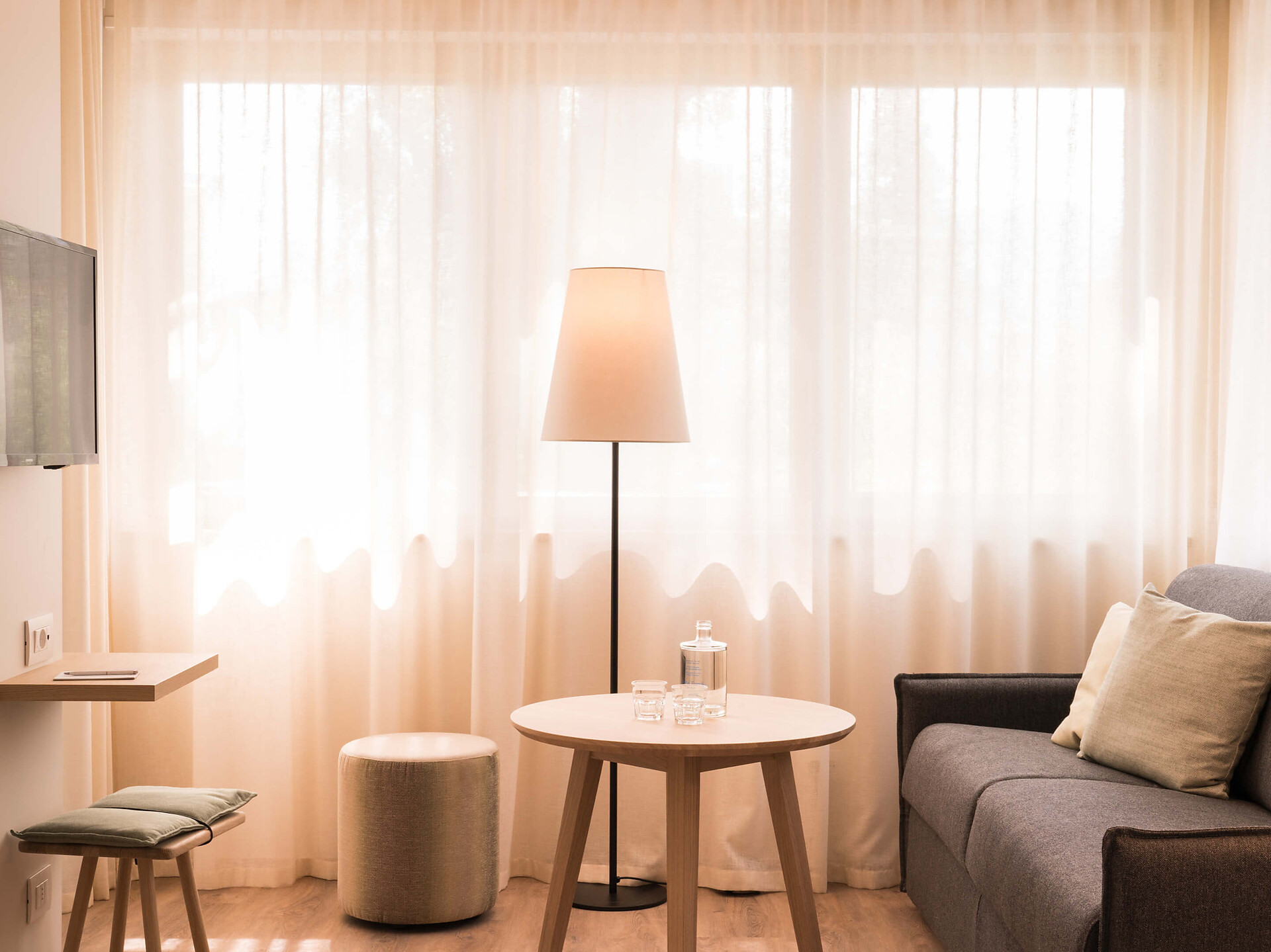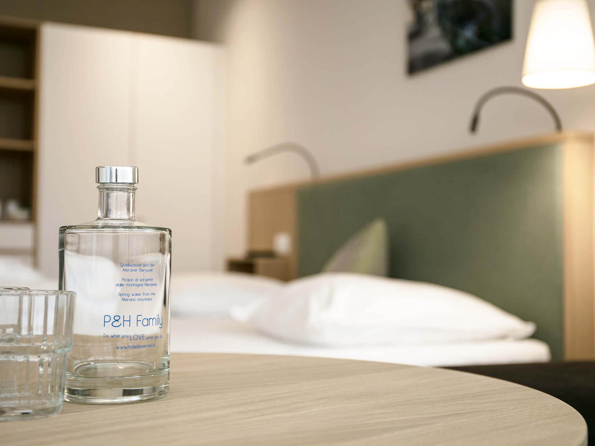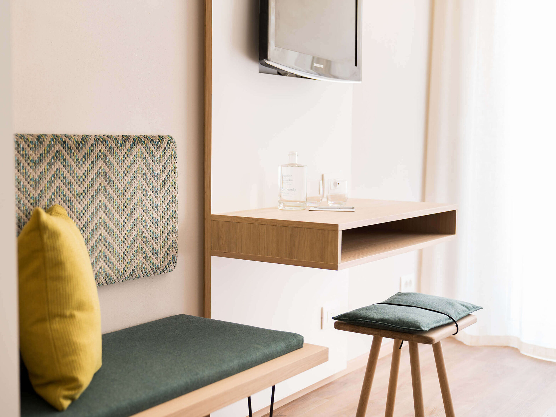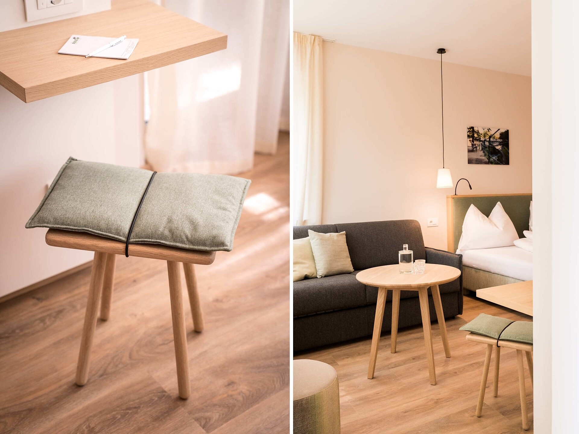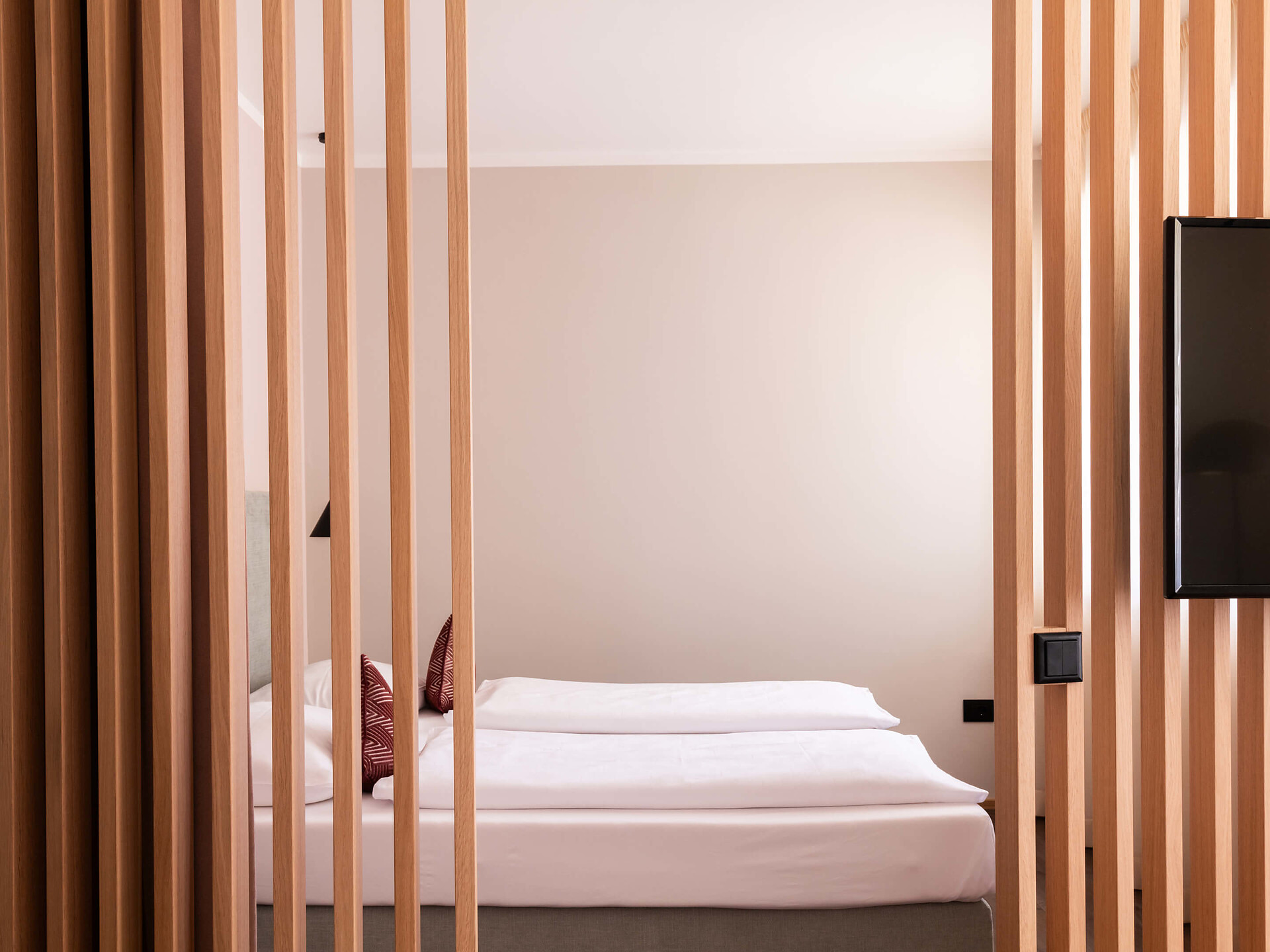 una moderna camera doppia comfort (22m²) con letto matrimoniale king-size e loggia privata, bagno (alcuni sono senza barriere) con grande doccia a pioggia, WC, specchio per il trucco e asciugacapelli, TV satellitare con schermo piatto, cassaforte per portatili, WIFI internet, telefono, frigorifero e bollitor