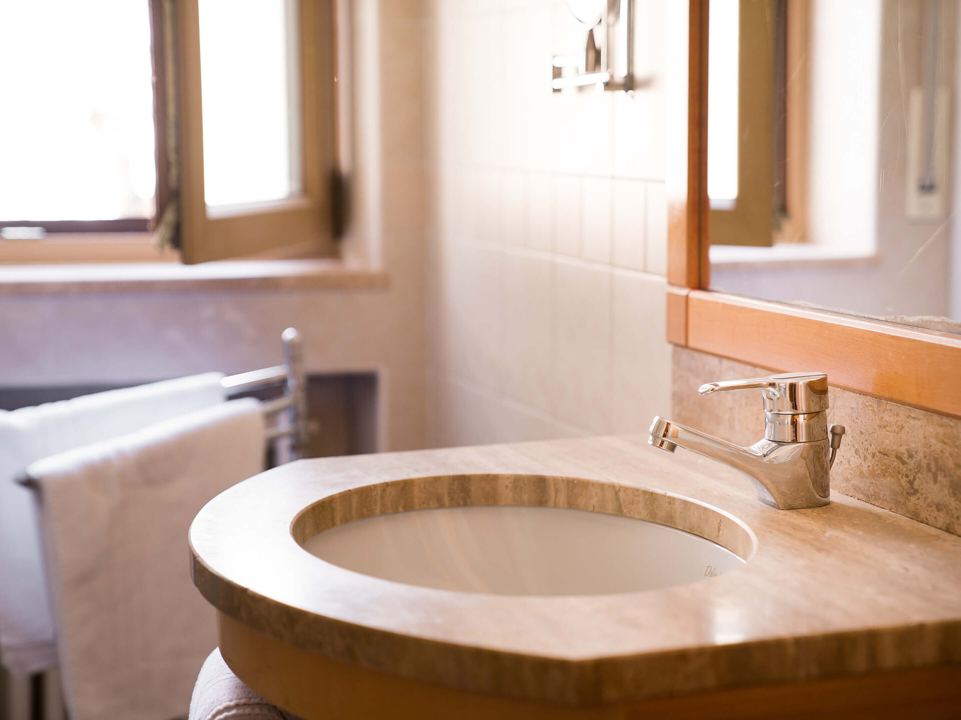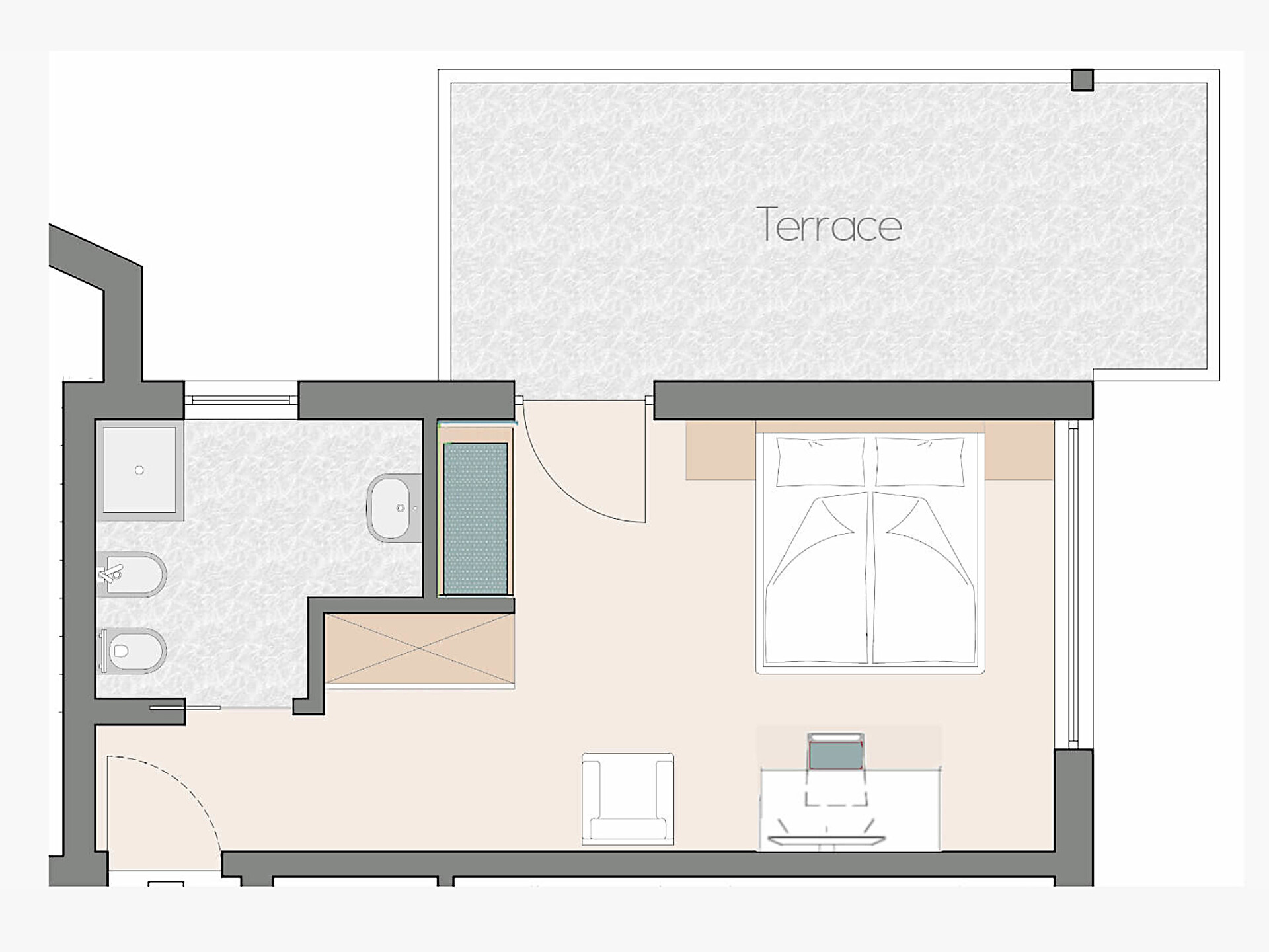 una luminosa ed elegante camera doppia superior (22 m²) al 4° piano con letto matrimoniale king-size e ampio terrazzo (15 m²) con splendida vista, bagno finestrato con doccia, wc, bidet, specchio per il trucco e asciugacapelli, TV satellitare, cassaforte per portatili, WIFI internet, telefono, frigorifero e bollitore