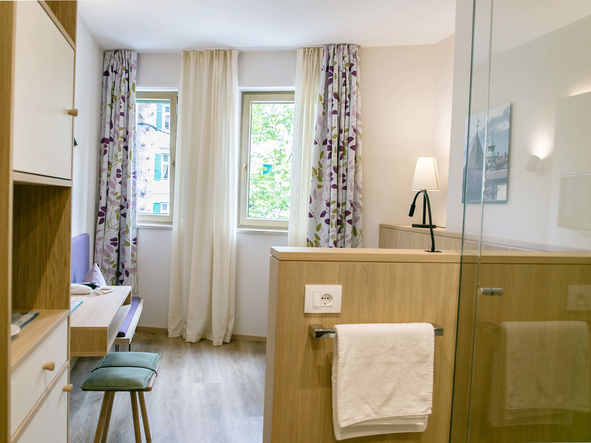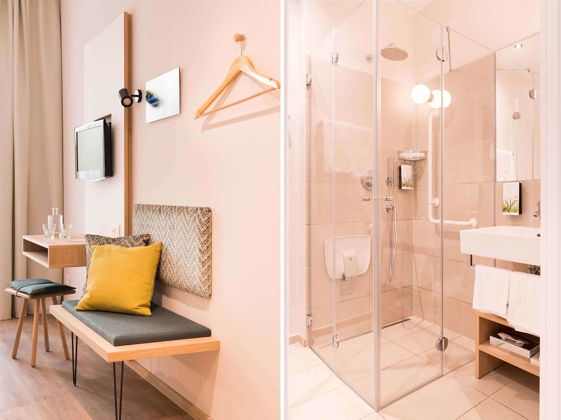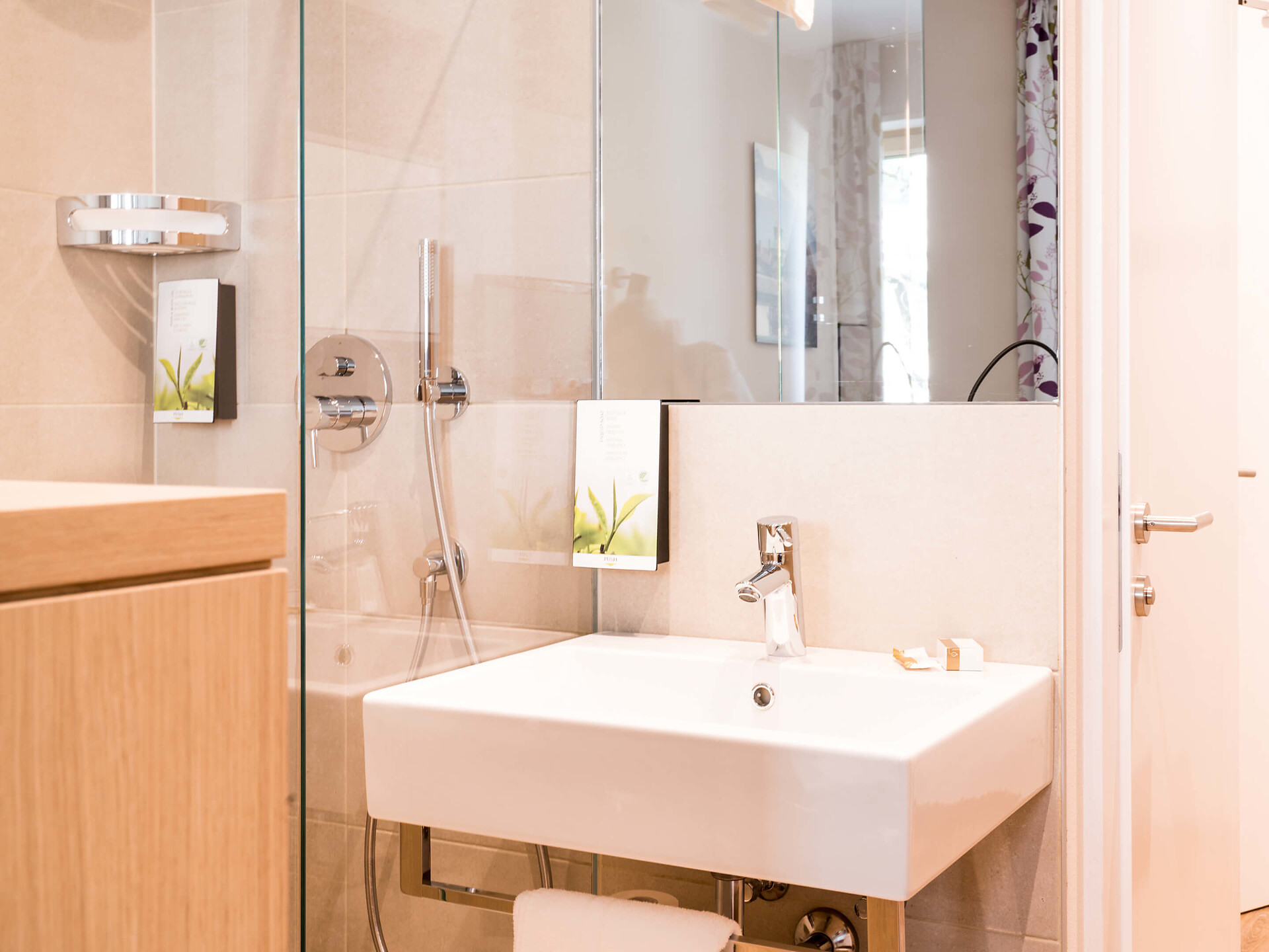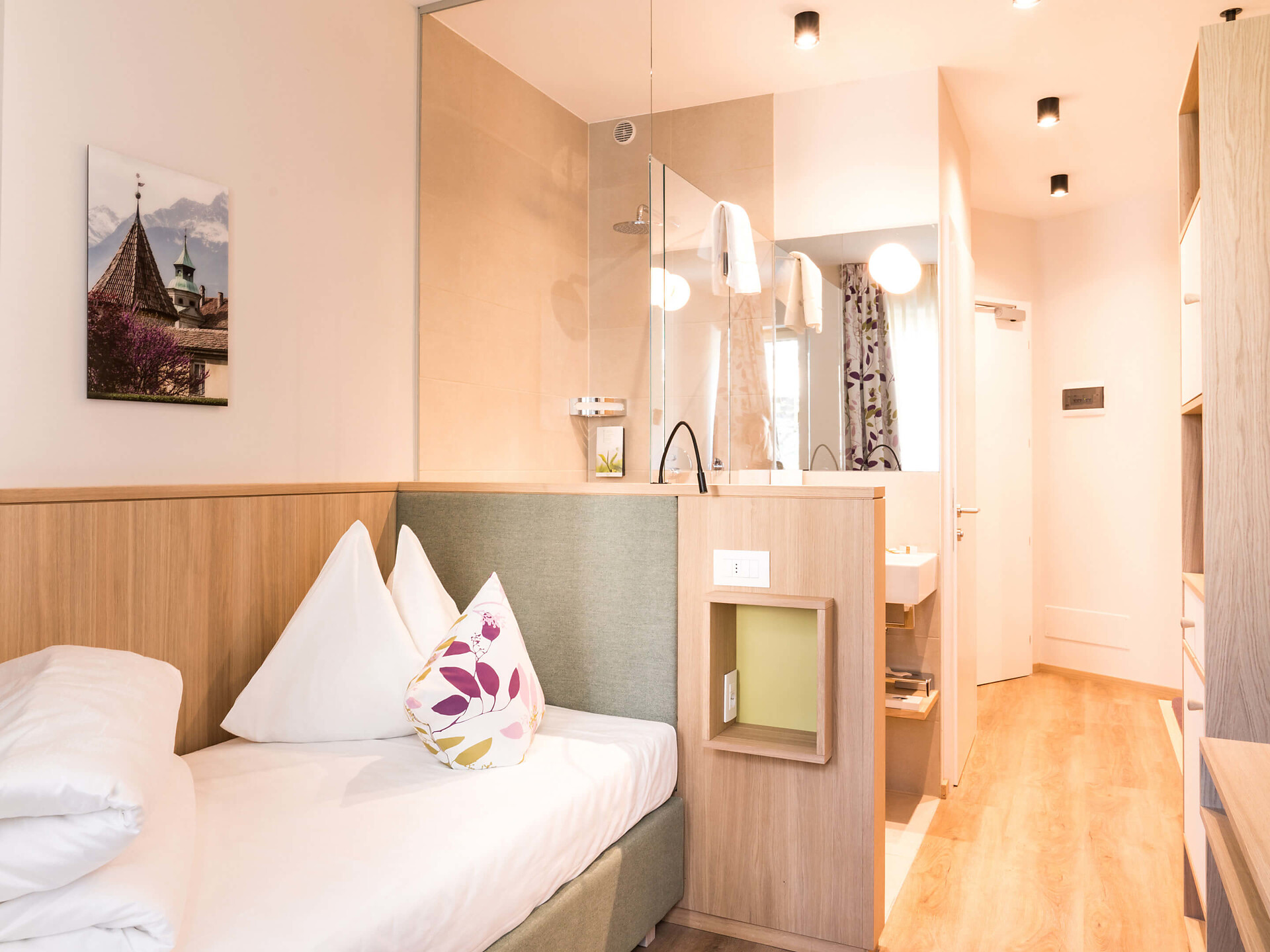 un' accogliente, moderna camera singola (15 m²) con un bagno aperto con grande doccia a pioggia, WC separato, specchio per il trucco e asciugacapelli, TV satellitare con schermo piatto, cassaforte, WIFI internet, telefono, frigorifero e bollitore