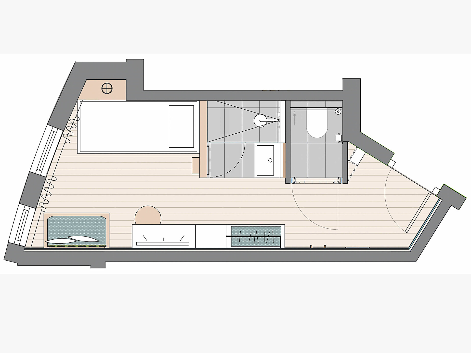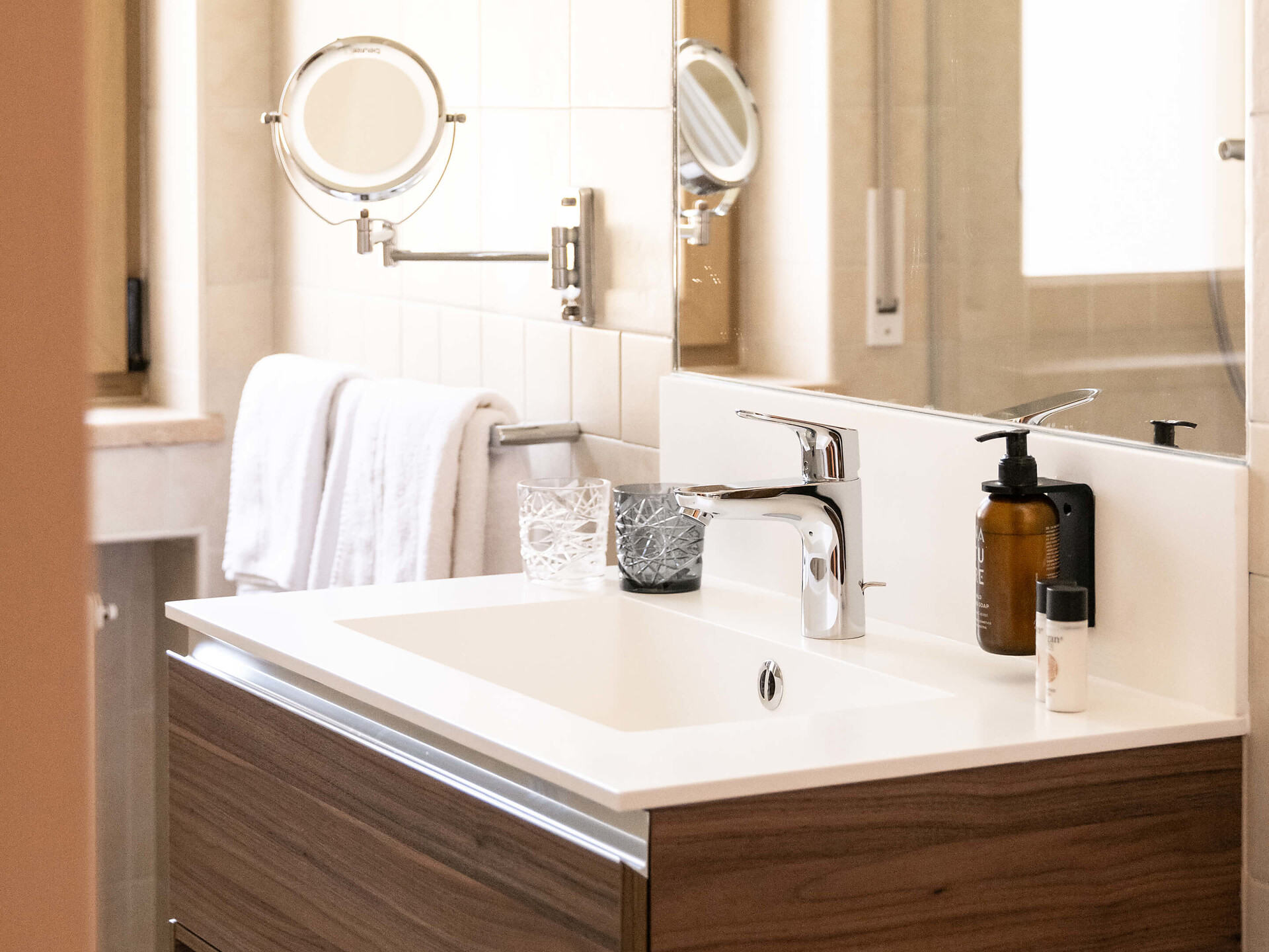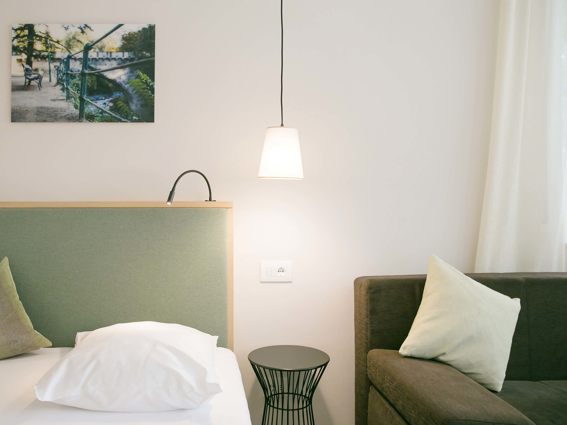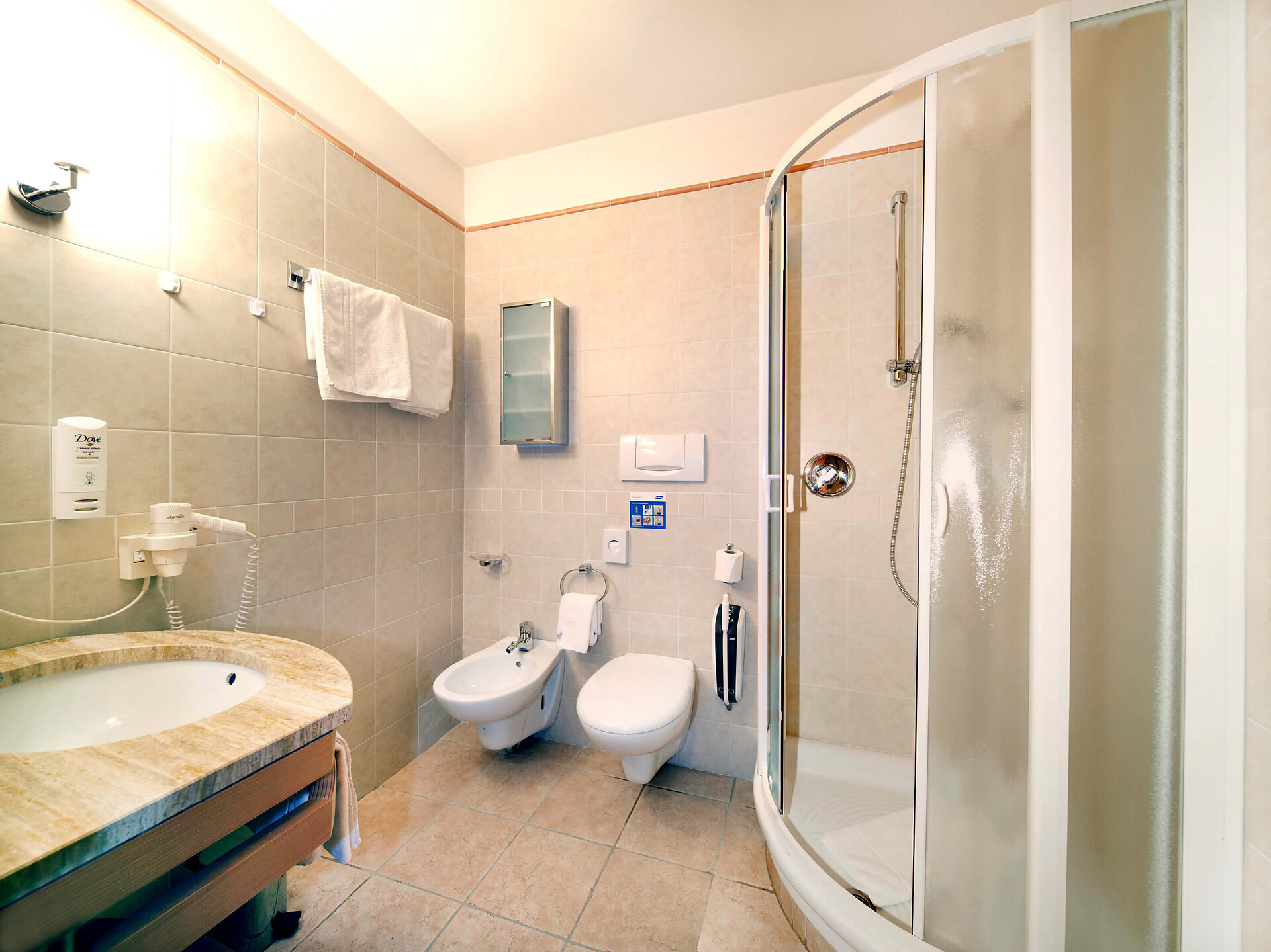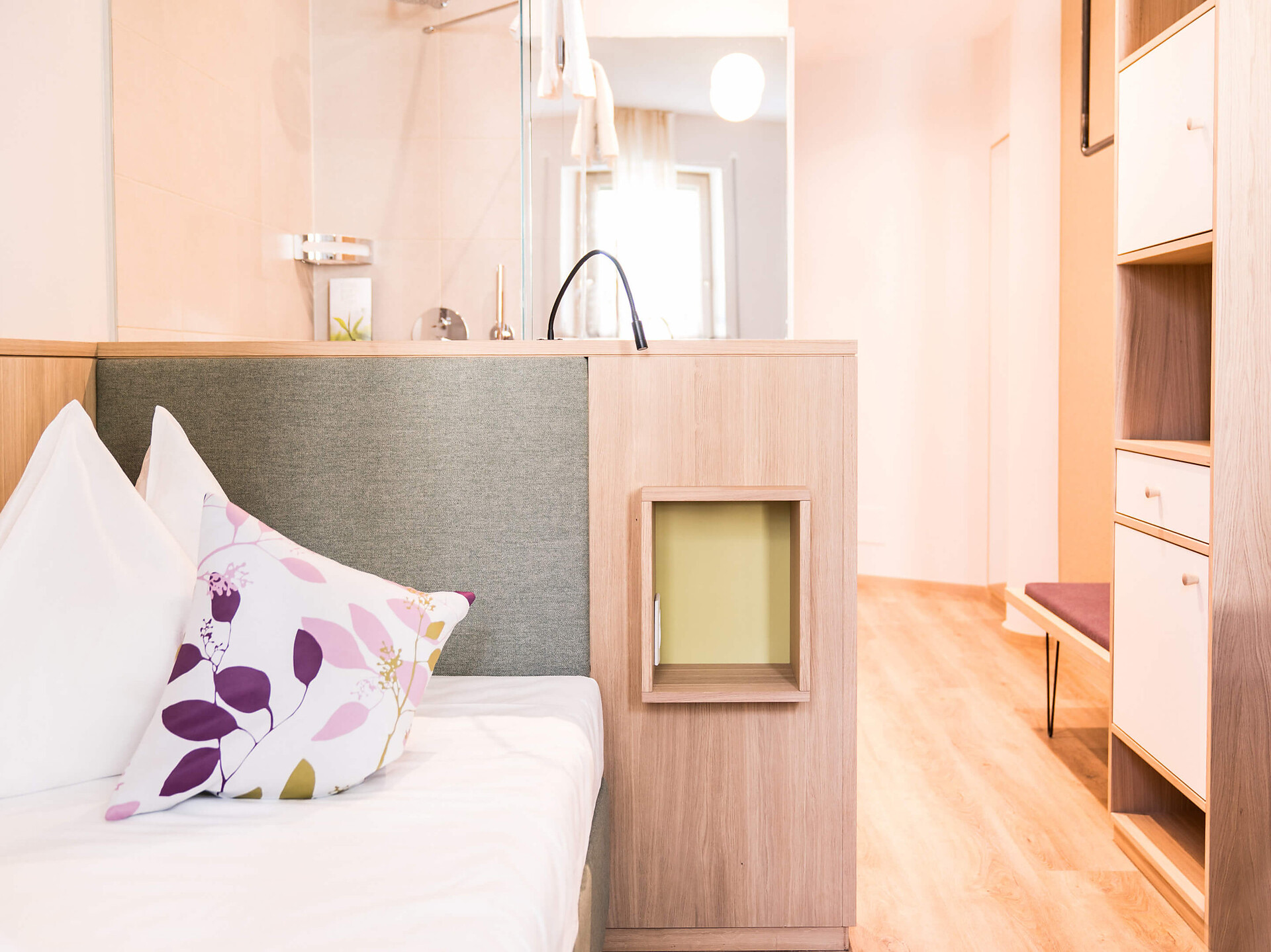 un' accogliente, moderna camera singola (15 m²) con un bagno aperto con grande doccia a pioggia, WC separato, specchio per il trucco e asciugacapelli, TV satellitare con schermo piatto, cassaforte, WIFI internet, telefono, frigorifero e bollitore