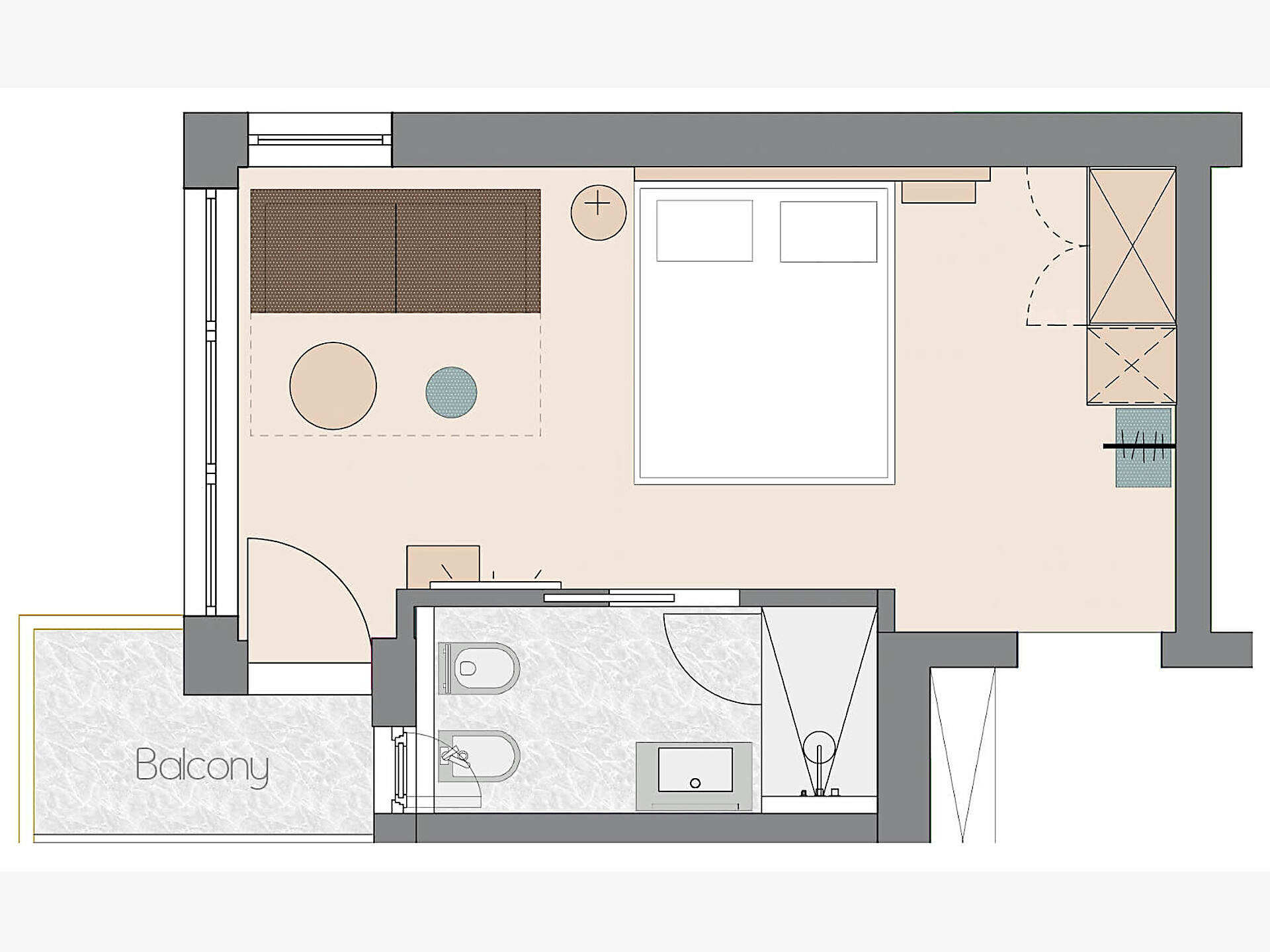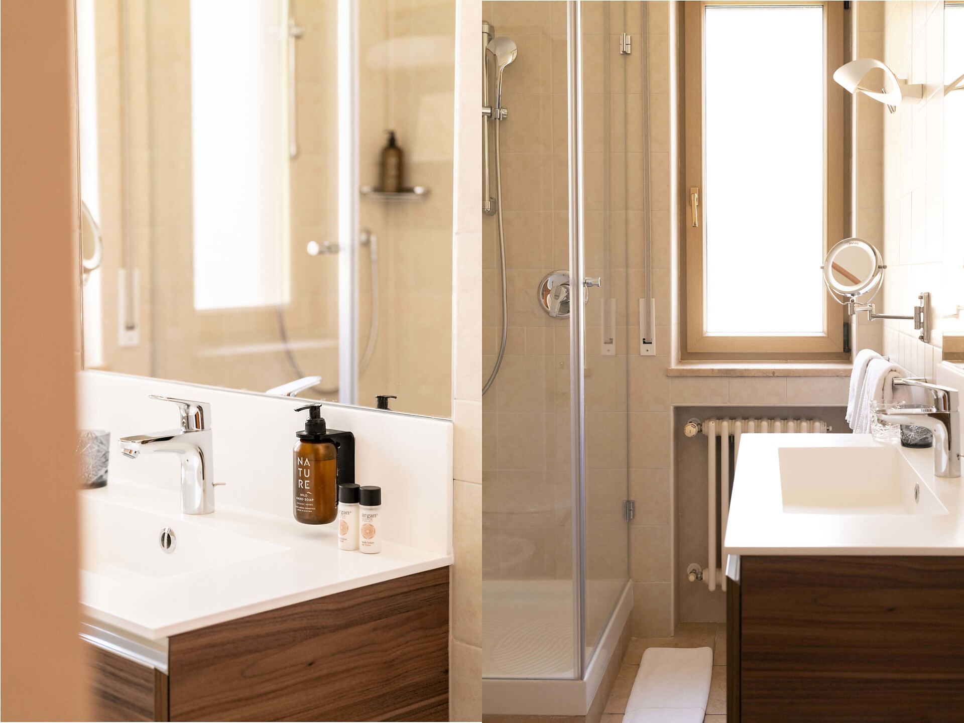 una moderna e luminosa camera doppia superior (25 m²) con letto matrimoniale king-size e divano letto matrimoniale, piccola loggia esposta a sud, bagno finestrato con grande doccia a pioggia, WC, bidet, specchio per il trucco e asciugacapelli, TV satellitare con schermo piatto, cassaforte per portatili, WIFI internet, telefono, frigorifero e bollitore