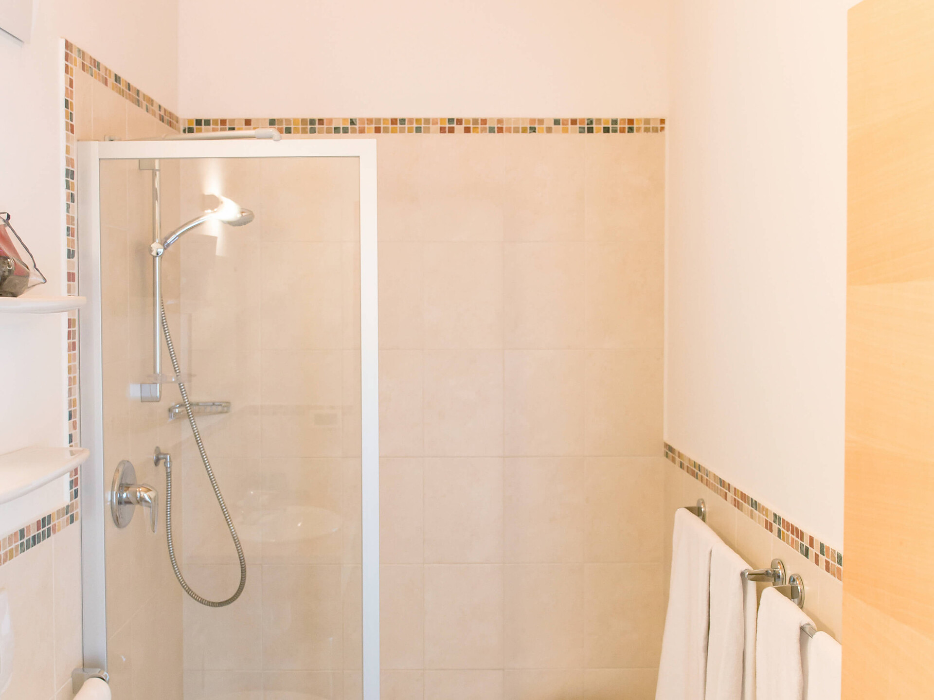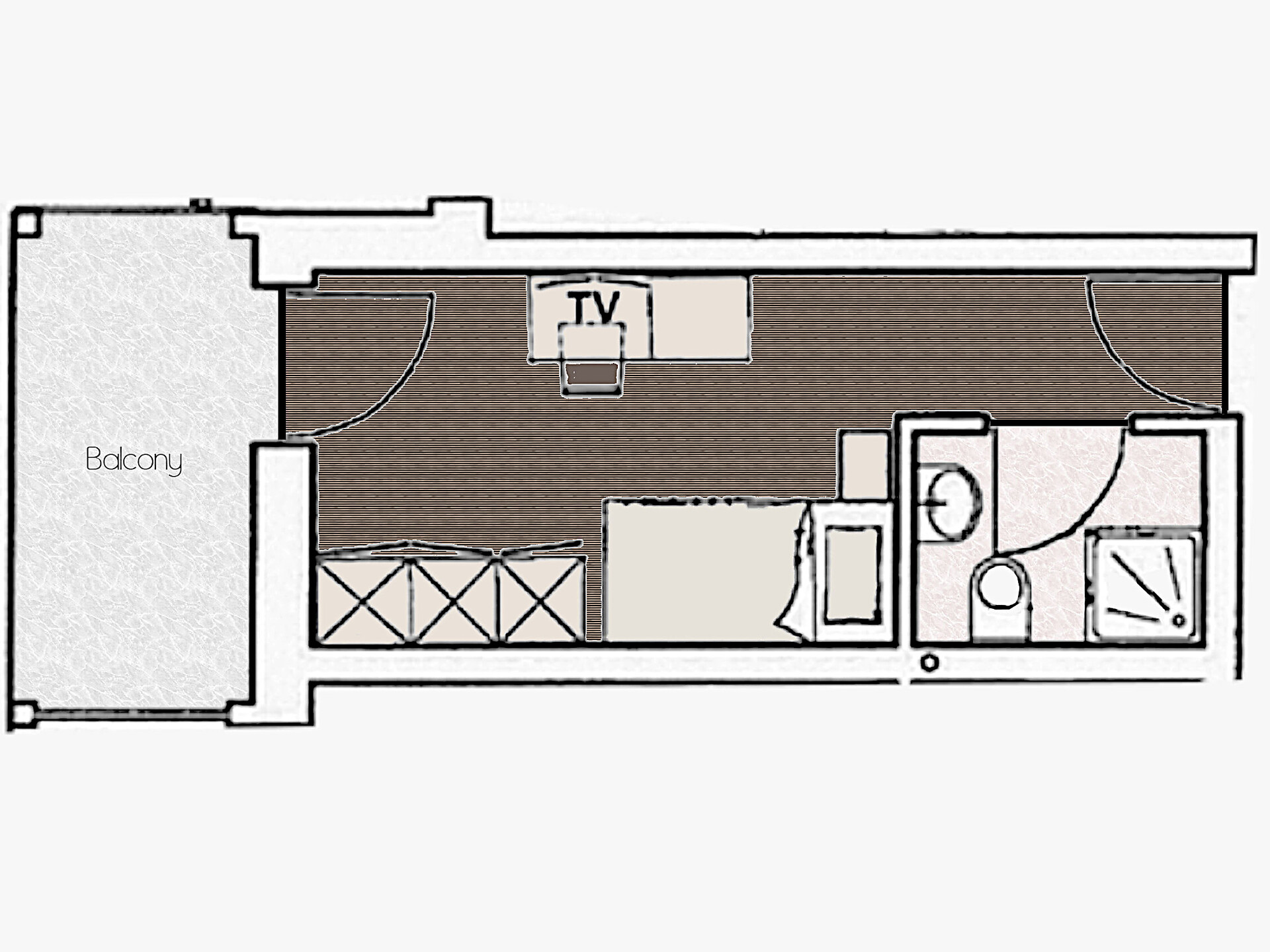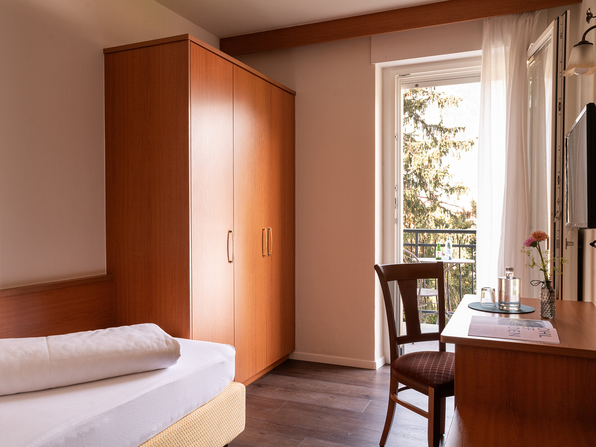 un' accogliente camera singola (15 m²) con grande balcone. Dotato di: letto singolo, bagno privato con grande doccia a filo pavimento, WC e asciugacapelli, scrivania, TV satellitare con schermo piatto, WIFI internet, telefono e tapparelle