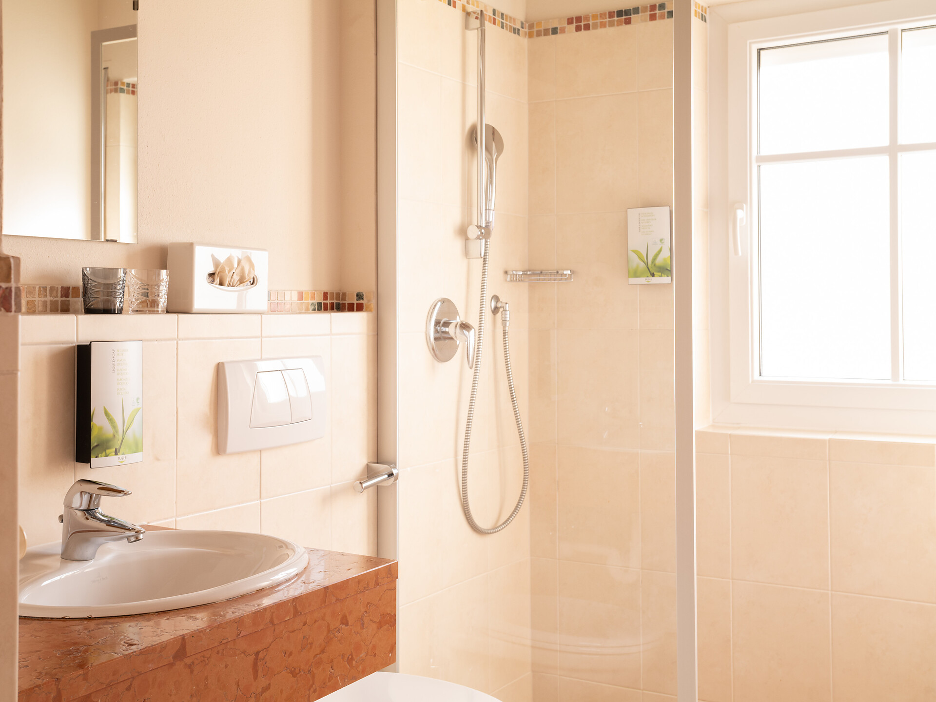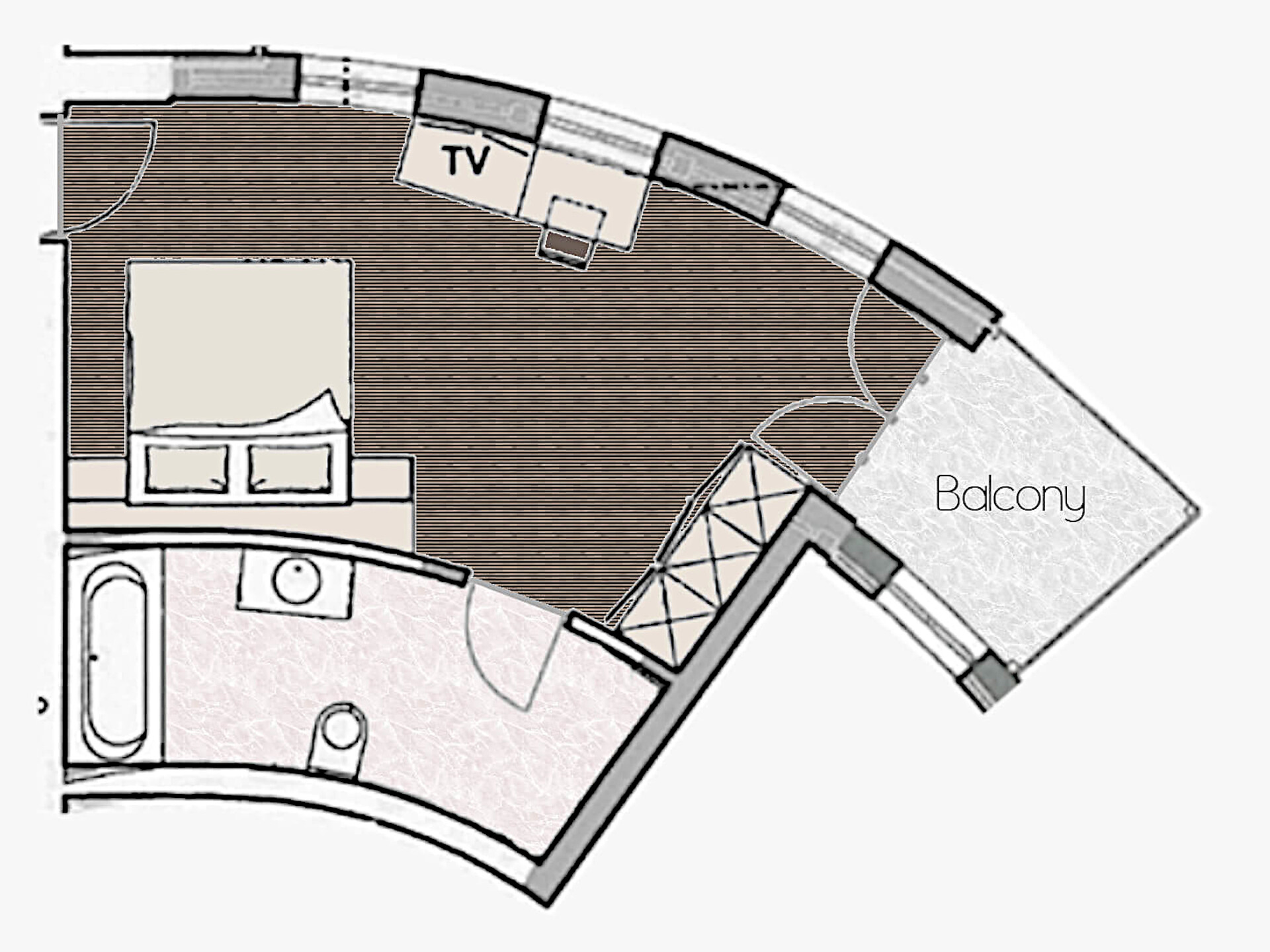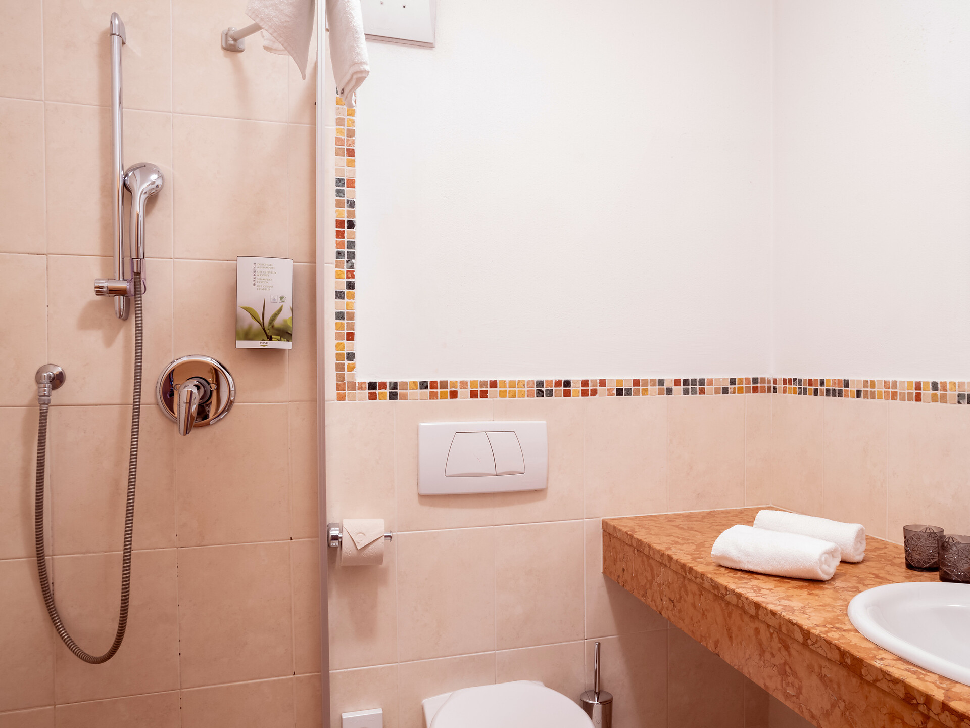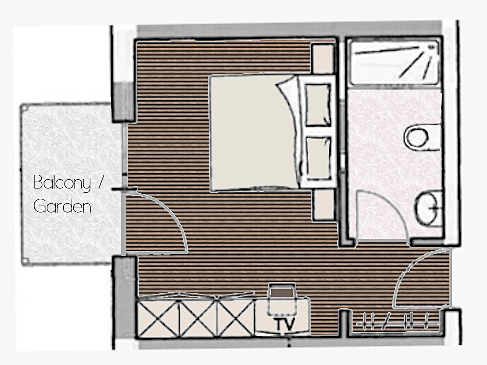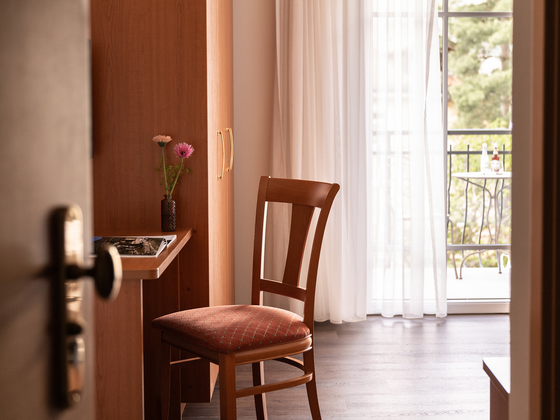 una soleggiata e spaziosa camera doppia comfort (25 m²) con ampio balcone o terrazza. Dotato di: letto king size, bagno privato, gran parte con grande doccia a filo pavimento, WC e asciugacapelli, scrivania, TV satellitare con schermo piatto, internet WIFI, telefono e tapparelle