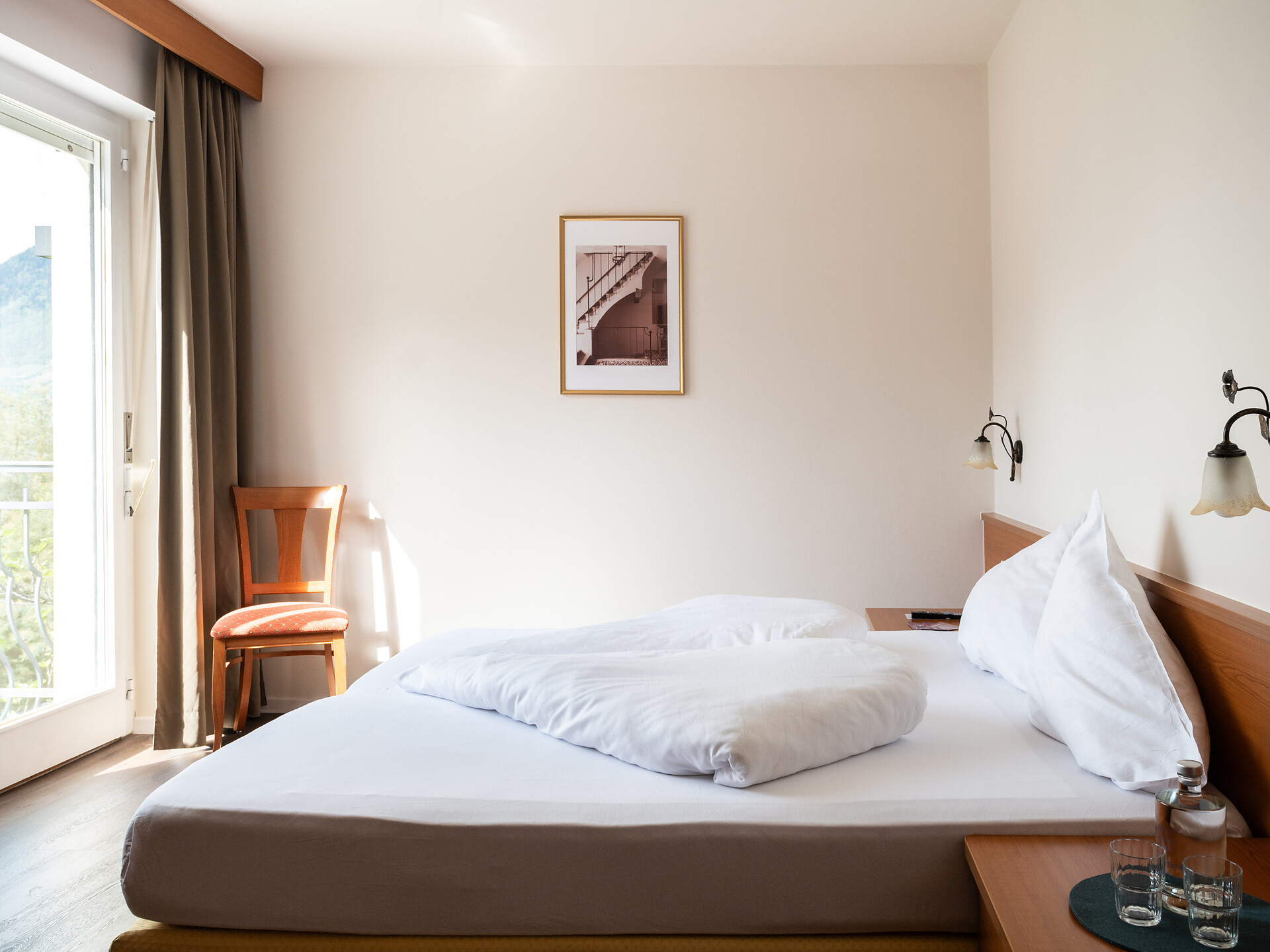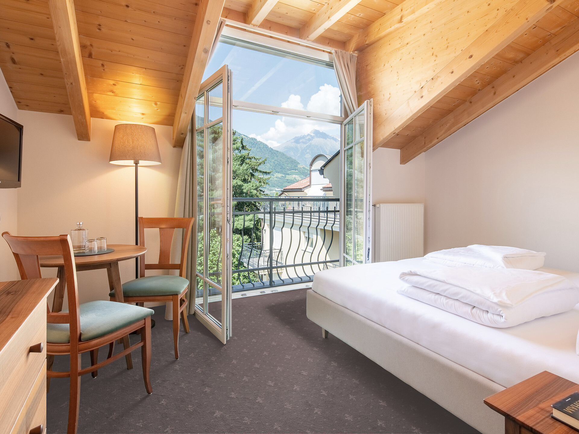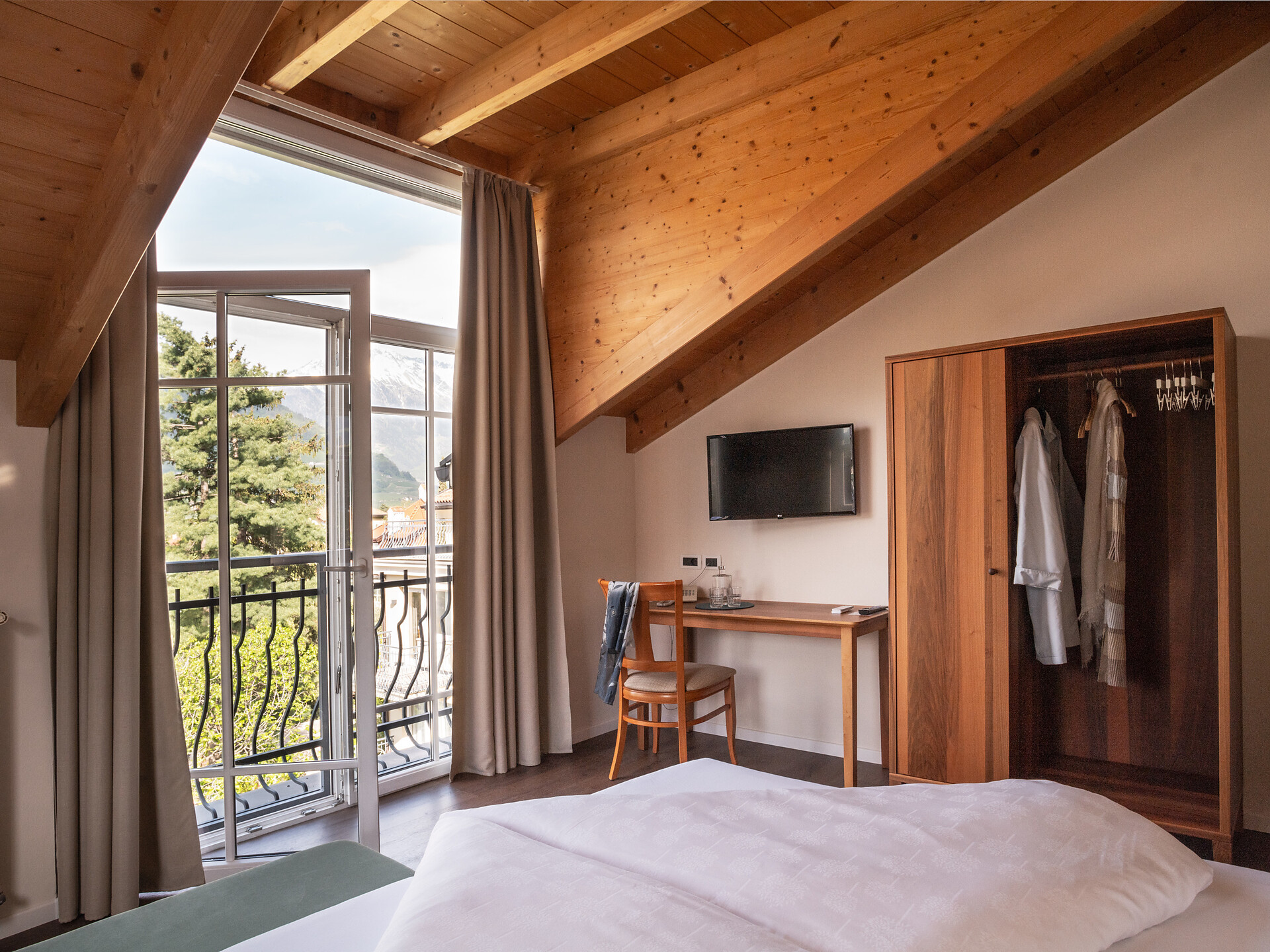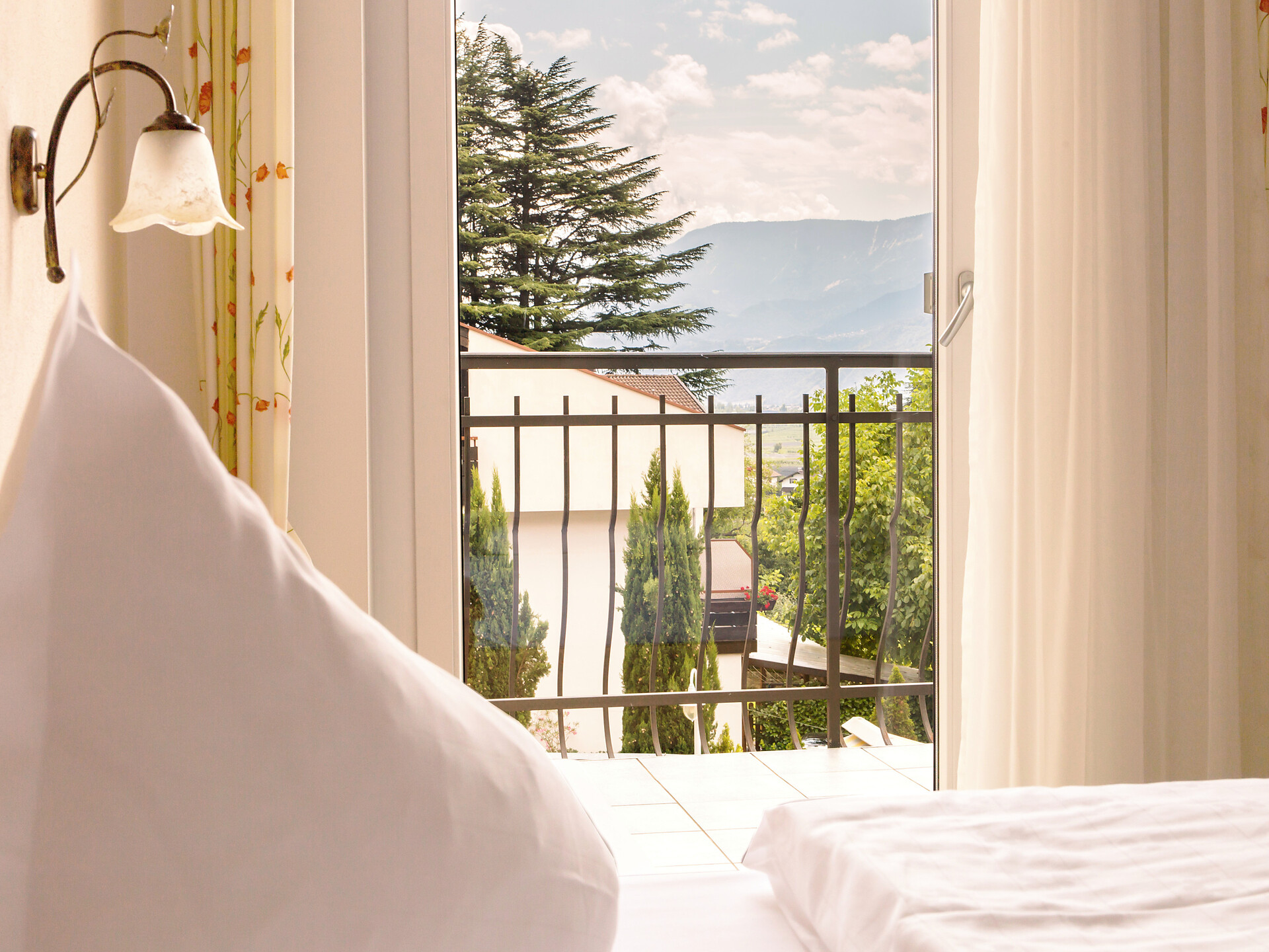 un'accogliente, luminosa camera doppia panoramica al 3° piano (20 - 22 m²) con grande finestre panoramiche per un meraviglioso panorama su Merano. Dotato di: letto matrimoniale king-size, bagno privato con grande doccia a filo pavimento, wc e asciugacapelli, scrivania, TV satellitare con schermo piatto, WIFI internet, telefono e tende oscuranti