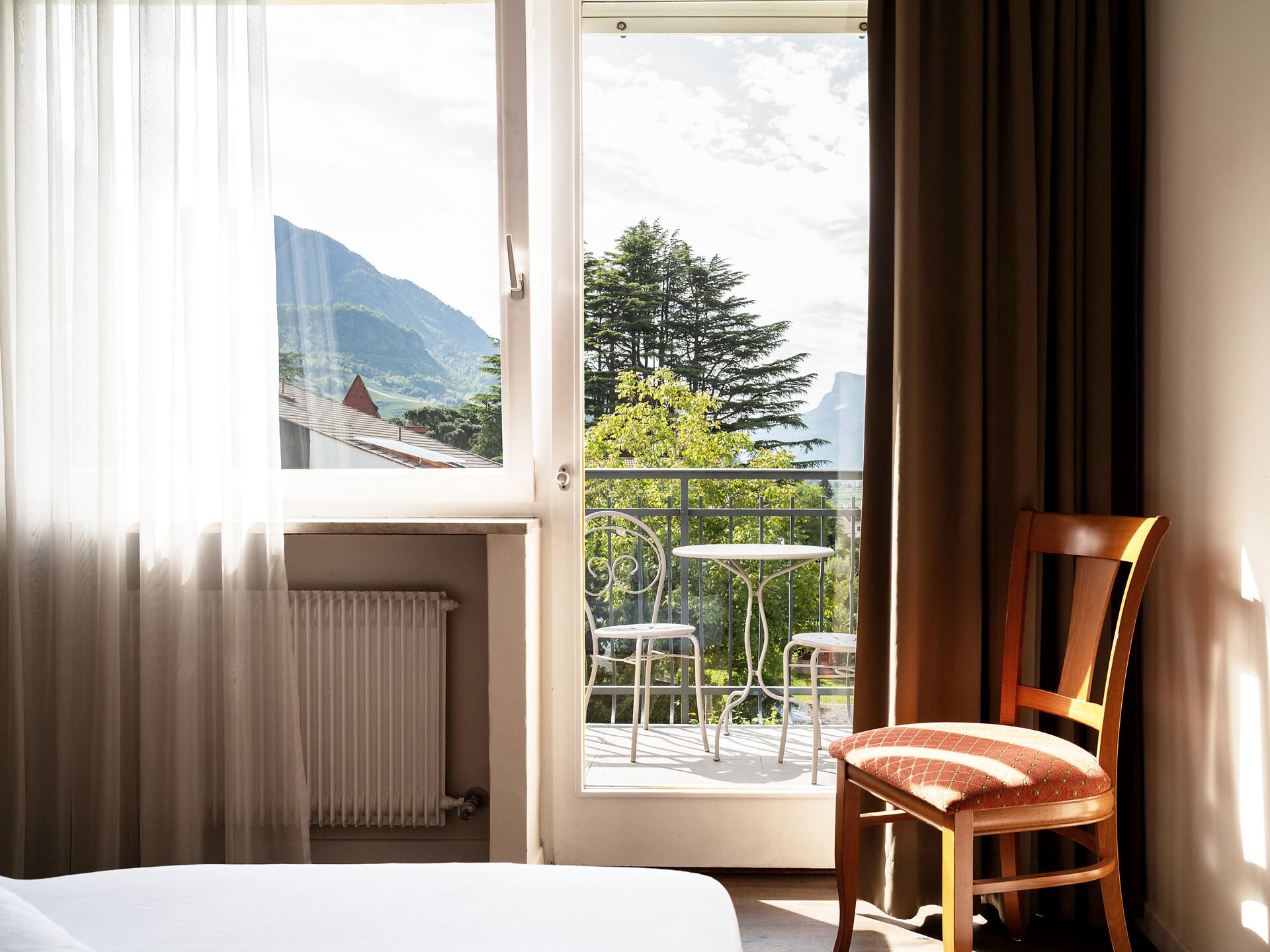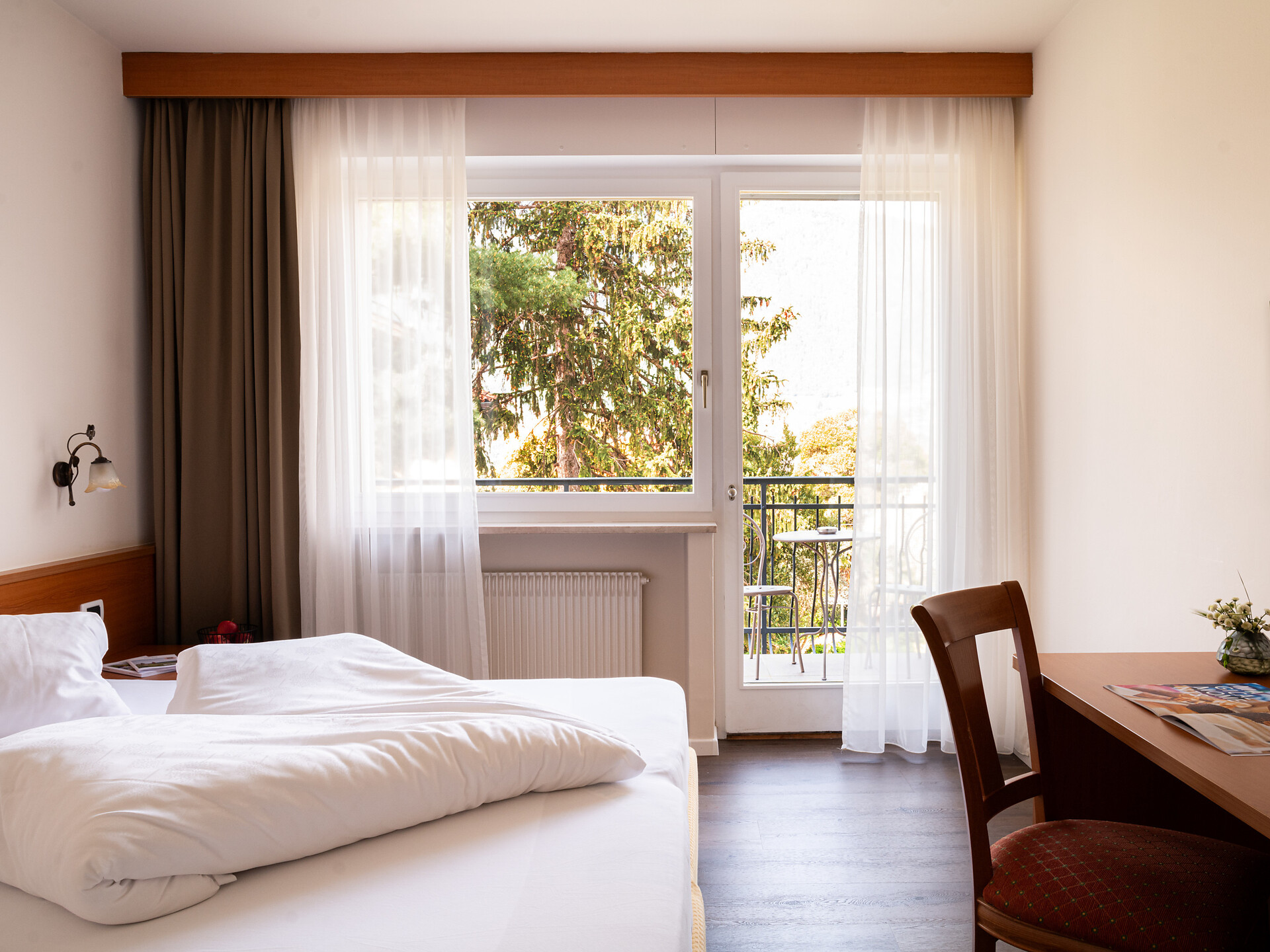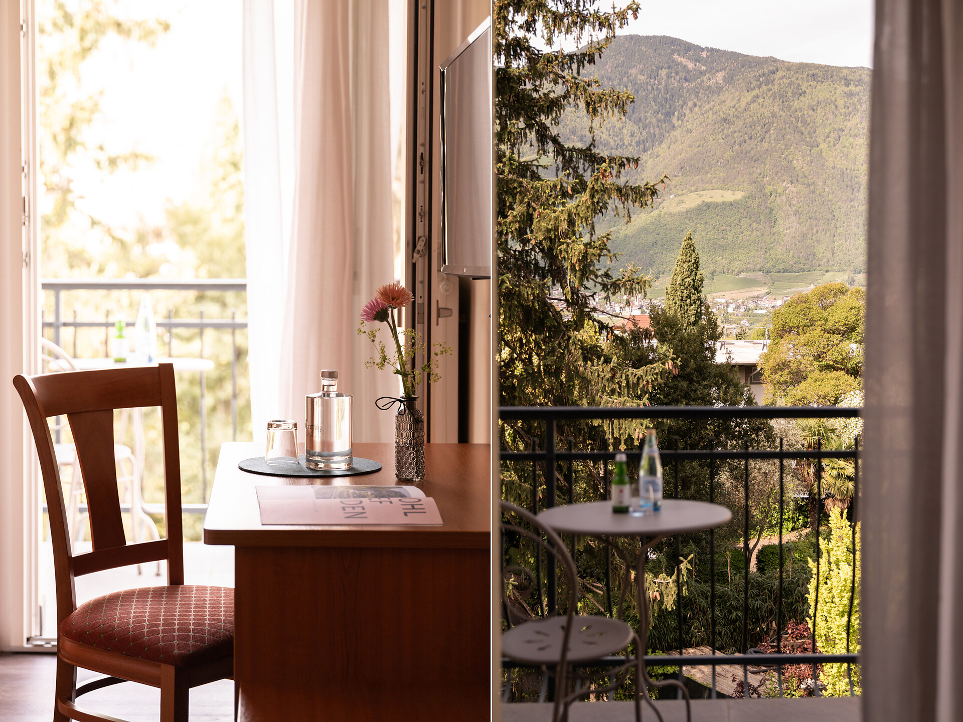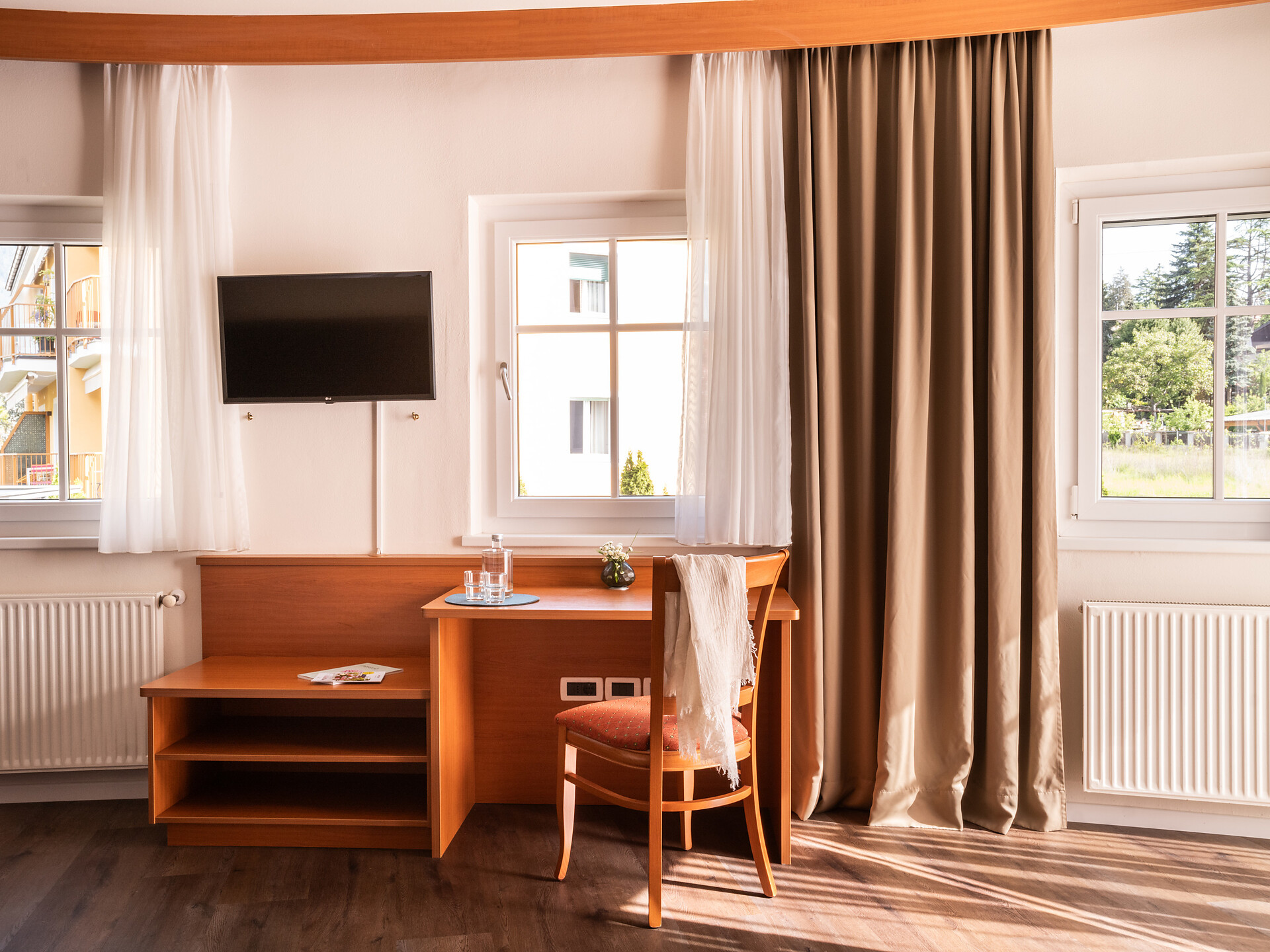 un'accogliente, luminosa camera doppia panoramica al 3° piano (20 - 22 m²) con grande finestre panoramiche per un meraviglioso panorama su Merano. Dotato di: letto matrimoniale king-size, bagno privato con grande doccia a filo pavimento, wc e asciugacapelli, scrivania, TV satellitare con schermo piatto, WIFI internet, telefono e tende oscuranti