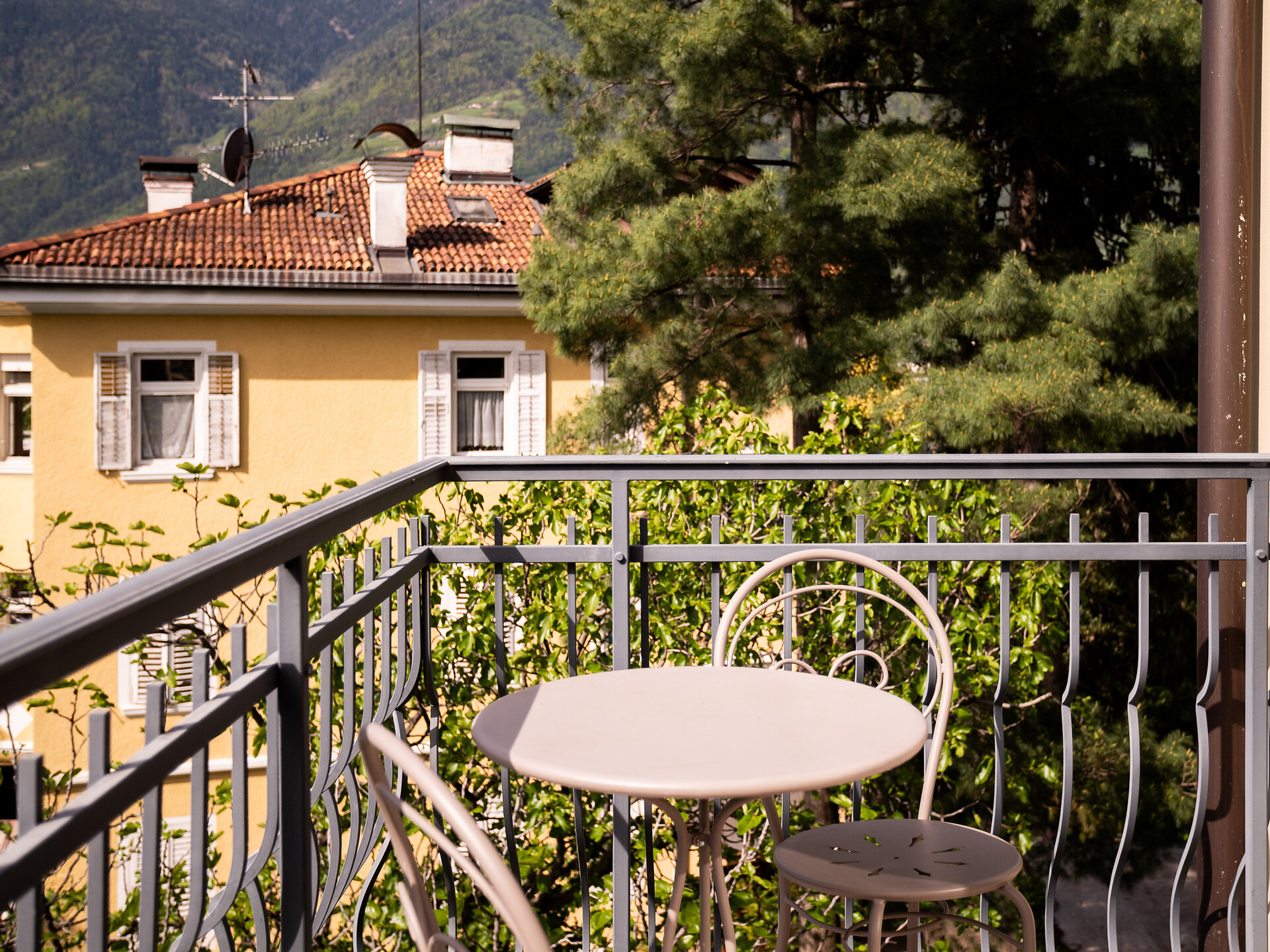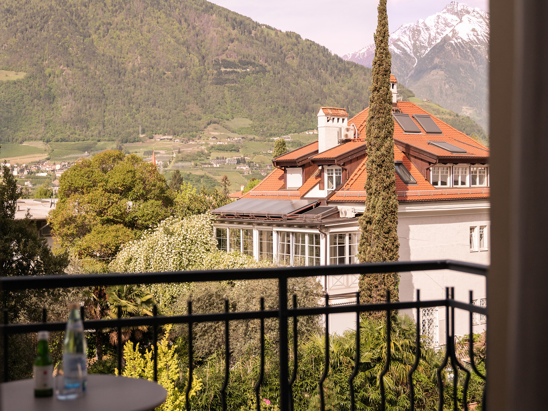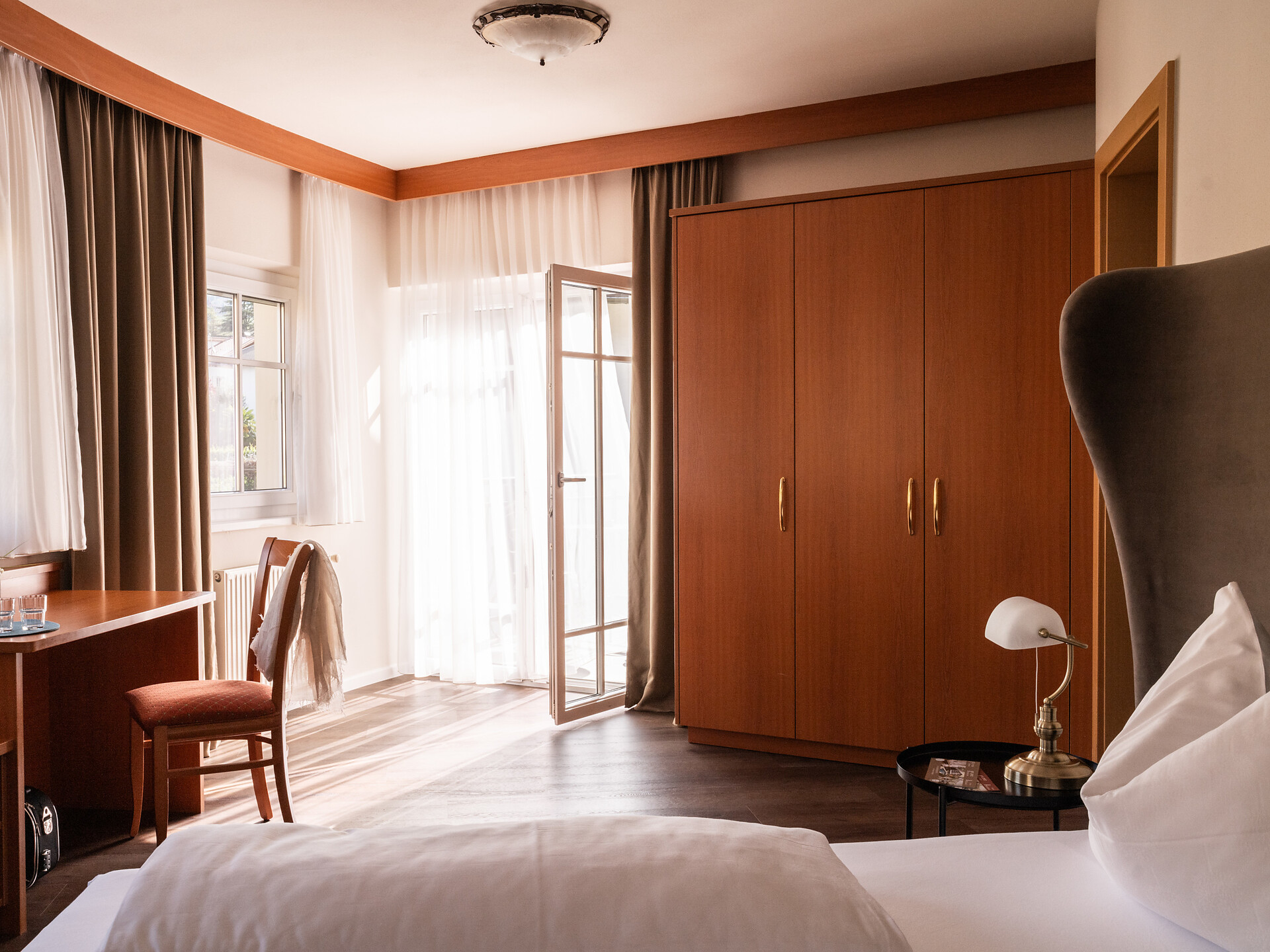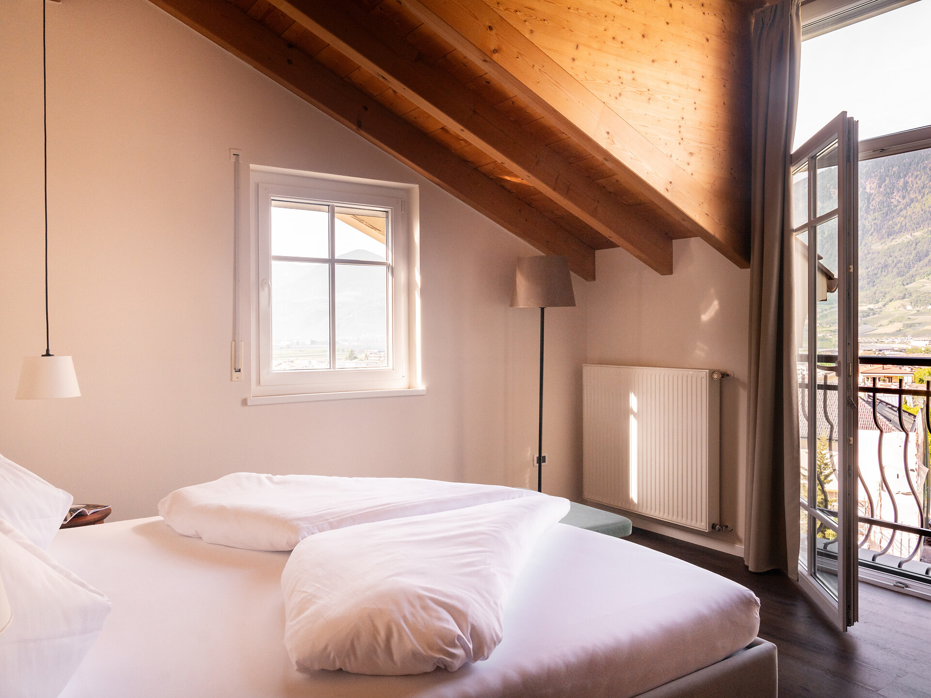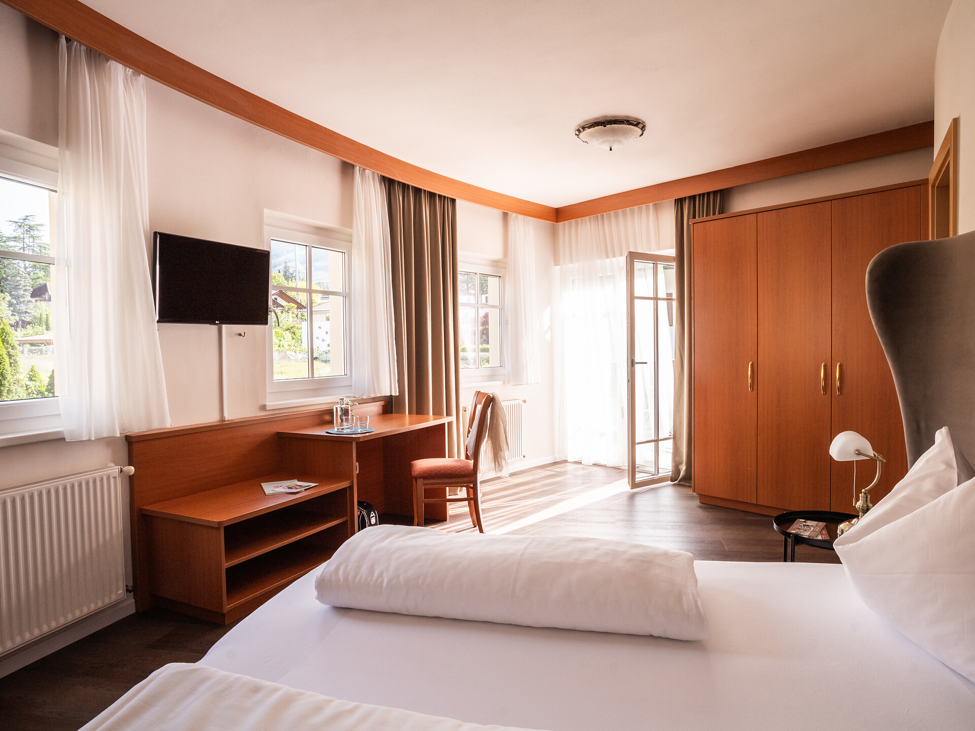un'accogliente, luminosa camera doppia panoramica al 3° piano (20 - 22 m²) con grande finestre panoramiche per un meraviglioso panorama su Merano. Dotato di: letto matrimoniale king-size, bagno privato con grande doccia a filo pavimento, wc e asciugacapelli, scrivania, TV satellitare con schermo piatto, WIFI internet, telefono e tende oscuranti