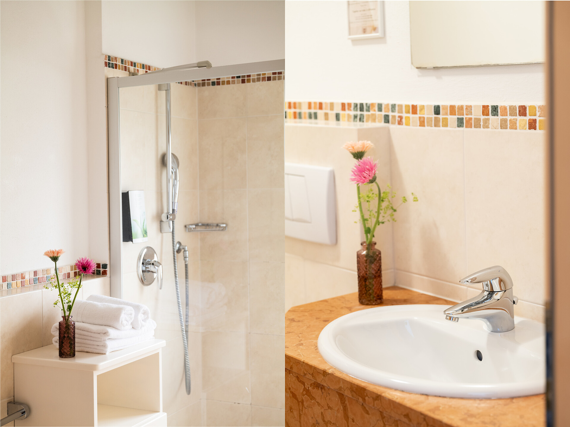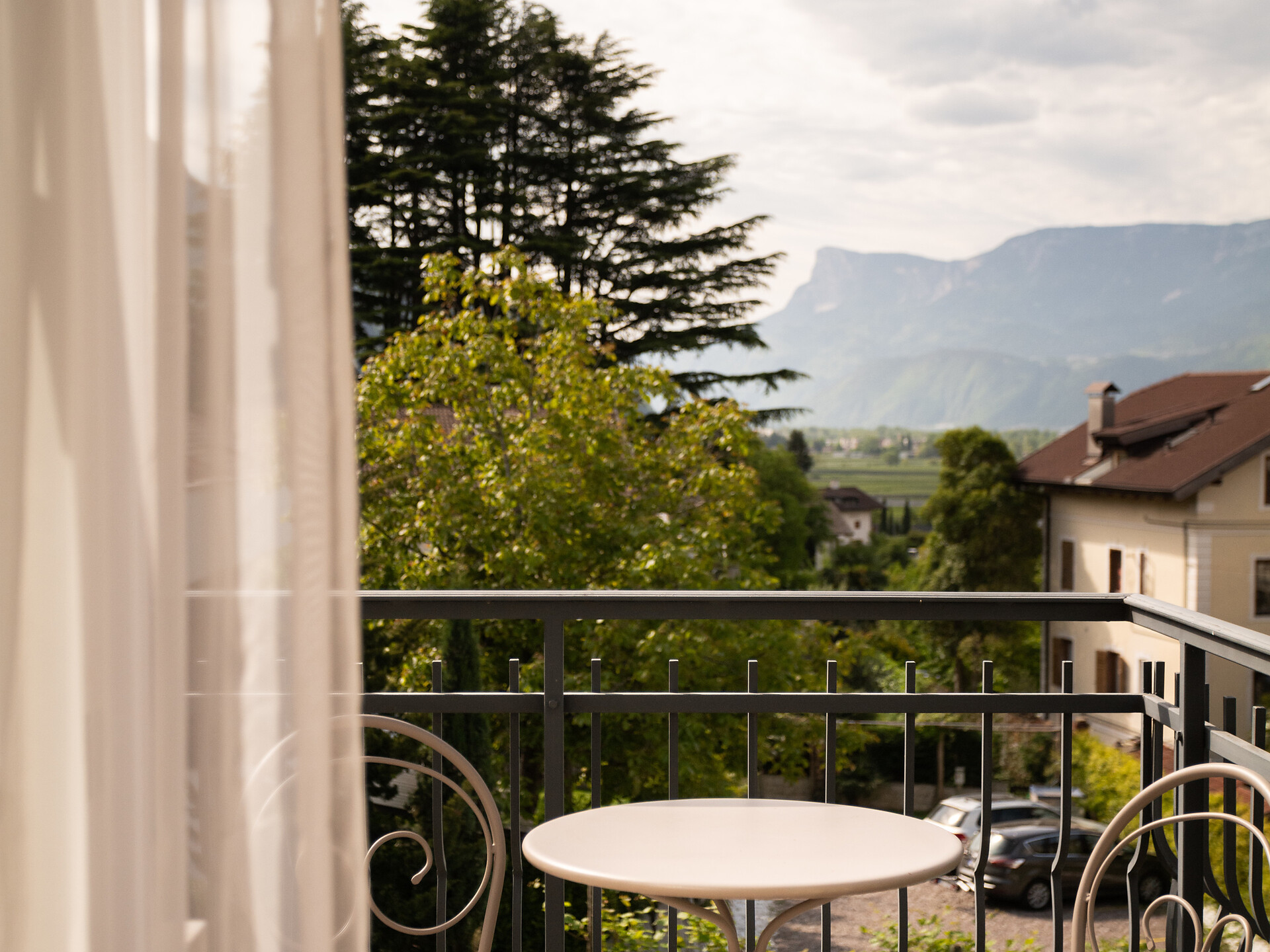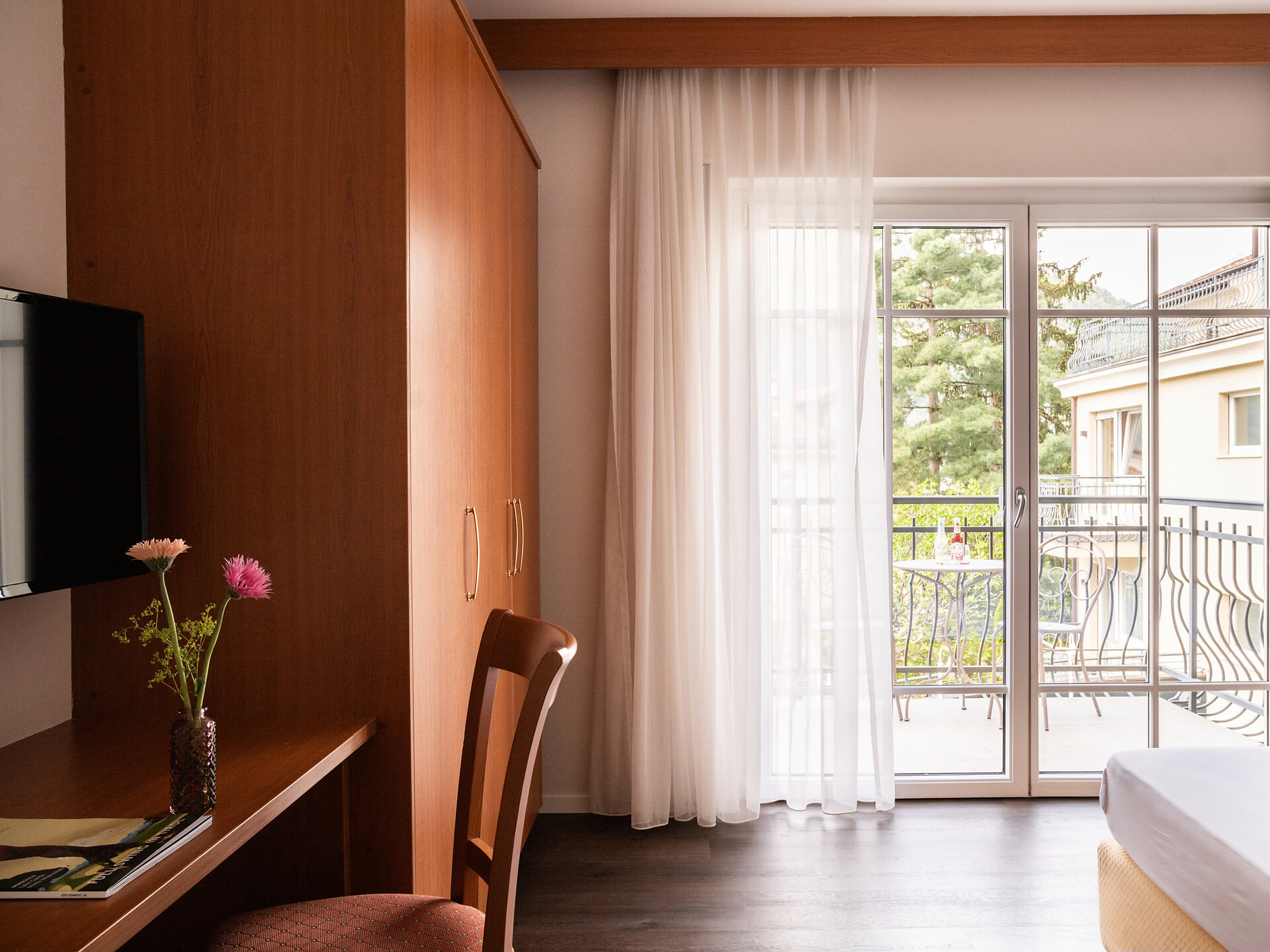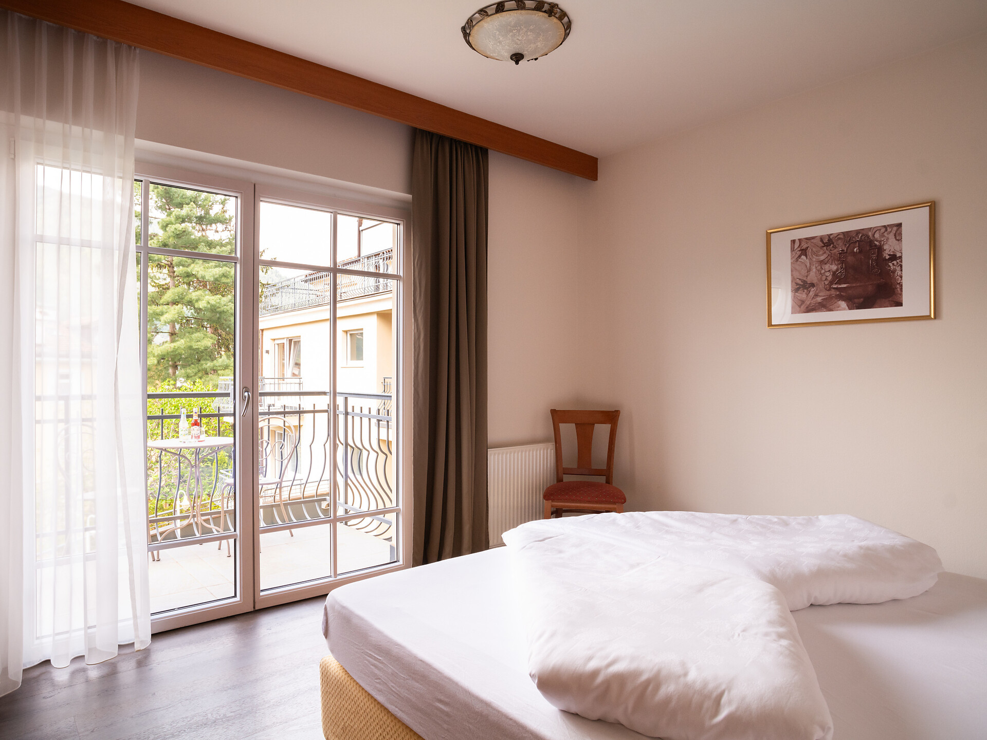 un'accogliente, luminosa camera doppia panoramica al 3° piano (20 - 22 m²) con grande finestre panoramiche per un meraviglioso panorama su Merano. Dotato di: letto matrimoniale king-size, bagno privato con grande doccia a filo pavimento, wc e asciugacapelli, scrivania, TV satellitare con schermo piatto, WIFI internet, telefono e tende oscuranti