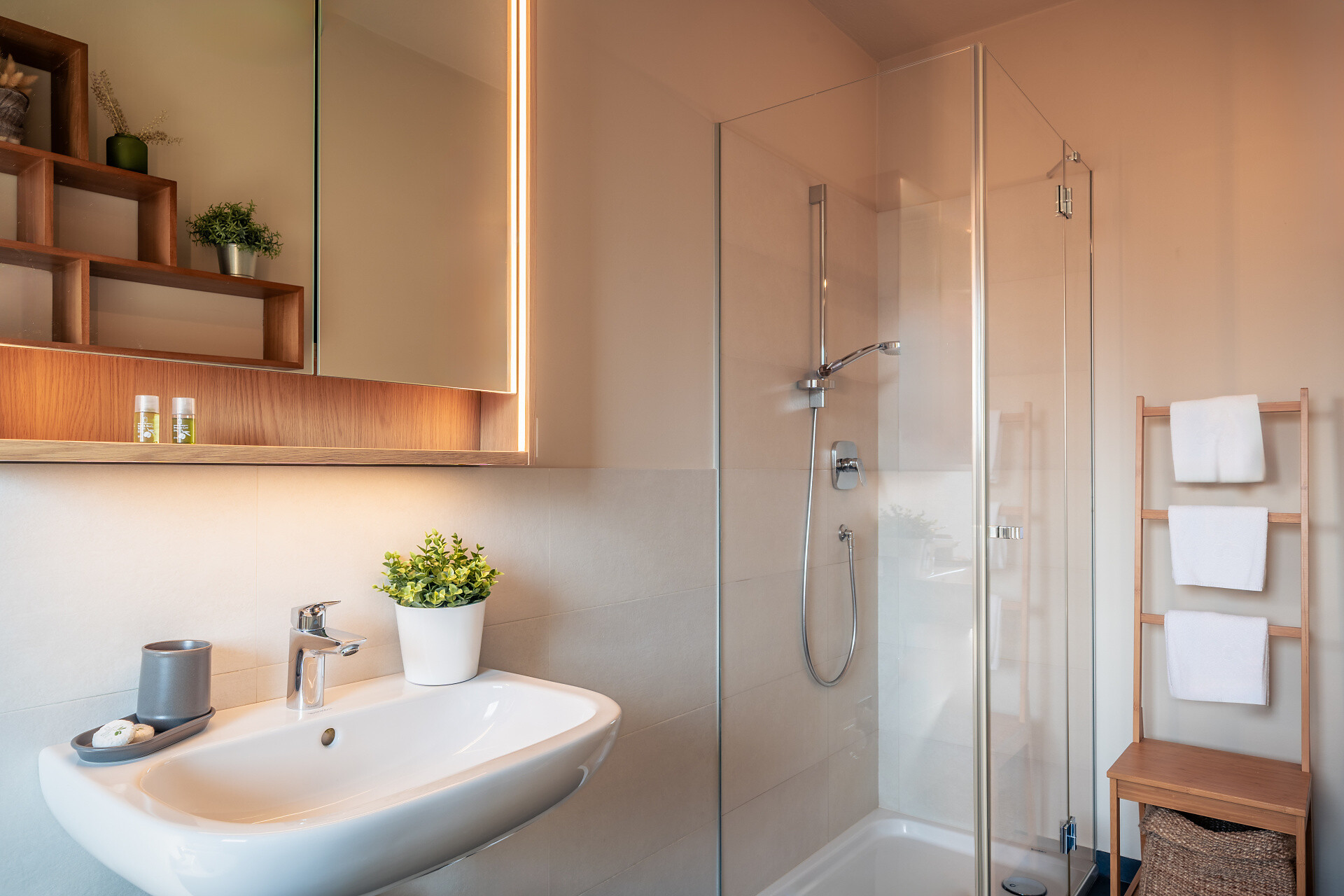 Cucinate nella cucina completamente attrezzata, che include un piano cottura, lavastoviglie e un’area con sedie. Godetevi la vista dal vostro balcone privato, arredato con tavolo e sedie – perfetto per una colazione con vista sulle montagne.
