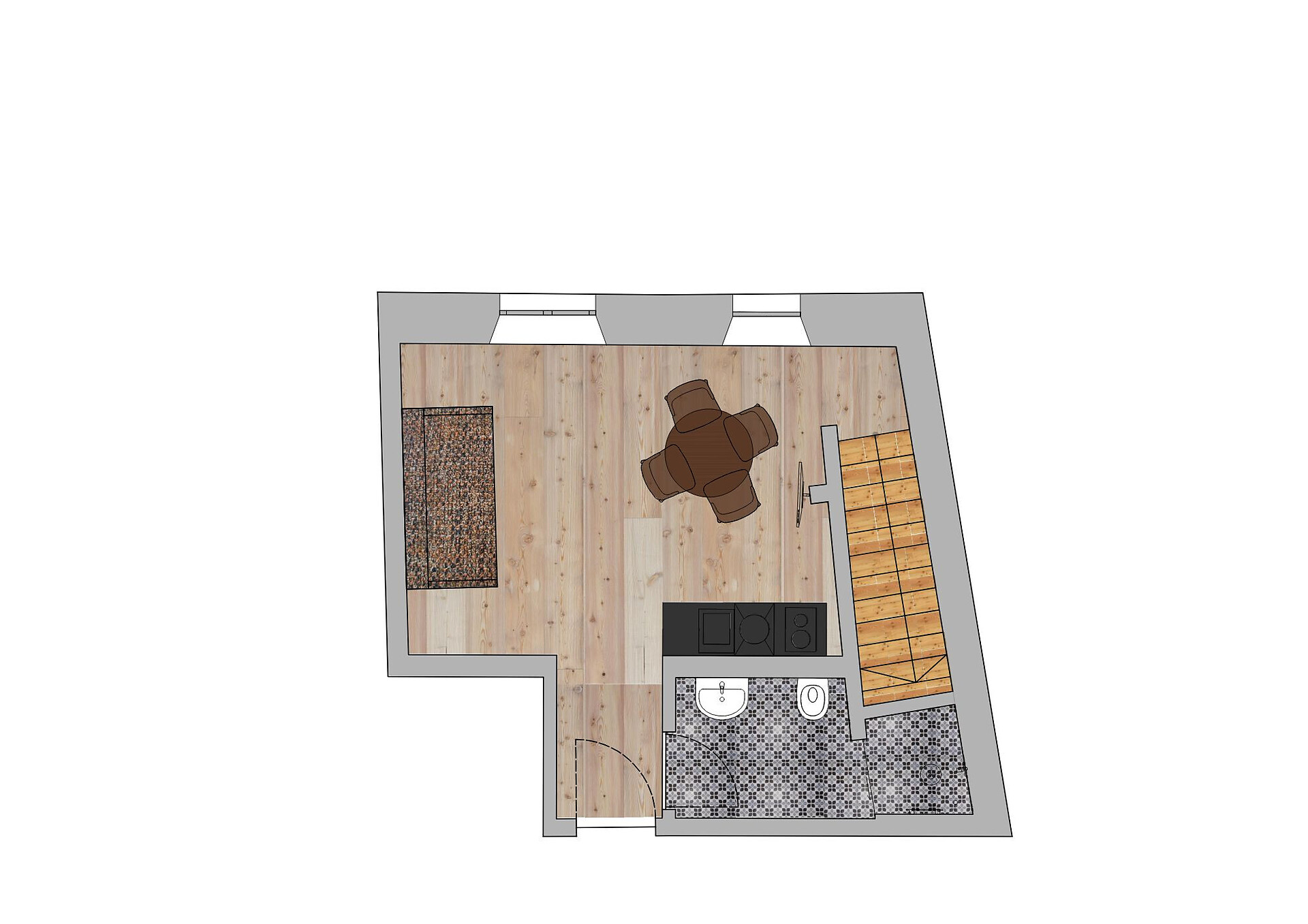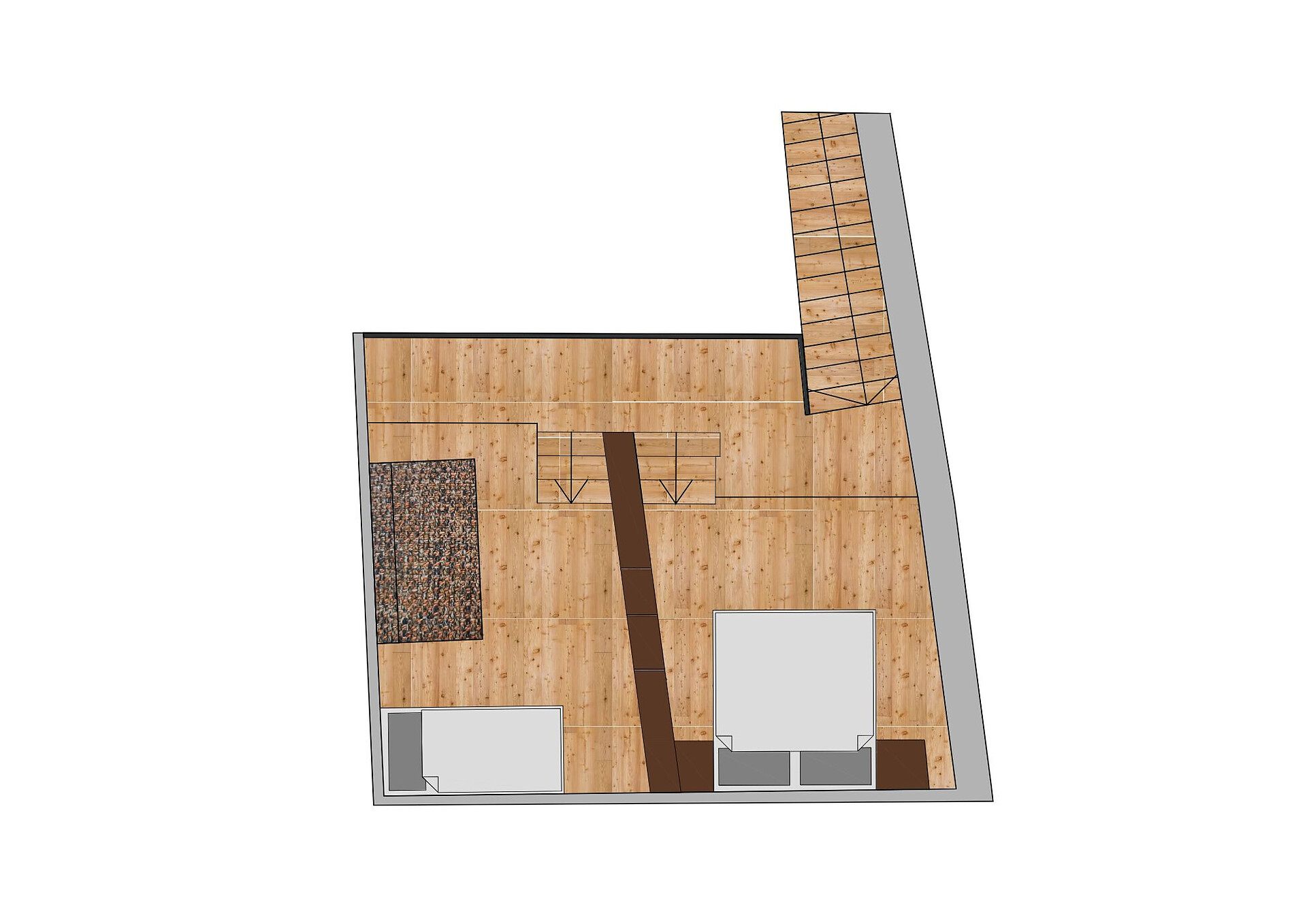 trova la zona giorno e un divano letto per 2 persone, mentre all'ampio piano superiore si trovano un letto matrimoniale, un divano letto per 2 persone e un letto singolo. Le ampie finestre sul tetto possono essere aperte, offrendo una vista libera sul cielo stellato.