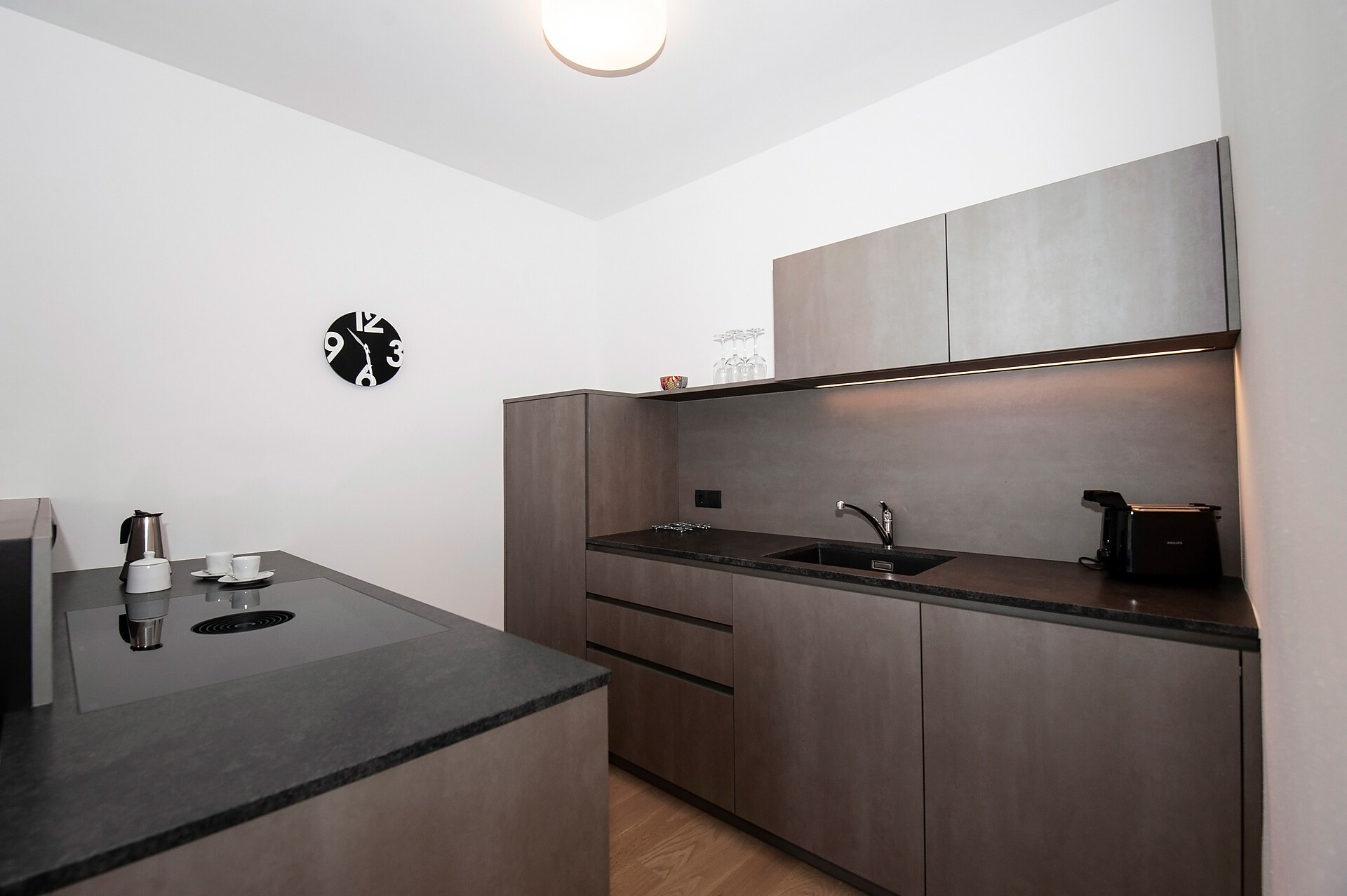 •Cucina completamente attrezzata integrato nel soggiorno con forno, piano cottura a induzione, forno a microonde, macchina da caffè e tostapane.