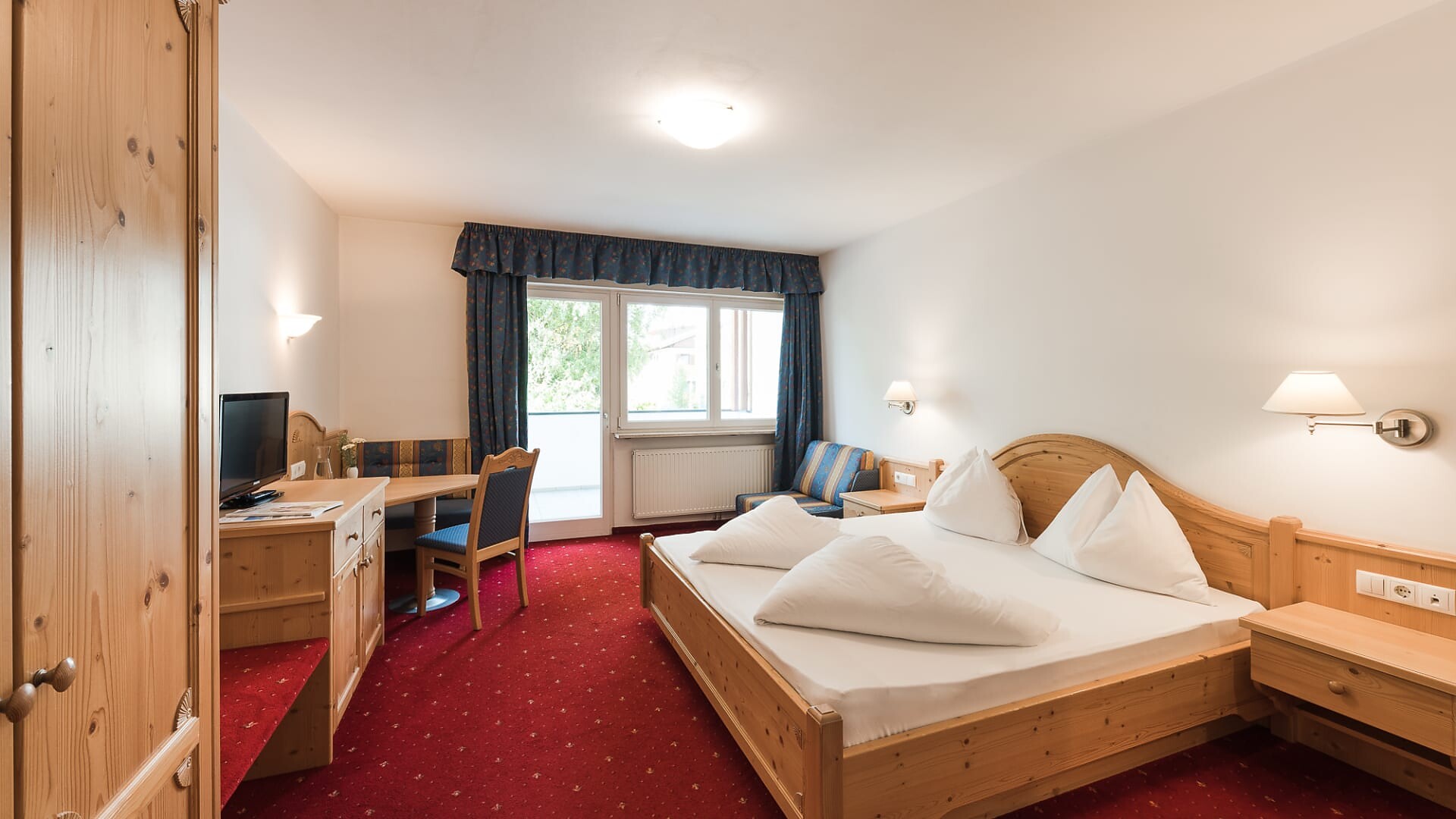 Camera da letto con letto matrimoniale e piccolo tavolino con sedia, in parte con divano letto singolo, moquette. Flat-TV, telefono, WIFI gratuito e cassaforte.