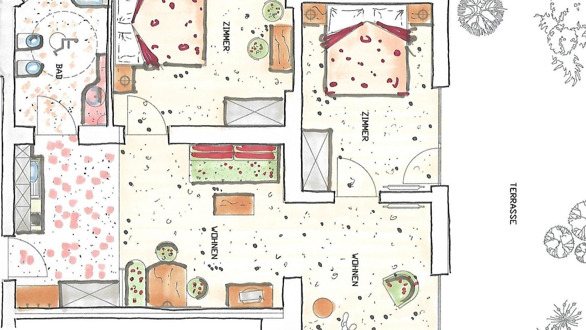POSTO PER TUTTA LA FAMIGLIA…Grande appartamento sito nel edificio adeacente all’Hotel con accesso diretto al giardino, terrazza con tavolo e panca. Parcheggio proprio davanti all’appartamento.Due belle camere matrimoniali e grande soggiorno con tavolo/sedie e divanoletto doppio. Cucina con tavolo/panca, piastre elettriche, frigo, macchina da caffè e accessori incl. torcioni (uso extra 35,00€ una volta sola).Flat-TV, telefono e WLAN gratuito.Bagno con doccia/WC/vasca, lavandino doppio, fon e asciugamani in spugna, inoltre un WC separato con lavandino.Servizio giornaliero di pulizie.Tutti i servizi dell’Hotel compresi.