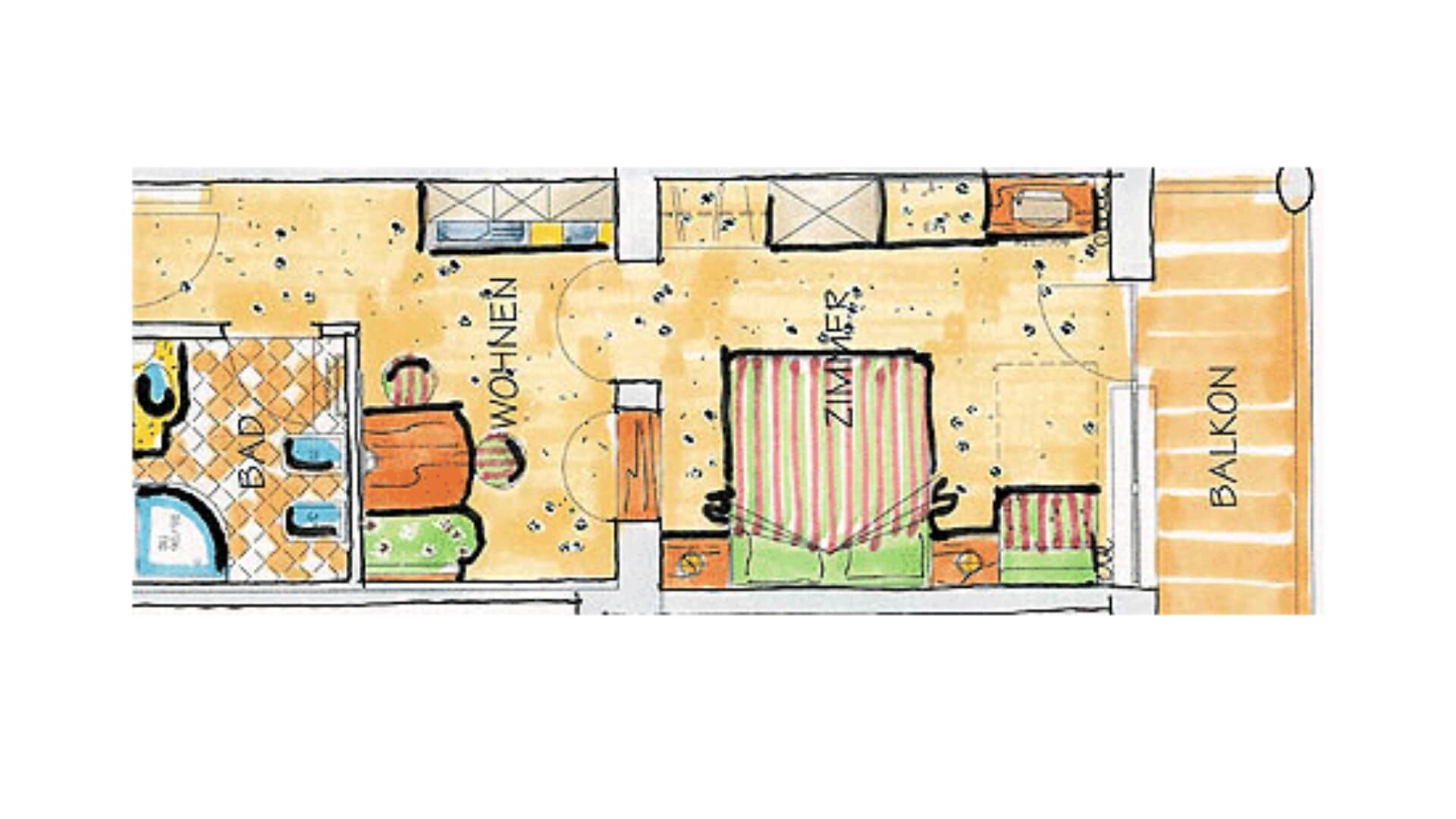 TRADIZIONE E MODERNITÀ…Luminosa e confortevole suite con balcone verso est.Camera da letto con letto matrimoniale e piccolo tavolino/sedie in stile traditionale e nuovo, divano-letto o letto singolo moderno spazio soggiorno (parzialmente con porta scorrevole) con divano accogliente, pavimento moquette e legno. Flat-TV, telefono, WIFI gratuito e cassaforte.Bagno con doccia/WC, bidet, fon e asciugamani in spugna.