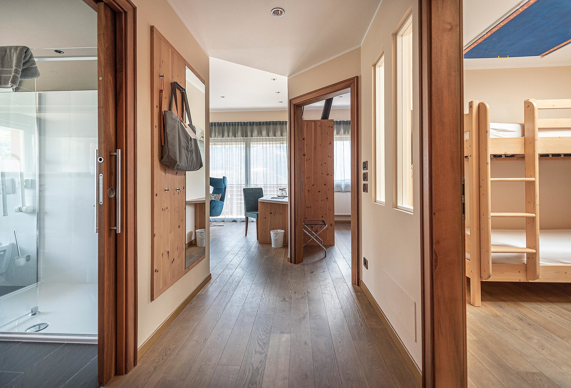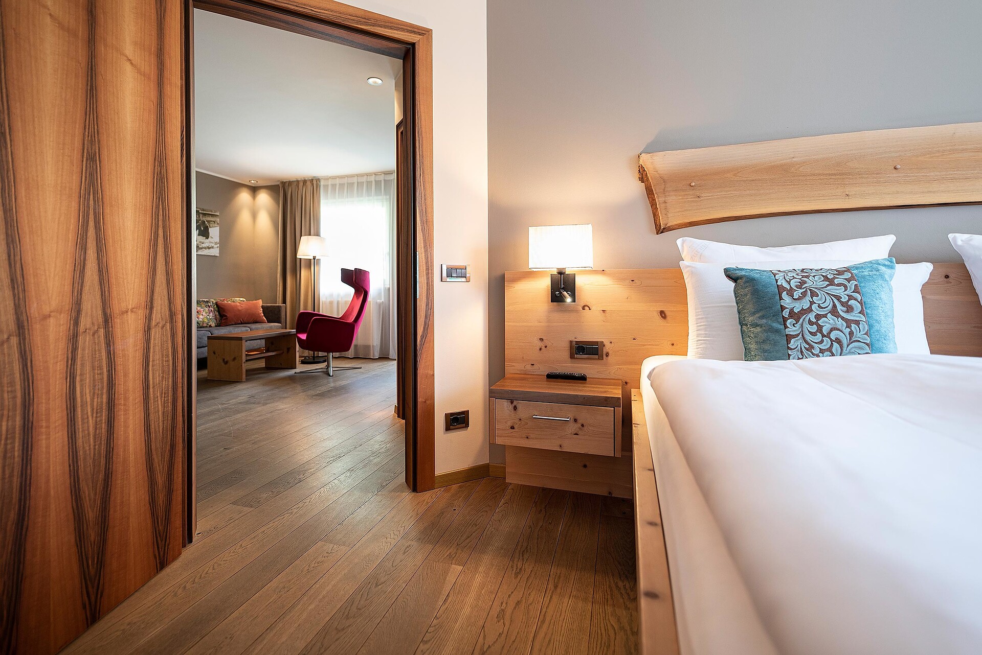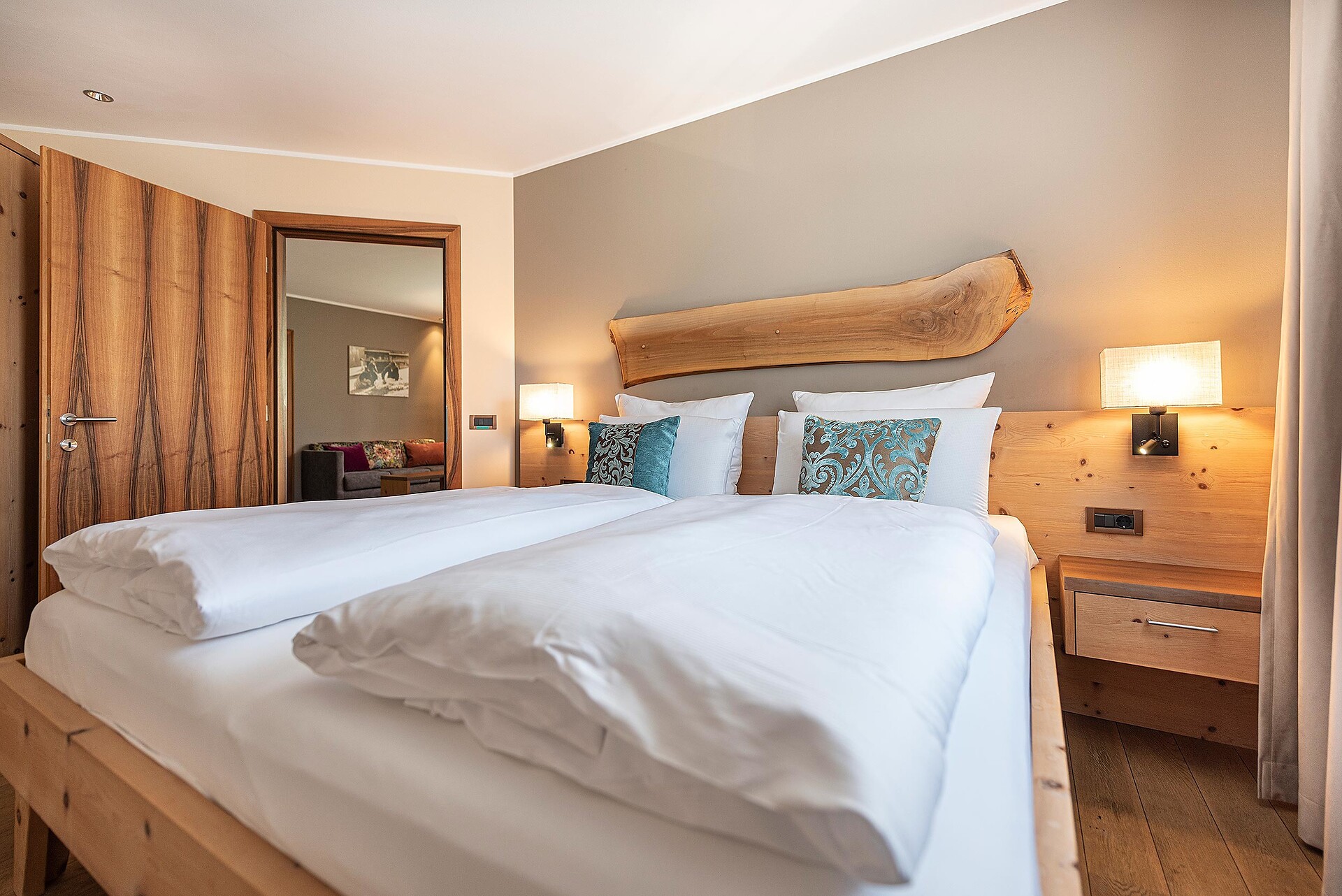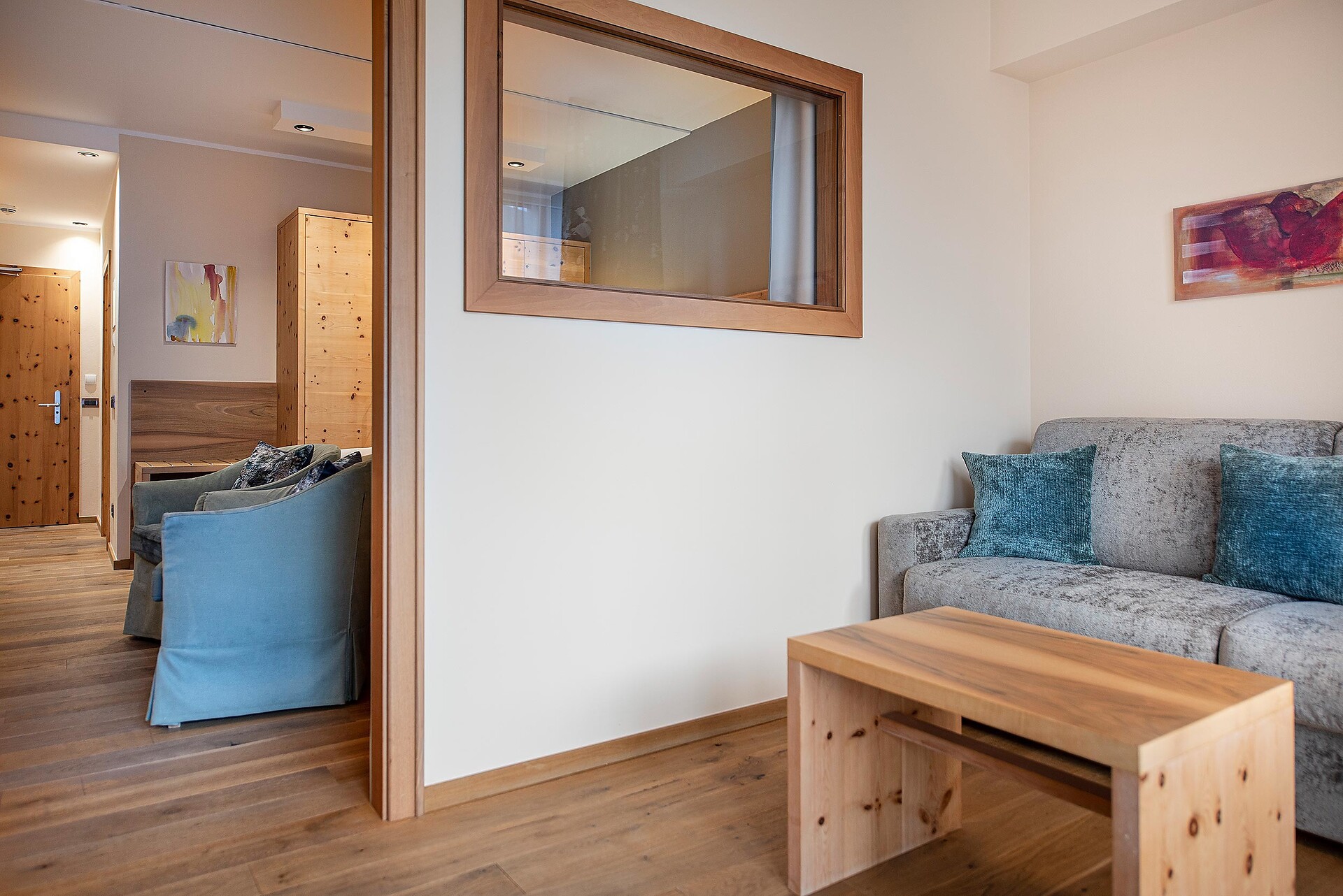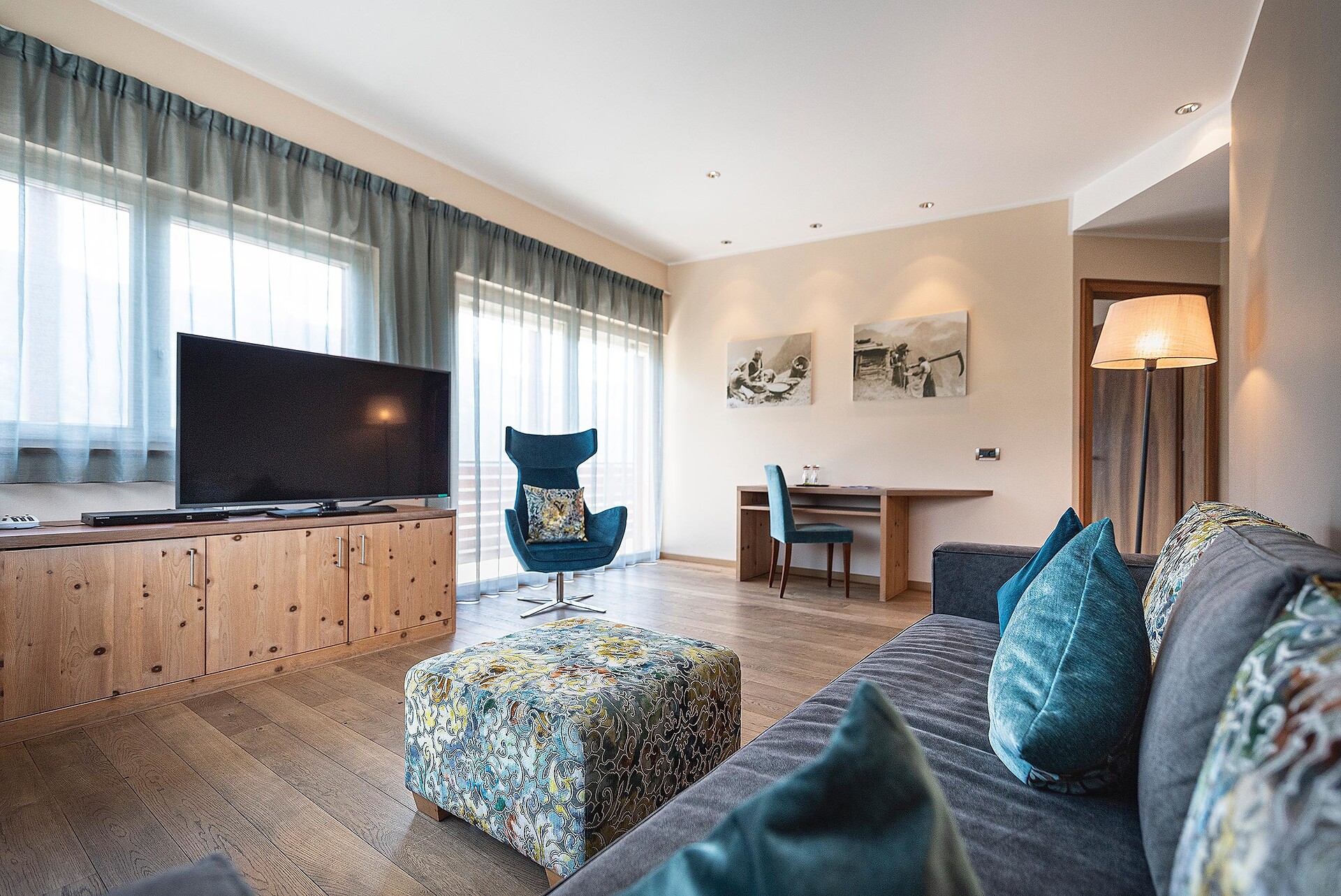 Caratteristiche: aria condizionata, pavimenti in vero legno, mobili in legno di abete rosso dell'Alto Adige, ampio balcone esposto a nord. Zona notte separata, zona giorno con divano e poltrona, letti a castello incassati (2 x 0,80 m) con protezione anticaduta su tutti i lati (come 2° posto letto per adulti senza letto superiore), scrivania, minibar, radio, lettore DVD, TV 50" a schermo piatto, 2° televisore in camera da letto, telefono, cassaforte in camera, connessione WLAN e I-Net gratuita. Bagno (8,5 m²) con finestra, asciugacapelli, accappatoio, doccia, prodotti per la cura (shampoo, balsamo per capelli, gel doccia, sapone per le mani) e zona WC separata con bidet. Pantofole da bagno (su richiesta alla reception). Posto auto in garage.