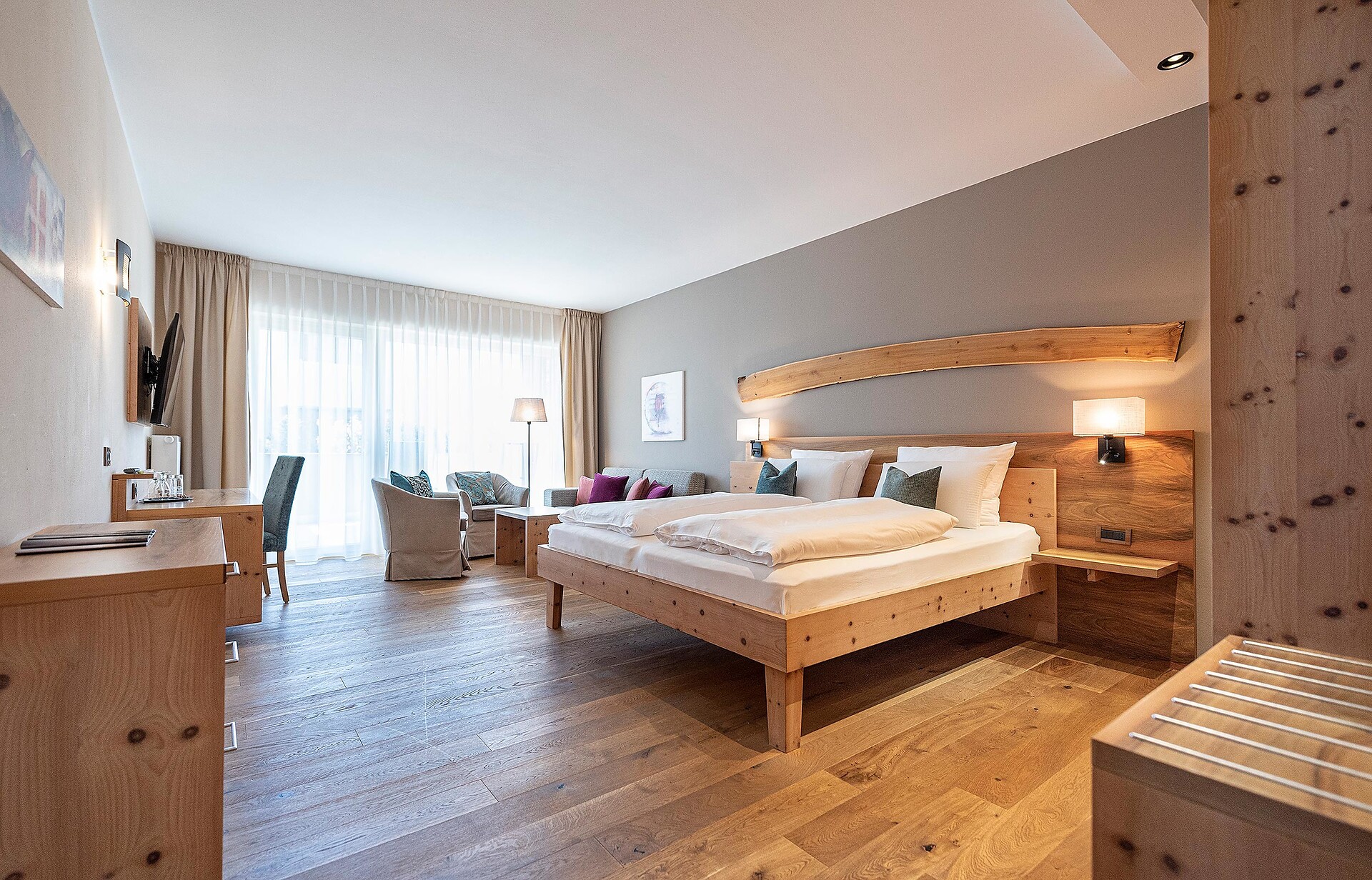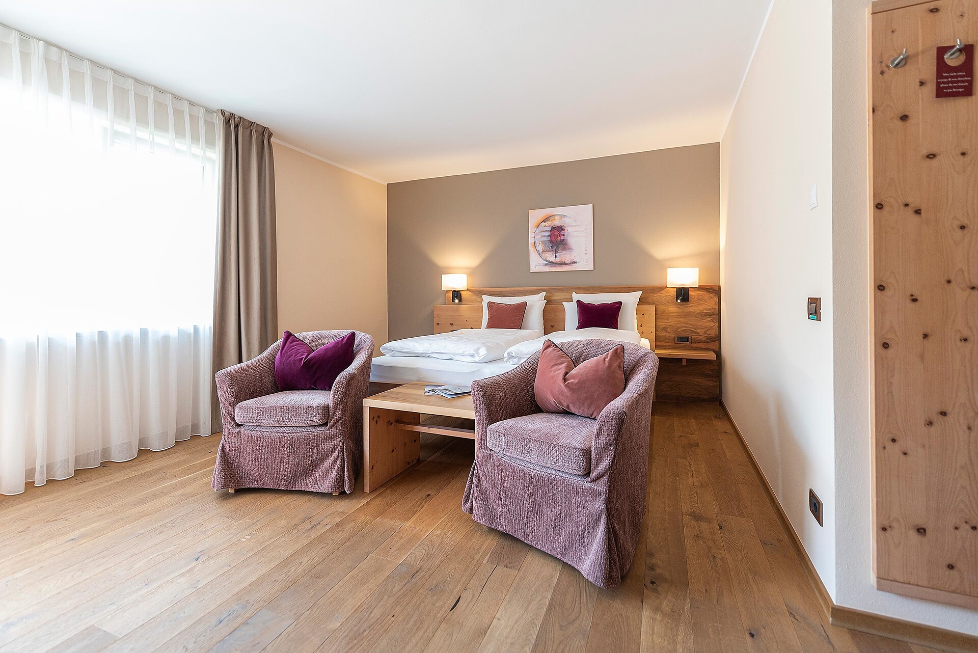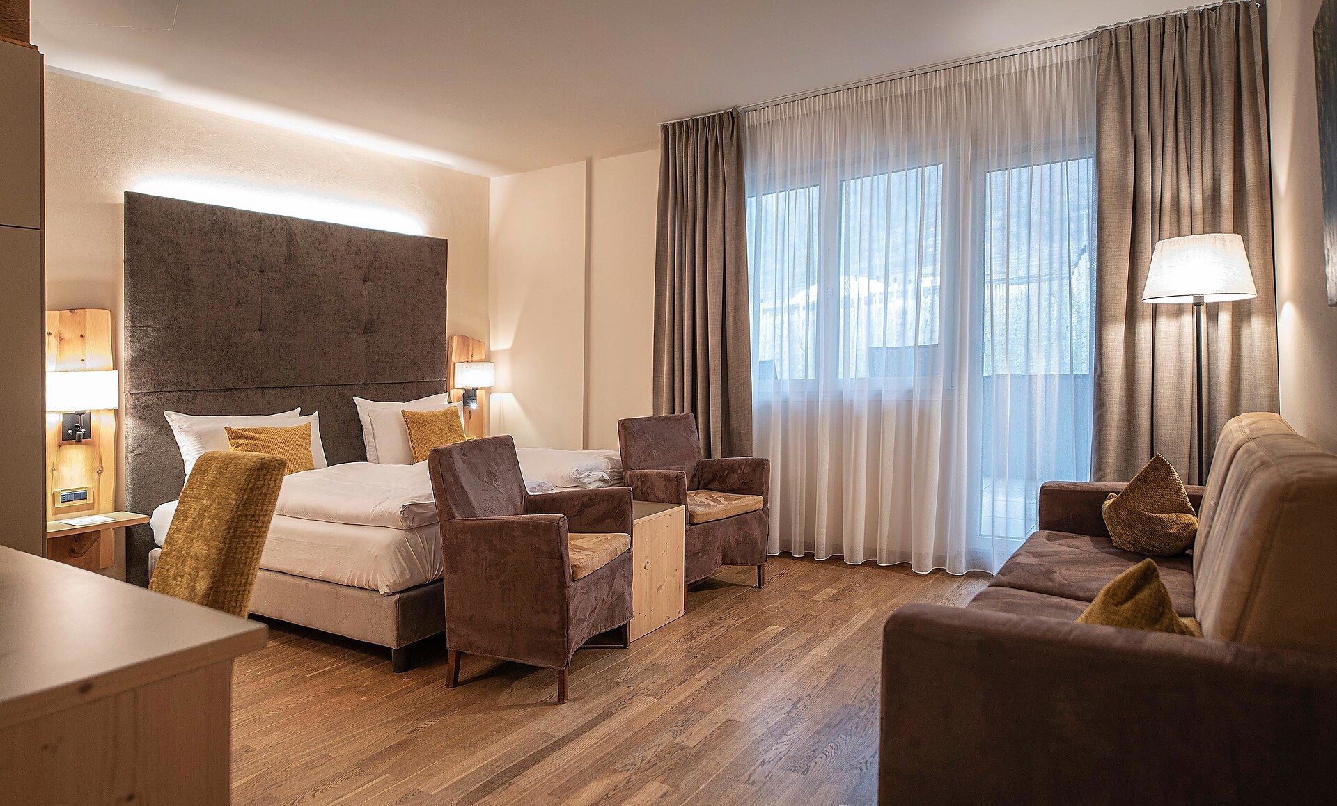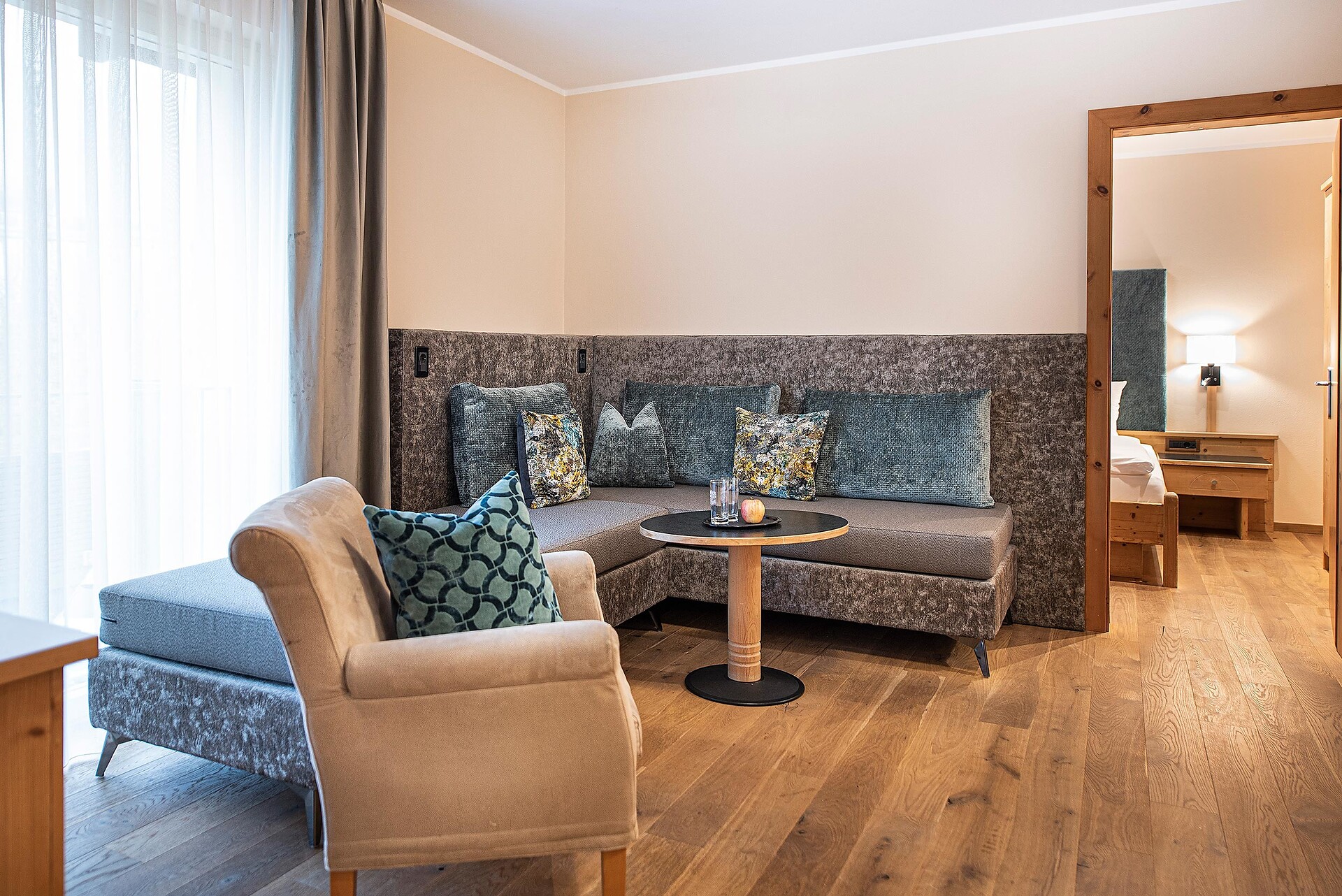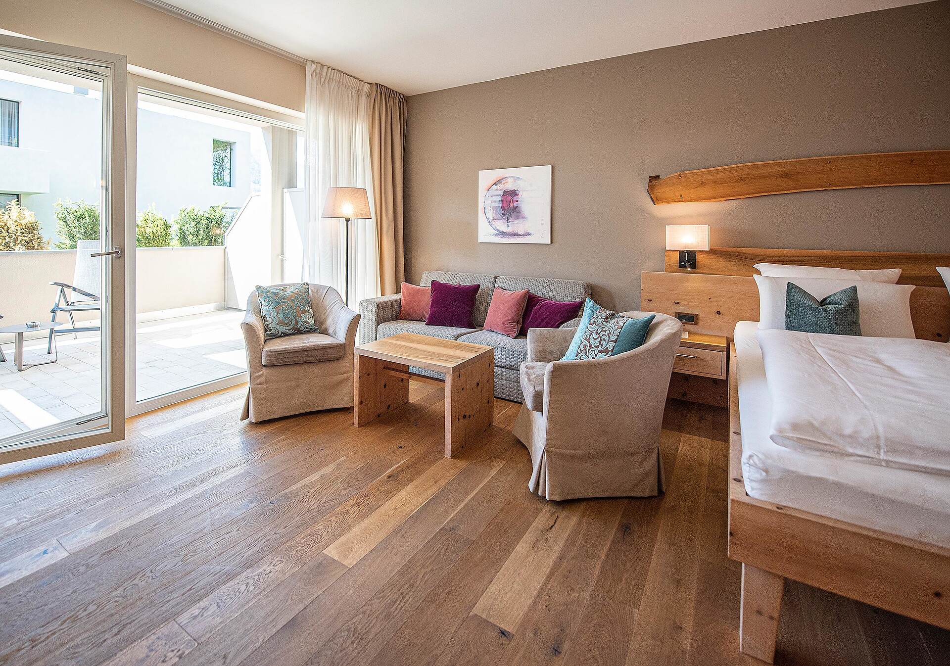 Caratteristiche: aria condizionata, pavimenti in vero legno, mobili in legno di abete rosso dell'Alto Adige, ampio balcone esposto a nord. Zona notte separata, zona giorno con divano e poltrona, letti a castello incassati (2 x 0,80 m) con protezione anticaduta su tutti i lati (come 2° posto letto per adulti senza letto superiore), scrivania, minibar, radio, lettore DVD, TV 50" a schermo piatto, 2° televisore in camera da letto, telefono, cassaforte in camera, connessione WLAN e I-Net gratuita. Bagno (8,5 m²) con finestra, asciugacapelli, accappatoio, doccia, prodotti per la cura (shampoo, balsamo per capelli, gel doccia, sapone per le mani) e zona WC separata con bidet. Pantofole da bagno (su richiesta alla reception). Posto auto in garage.