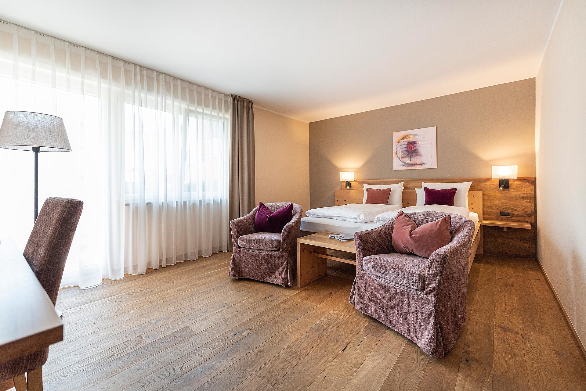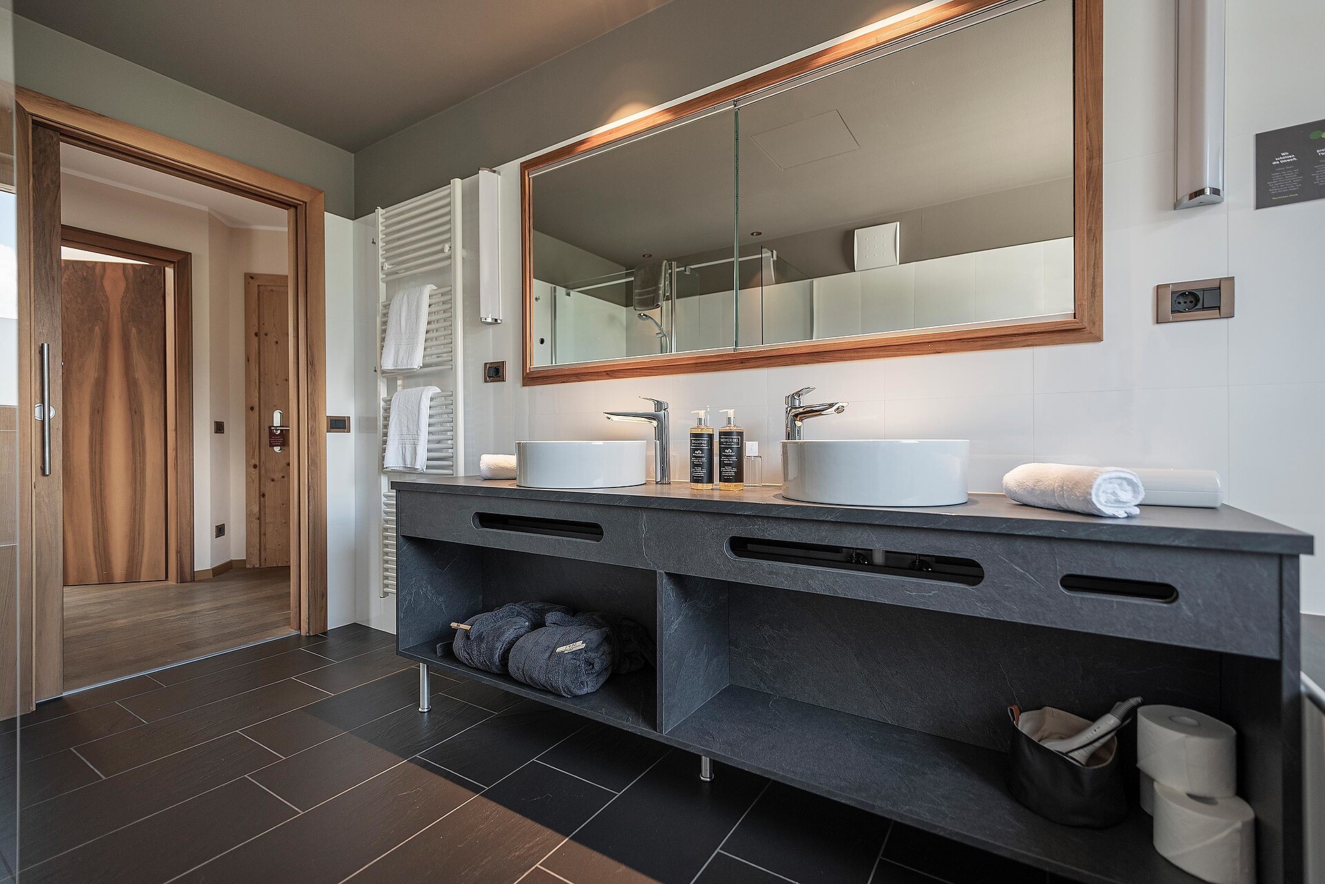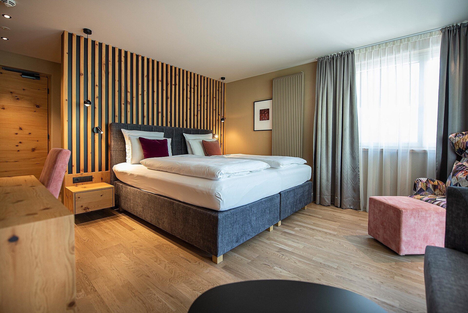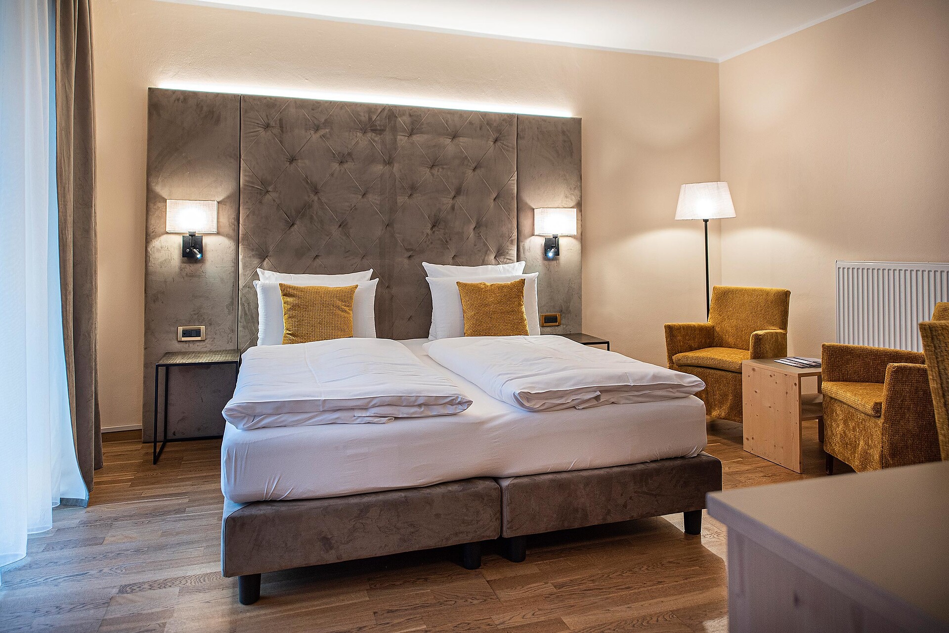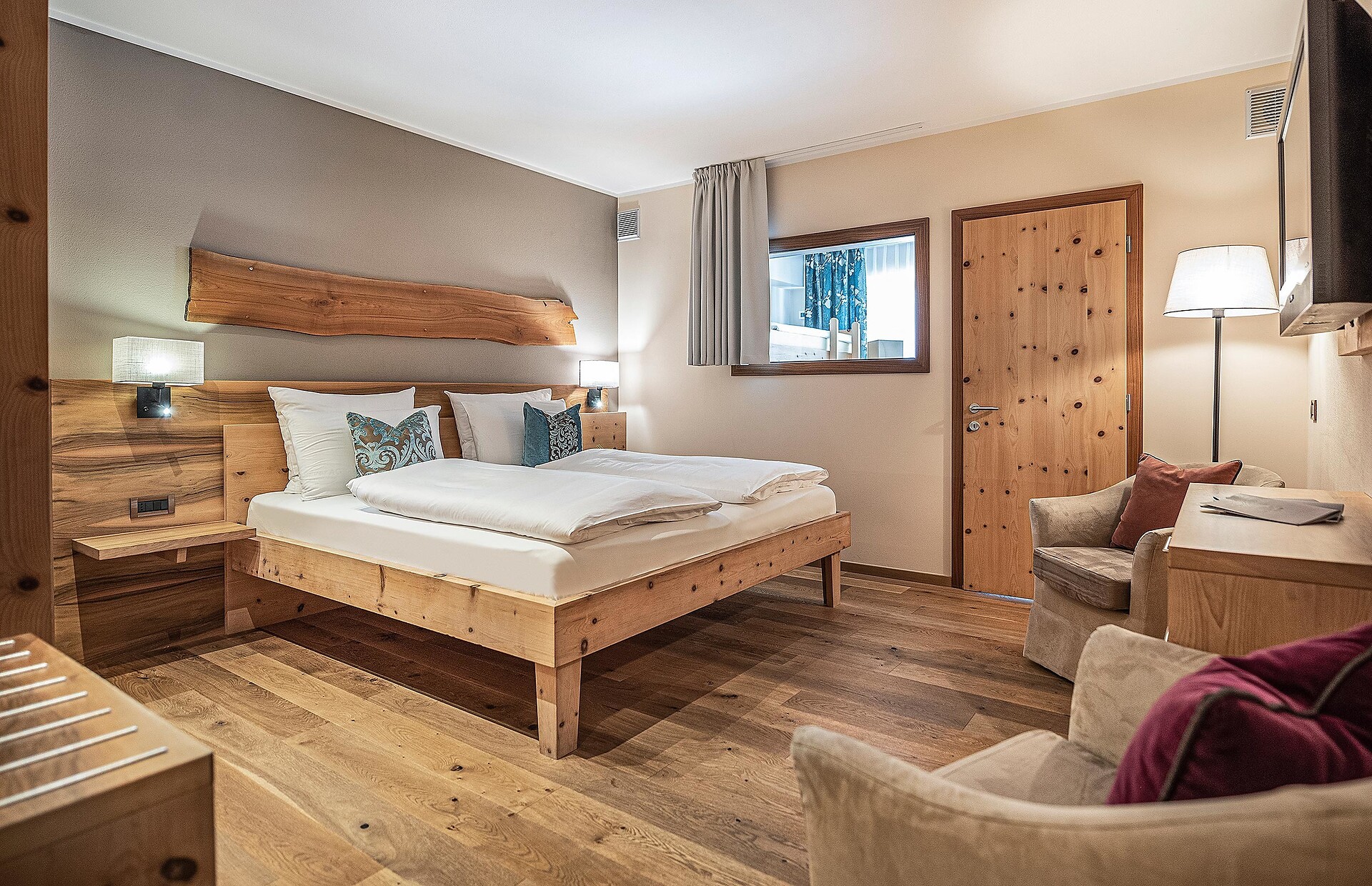 Caratteristiche: aria condizionata, pavimenti in vero legno, mobili in legno di abete rosso dell'Alto Adige, ampio balcone esposto a nord. Zona notte separata, zona giorno con divano e poltrona, letti a castello incassati (2 x 0,80 m) con protezione anticaduta su tutti i lati (come 2° posto letto per adulti senza letto superiore), scrivania, minibar, radio, lettore DVD, TV 50" a schermo piatto, 2° televisore in camera da letto, telefono, cassaforte in camera, connessione WLAN e I-Net gratuita. Bagno (8,5 m²) con finestra, asciugacapelli, accappatoio, doccia, prodotti per la cura (shampoo, balsamo per capelli, gel doccia, sapone per le mani) e zona WC separata con bidet. Pantofole da bagno (su richiesta alla reception). Posto auto in garage.