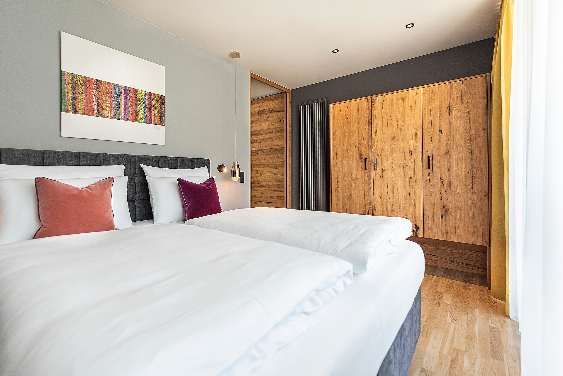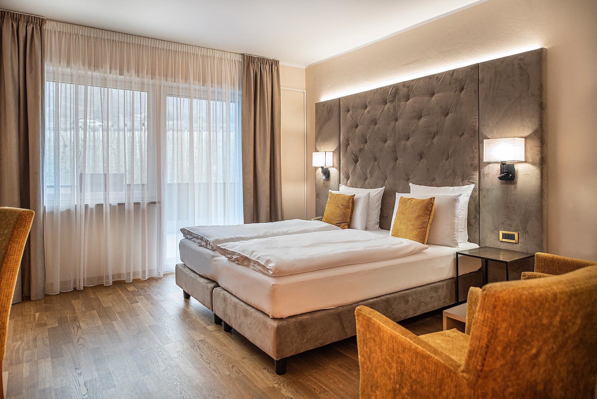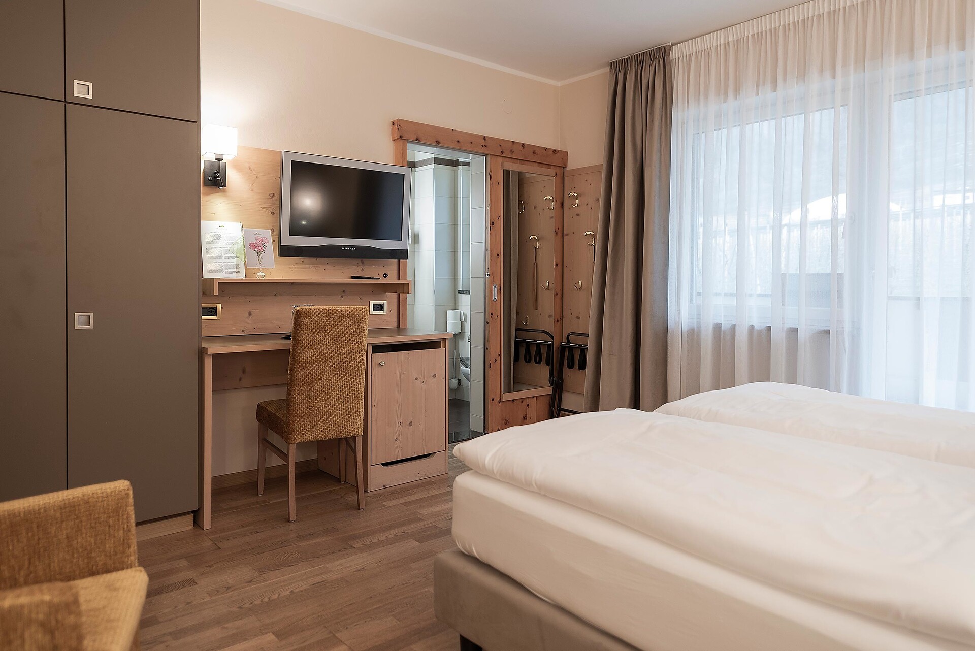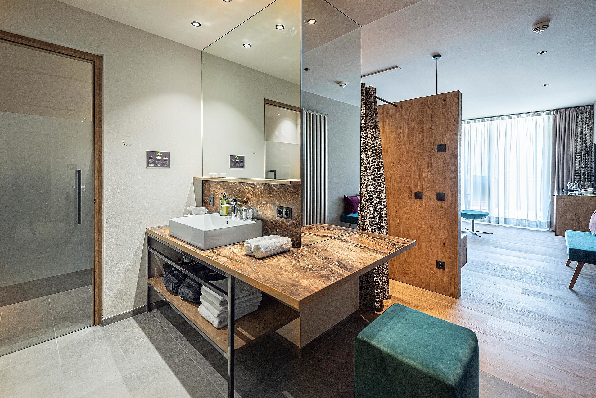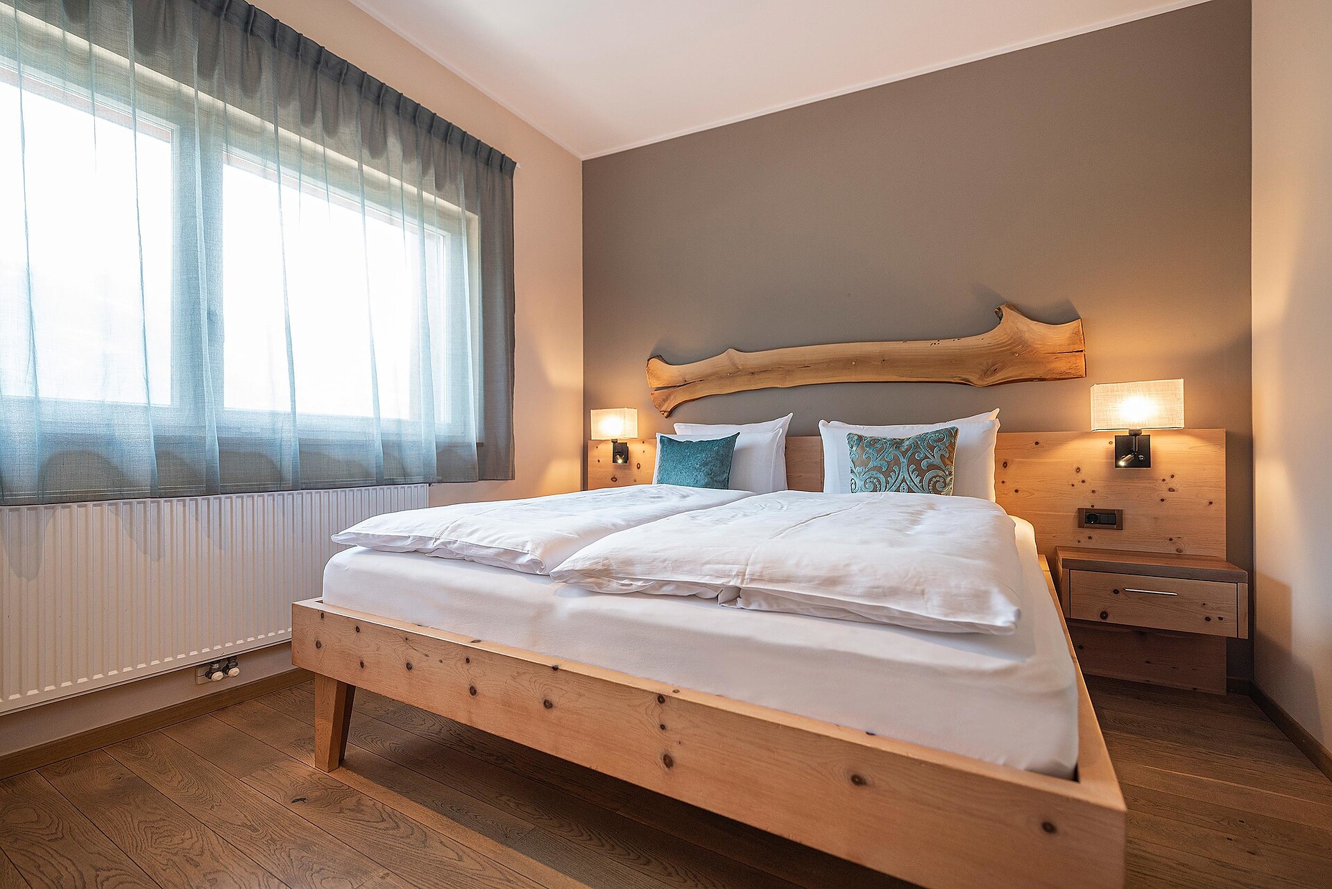Caratteristiche: aria condizionata, pavimenti in vero legno, mobili in legno di abete rosso dell'Alto Adige, ampio balcone esposto a nord. Zona notte separata, zona giorno con divano e poltrona, letti a castello incassati (2 x 0,80 m) con protezione anticaduta su tutti i lati (come 2° posto letto per adulti senza letto superiore), scrivania, minibar, radio, lettore DVD, TV 50" a schermo piatto, 2° televisore in camera da letto, telefono, cassaforte in camera, connessione WLAN e I-Net gratuita. Bagno (8,5 m²) con finestra, asciugacapelli, accappatoio, doccia, prodotti per la cura (shampoo, balsamo per capelli, gel doccia, sapone per le mani) e zona WC separata con bidet. Pantofole da bagno (su richiesta alla reception). Posto auto in garage.
