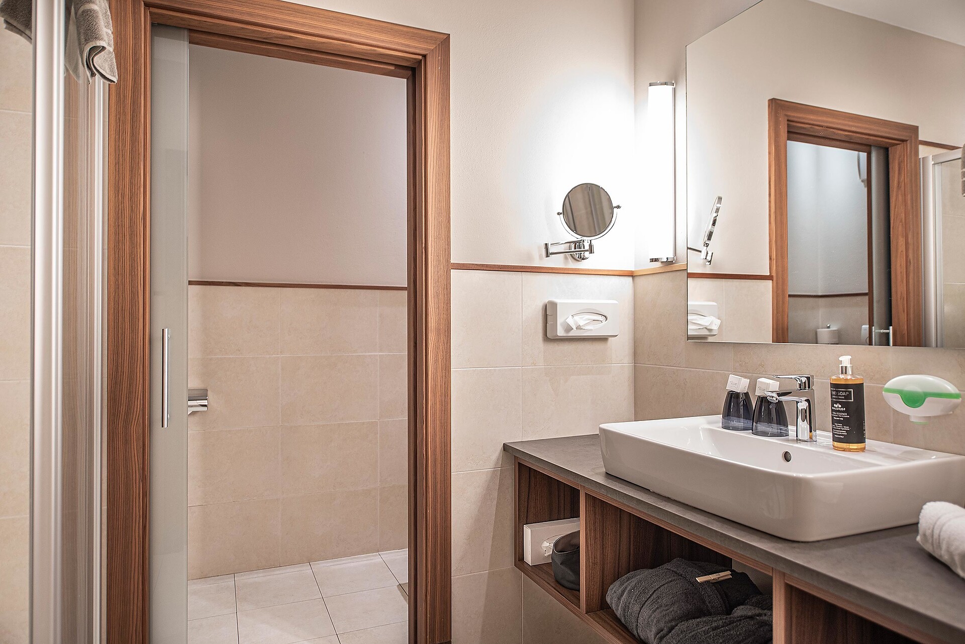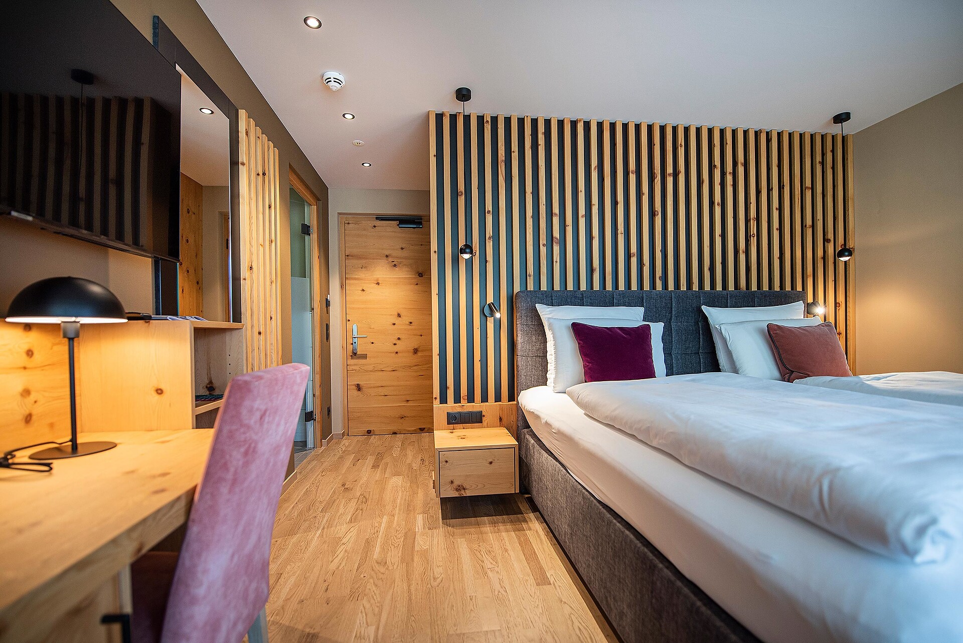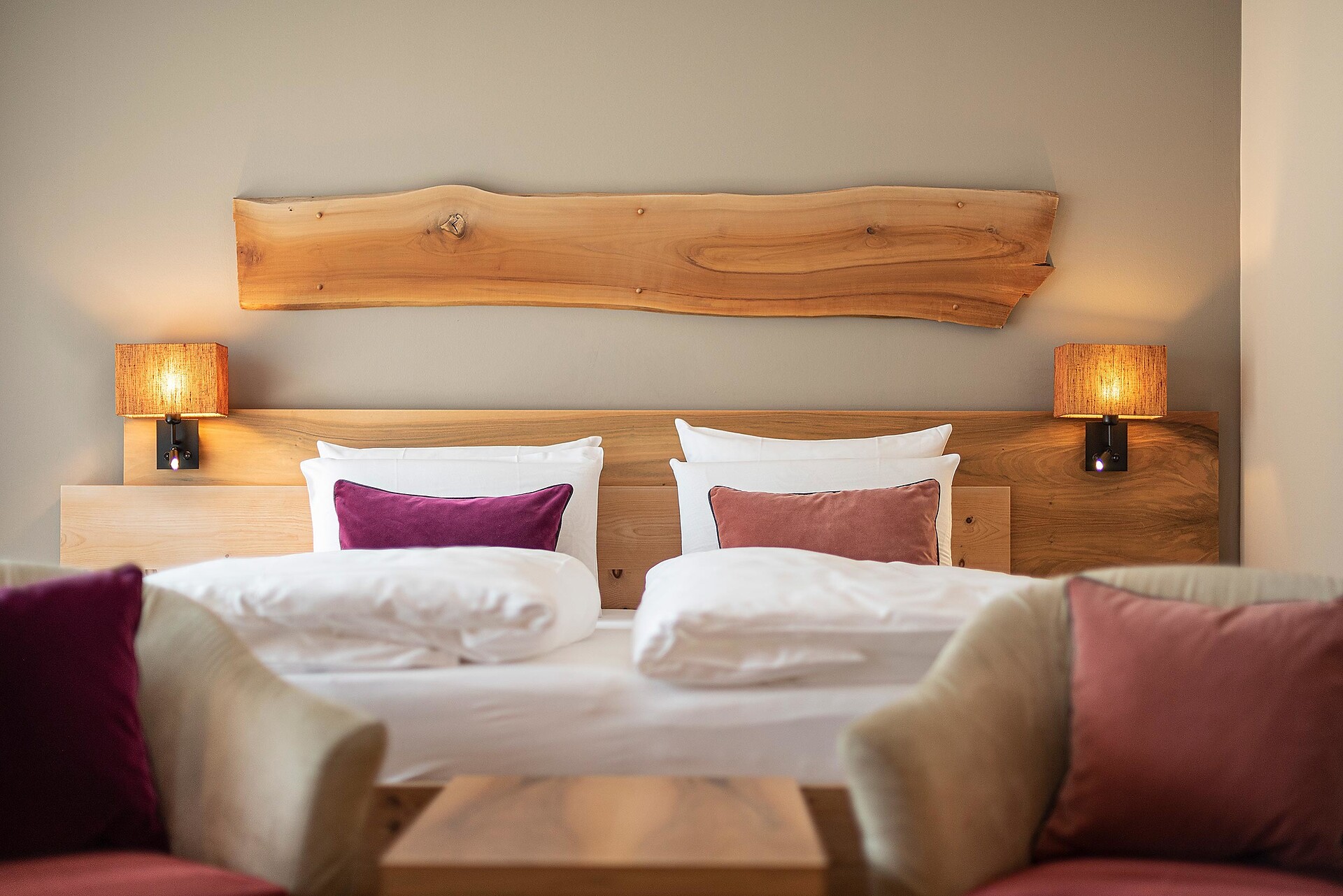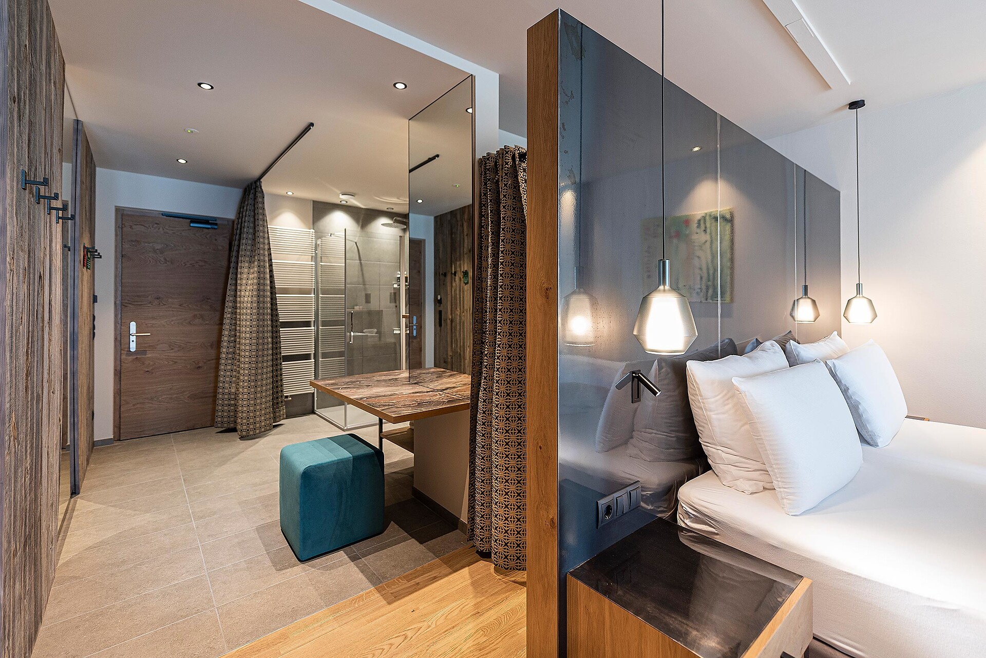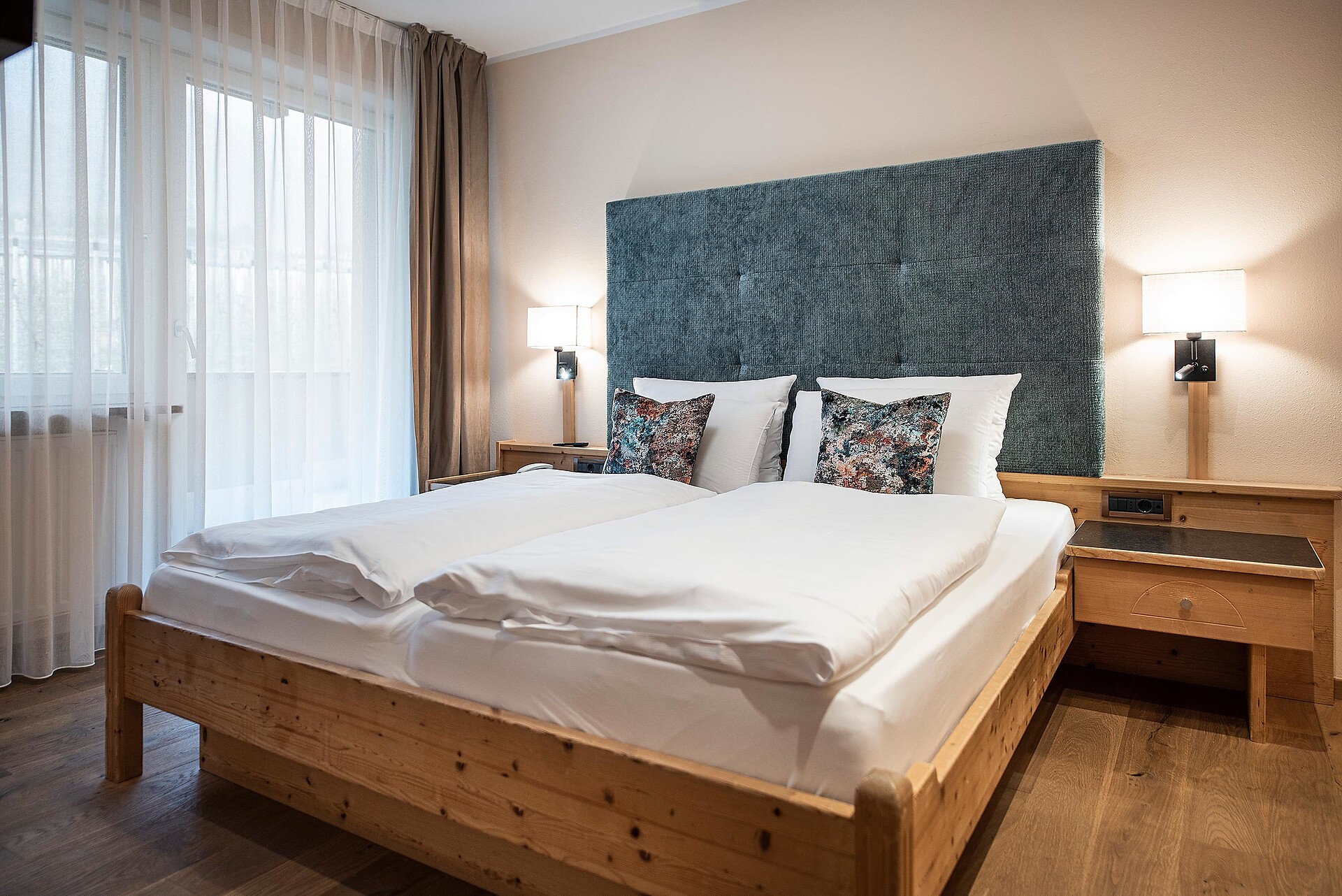 Caratteristiche: aria condizionata, pavimenti in vero legno, mobili in legno di abete rosso dell'Alto Adige, ampio balcone esposto a nord. Zona notte separata, zona giorno con divano e poltrona, letti a castello incassati (2 x 0,80 m) con protezione anticaduta su tutti i lati (come 2° posto letto per adulti senza letto superiore), scrivania, minibar, radio, lettore DVD, TV 50" a schermo piatto, 2° televisore in camera da letto, telefono, cassaforte in camera, connessione WLAN e I-Net gratuita. Bagno (8,5 m²) con finestra, asciugacapelli, accappatoio, doccia, prodotti per la cura (shampoo, balsamo per capelli, gel doccia, sapone per le mani) e zona WC separata con bidet. Pantofole da bagno (su richiesta alla reception). Posto auto in garage.