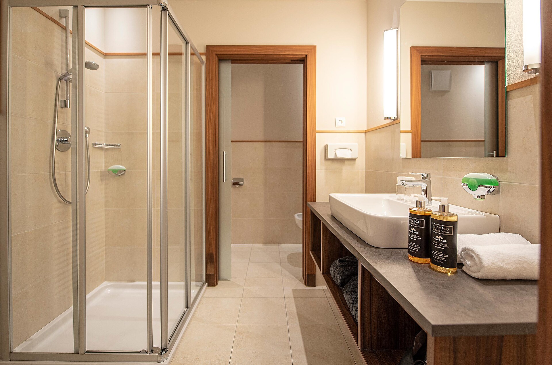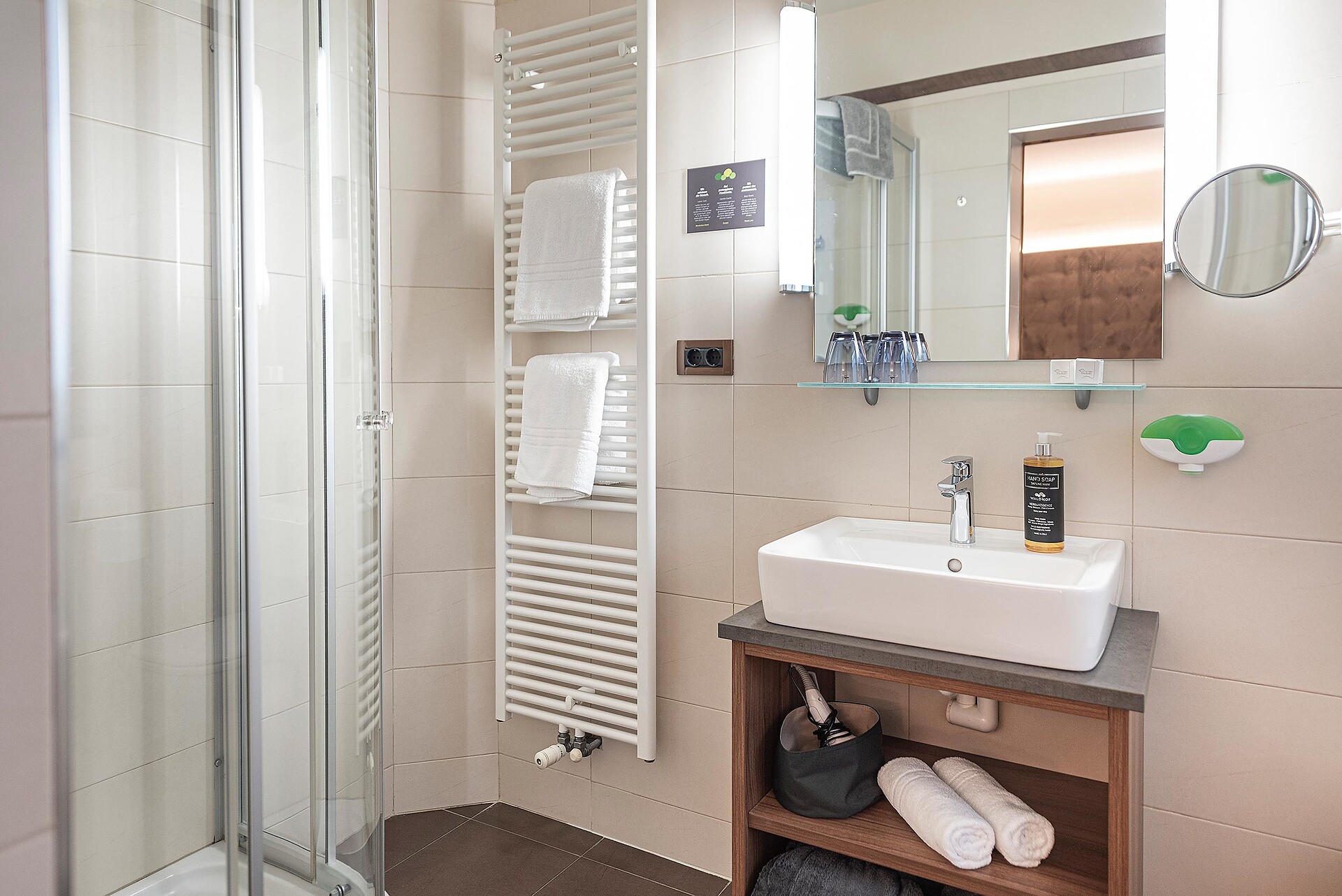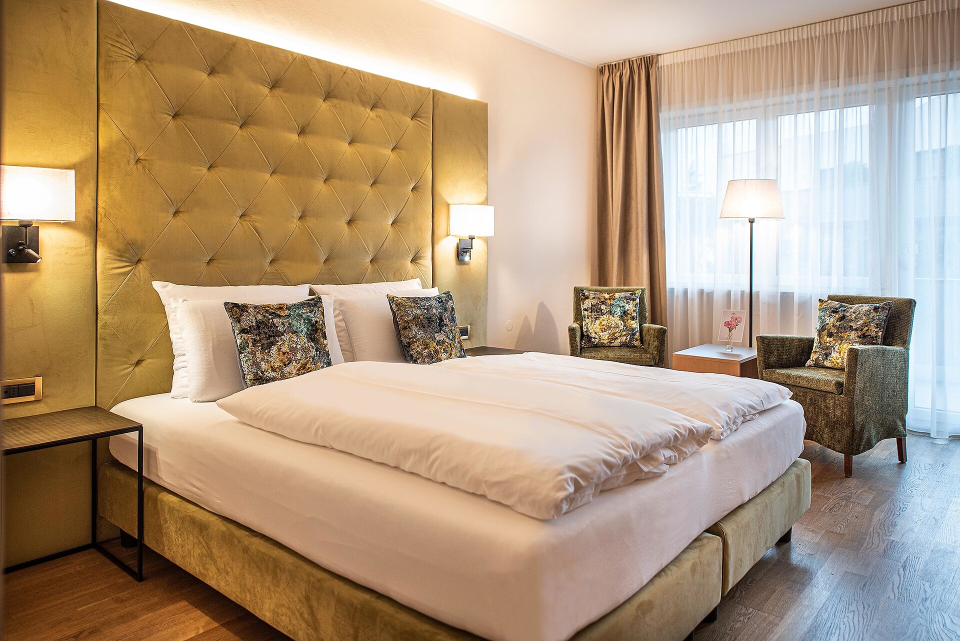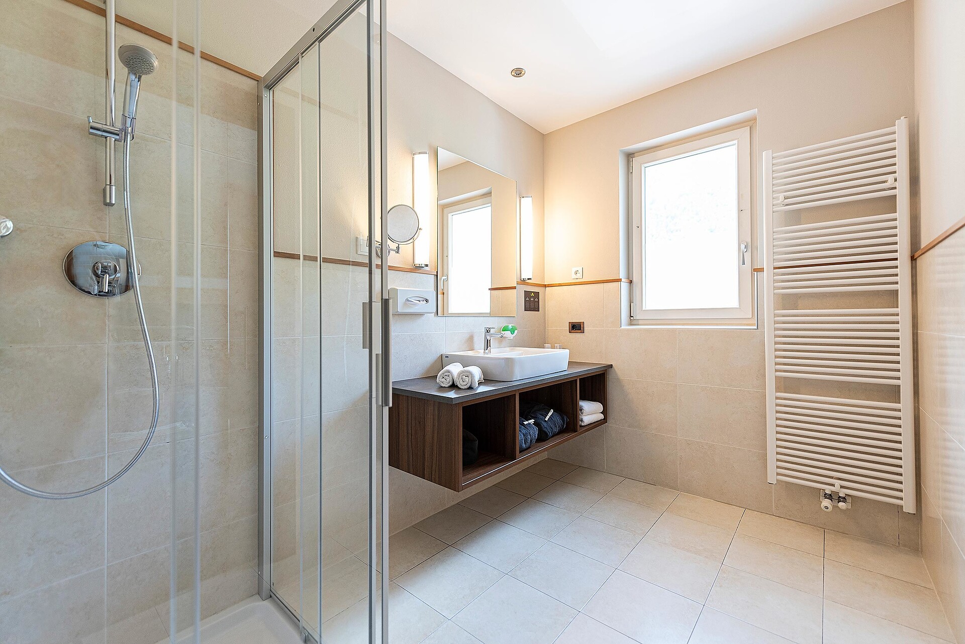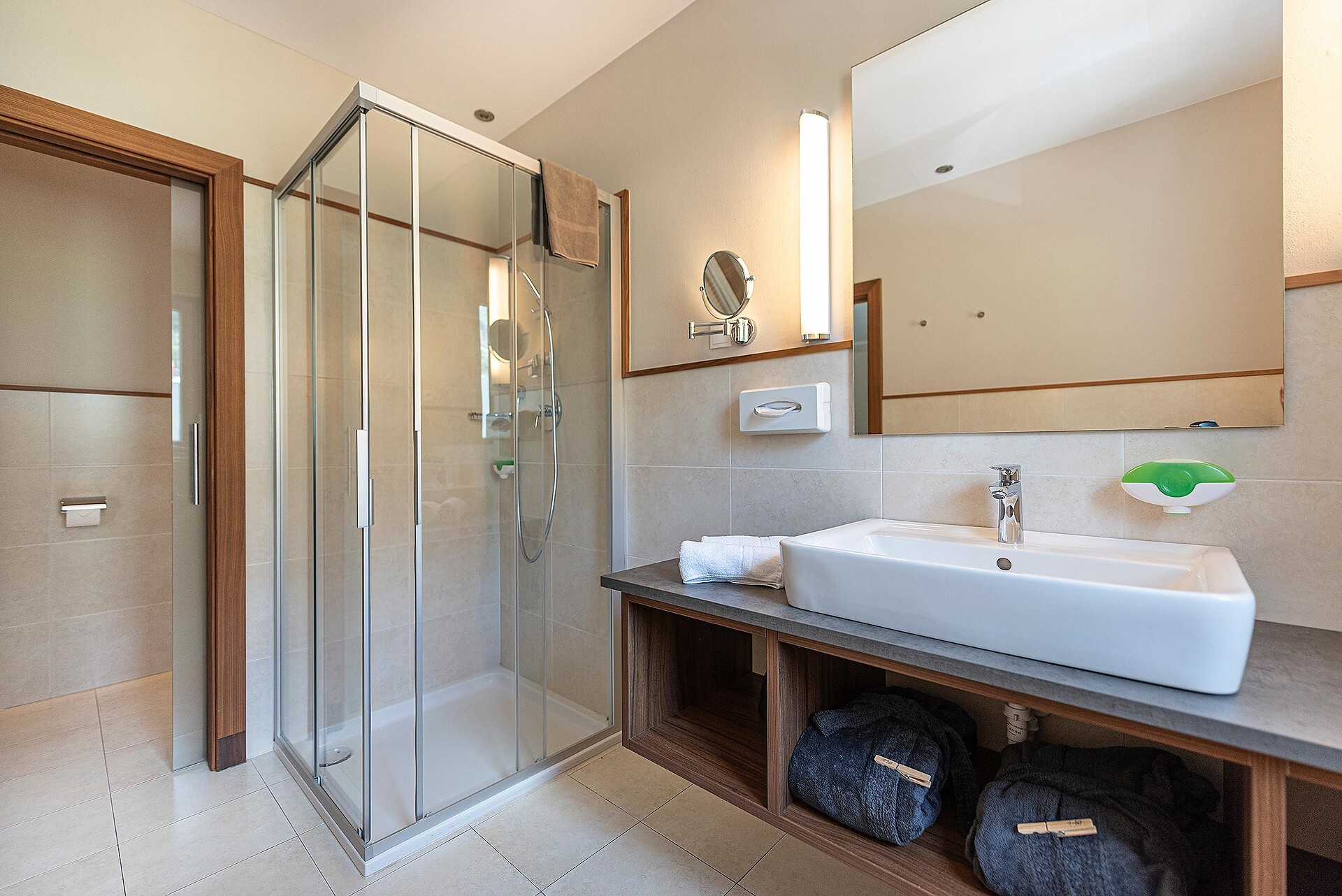 Caratteristiche: aria condizionata, pavimenti in vero legno, mobili in legno di abete rosso dell'Alto Adige, ampio balcone esposto a nord. Zona notte separata, zona giorno con divano e poltrona, letti a castello incassati (2 x 0,80 m) con protezione anticaduta su tutti i lati (come 2° posto letto per adulti senza letto superiore), scrivania, minibar, radio, lettore DVD, TV 50" a schermo piatto, 2° televisore in camera da letto, telefono, cassaforte in camera, connessione WLAN e I-Net gratuita. Bagno (8,5 m²) con finestra, asciugacapelli, accappatoio, doccia, prodotti per la cura (shampoo, balsamo per capelli, gel doccia, sapone per le mani) e zona WC separata con bidet. Pantofole da bagno (su richiesta alla reception). Posto auto in garage.