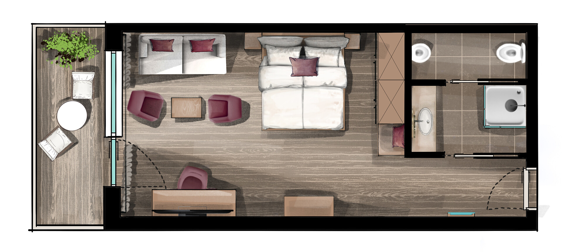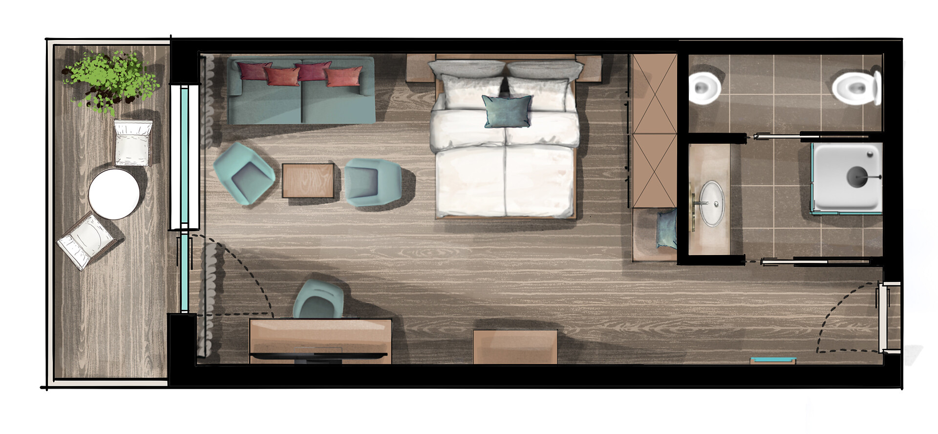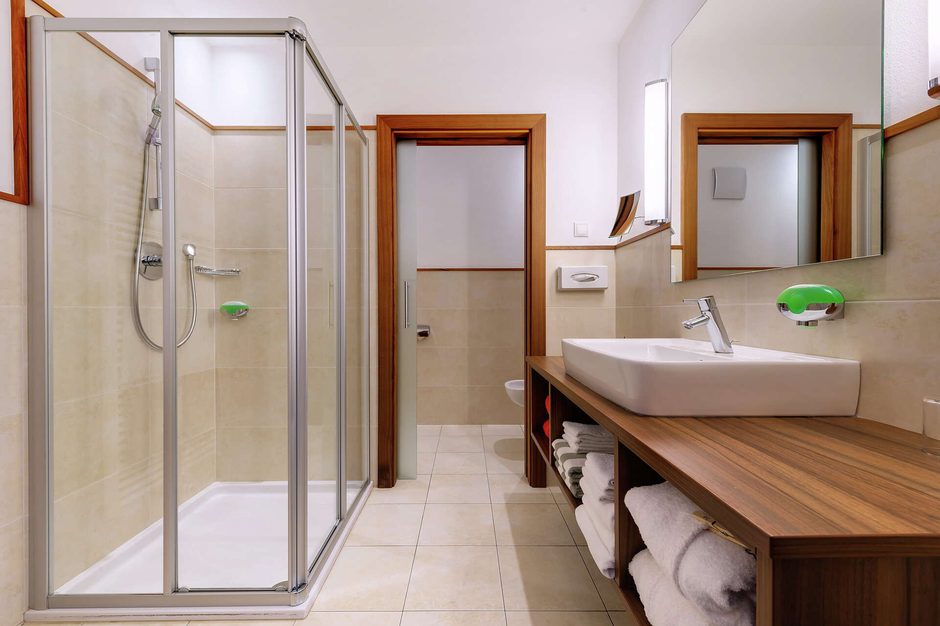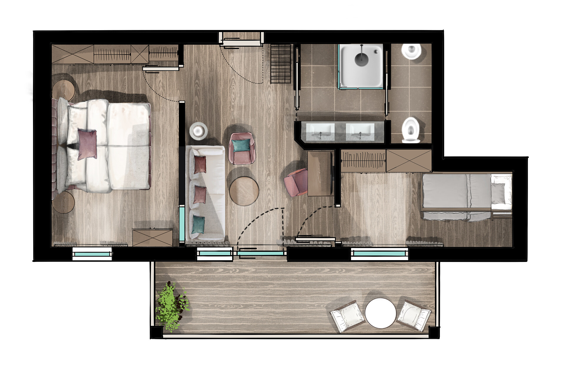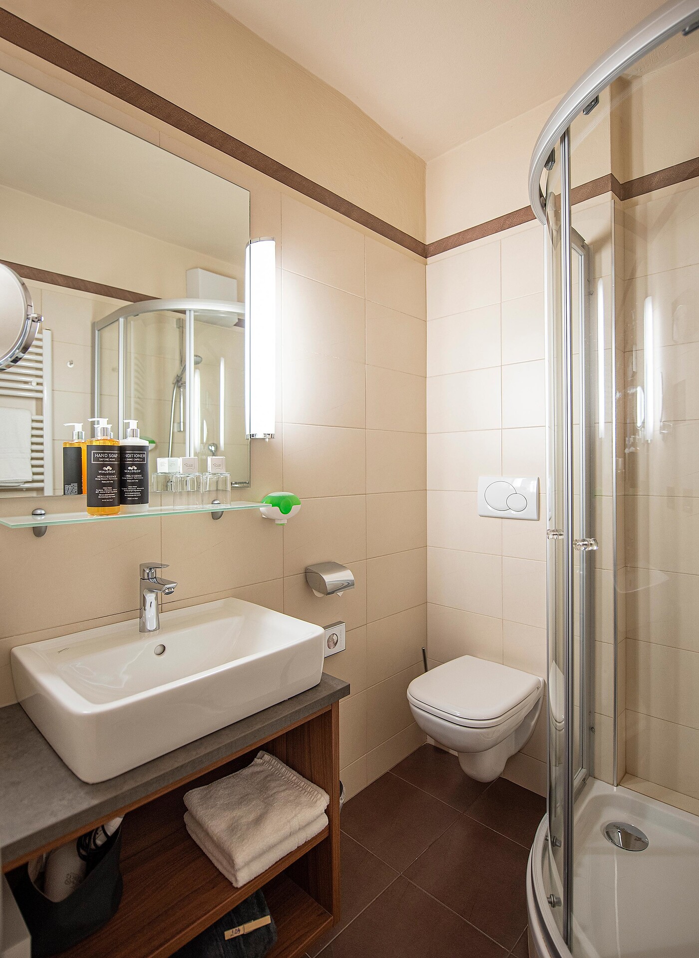 Caratteristiche: aria condizionata, pavimenti in vero legno, mobili in legno di abete rosso dell'Alto Adige, ampio balcone esposto a nord. Zona notte separata, zona giorno con divano e poltrona, letti a castello incassati (2 x 0,80 m) con protezione anticaduta su tutti i lati (come 2° posto letto per adulti senza letto superiore), scrivania, minibar, radio, lettore DVD, TV 50" a schermo piatto, 2° televisore in camera da letto, telefono, cassaforte in camera, connessione WLAN e I-Net gratuita. Bagno (8,5 m²) con finestra, asciugacapelli, accappatoio, doccia, prodotti per la cura (shampoo, balsamo per capelli, gel doccia, sapone per le mani) e zona WC separata con bidet. Pantofole da bagno (su richiesta alla reception). Posto auto in garage.