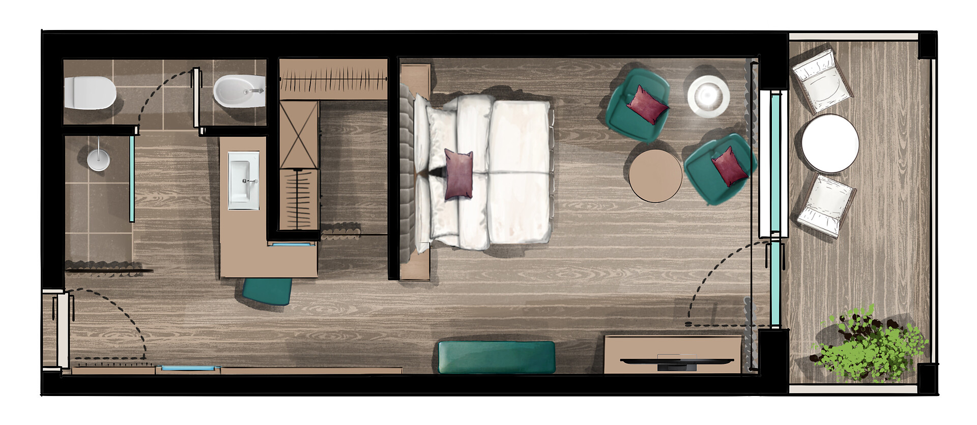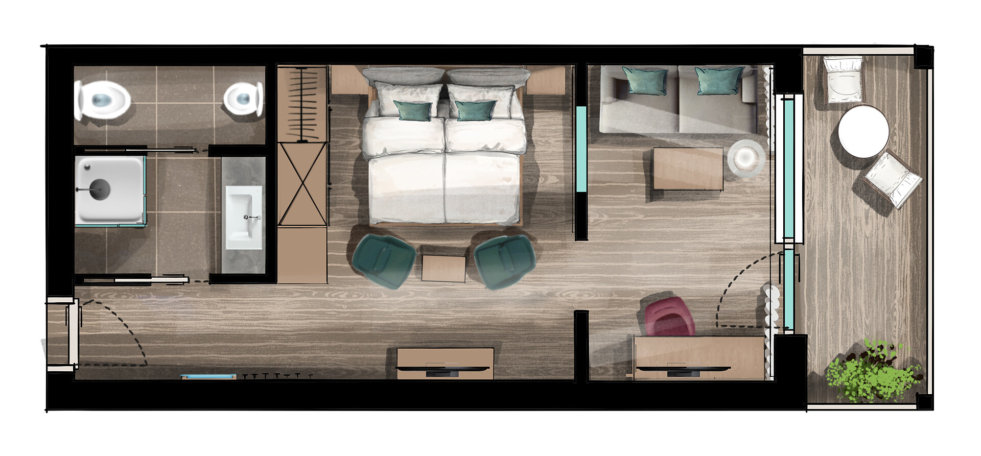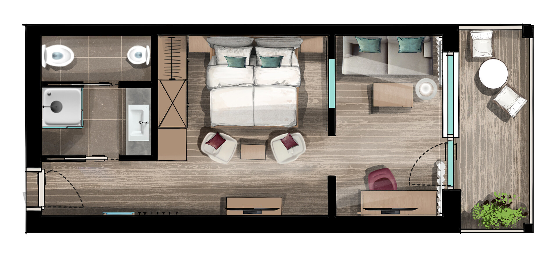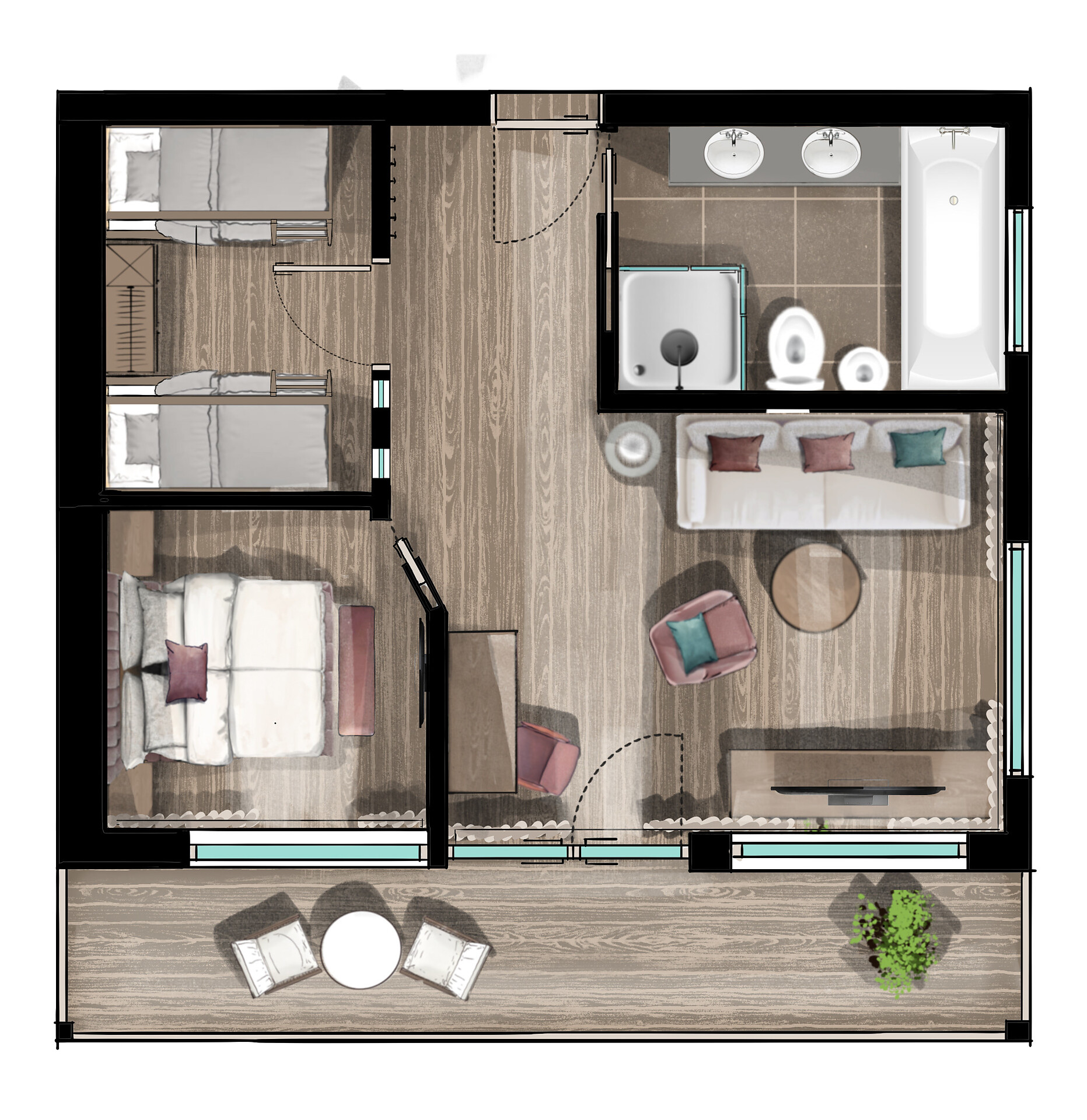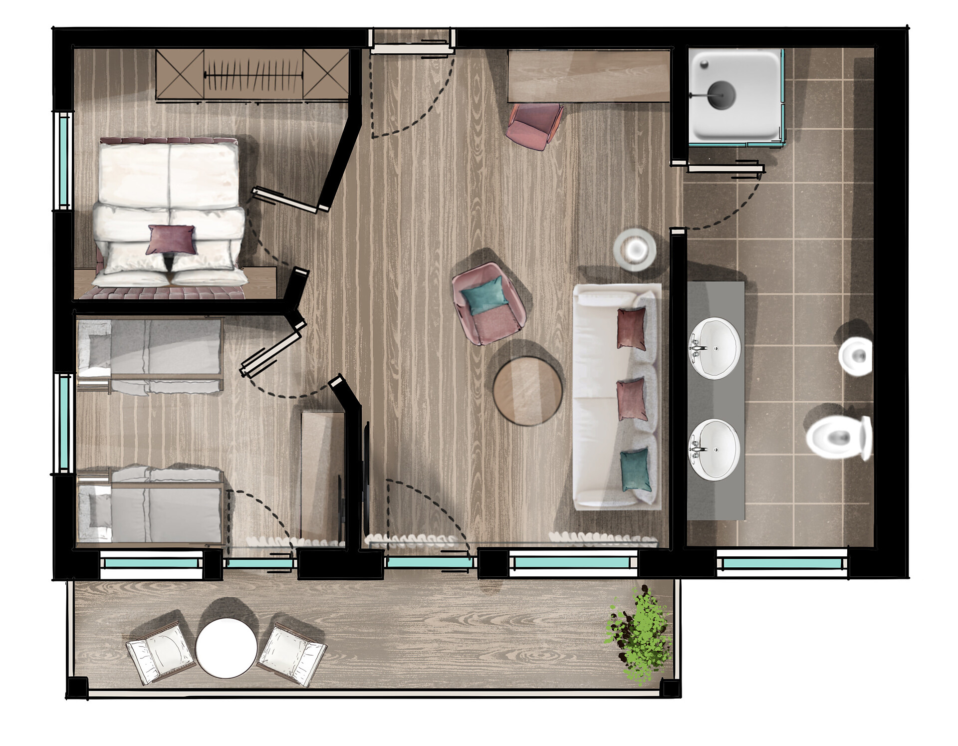 Caratteristiche: aria condizionata, pavimenti in vero legno, mobili in legno di abete rosso dell'Alto Adige, ampio balcone esposto a nord. Zona notte separata, zona giorno con divano e poltrona, letti a castello incassati (2 x 0,80 m) con protezione anticaduta su tutti i lati (come 2° posto letto per adulti senza letto superiore), scrivania, minibar, radio, lettore DVD, TV 50" a schermo piatto, 2° televisore in camera da letto, telefono, cassaforte in camera, connessione WLAN e I-Net gratuita. Bagno (8,5 m²) con finestra, asciugacapelli, accappatoio, doccia, prodotti per la cura (shampoo, balsamo per capelli, gel doccia, sapone per le mani) e zona WC separata con bidet. Pantofole da bagno (su richiesta alla reception). Posto auto in garage.