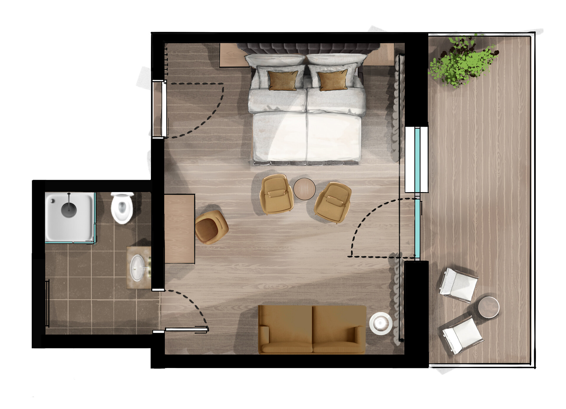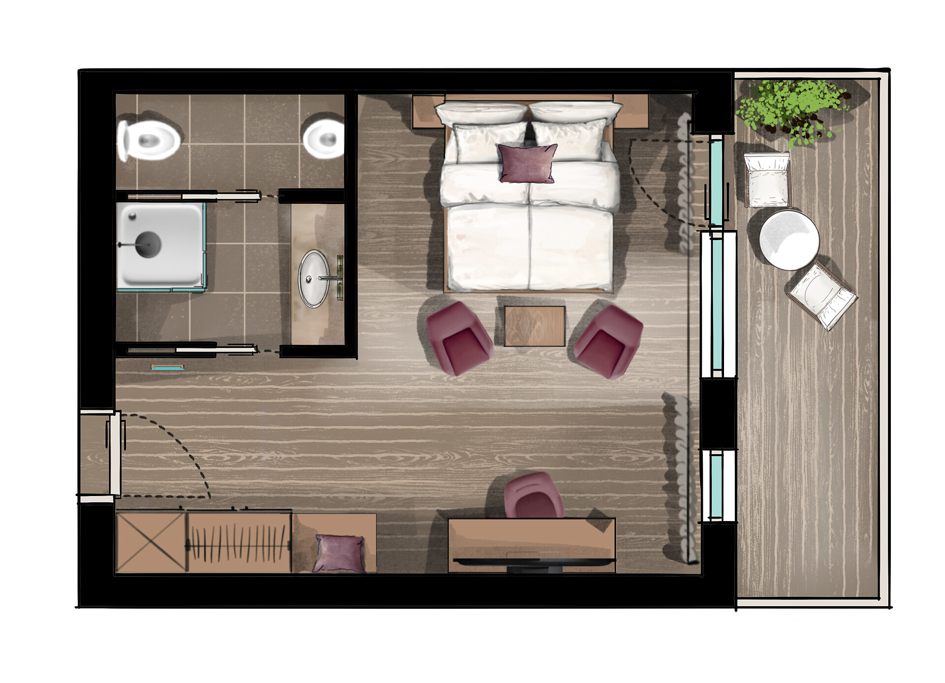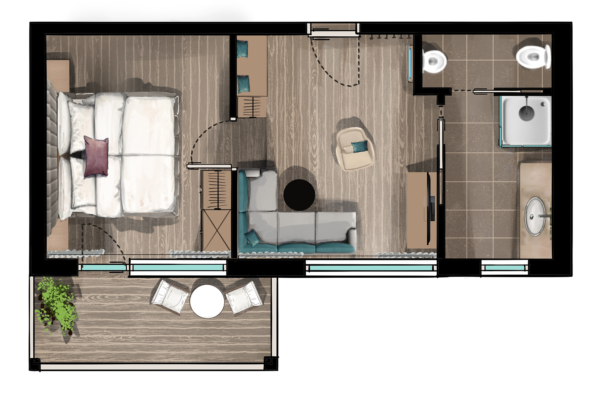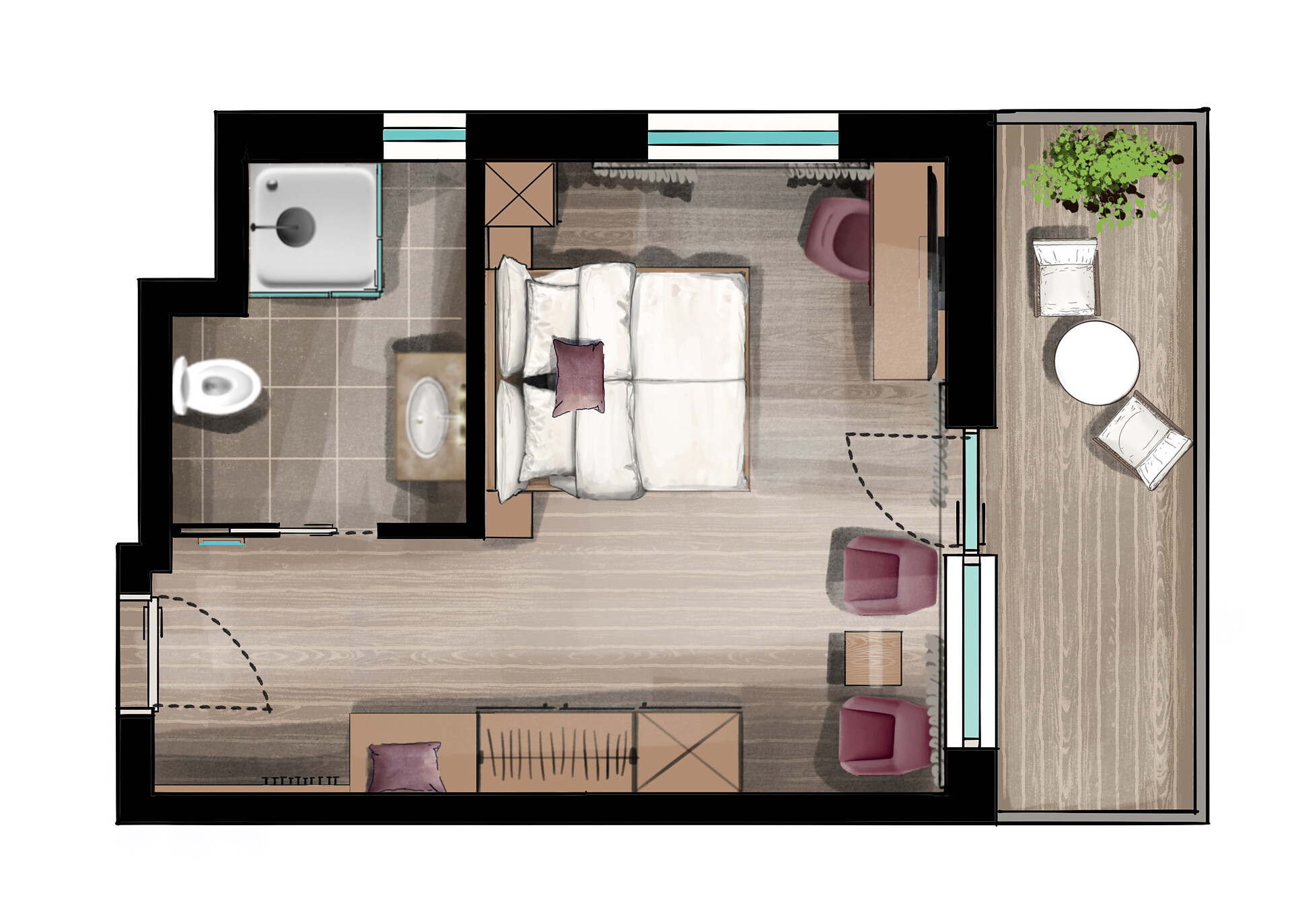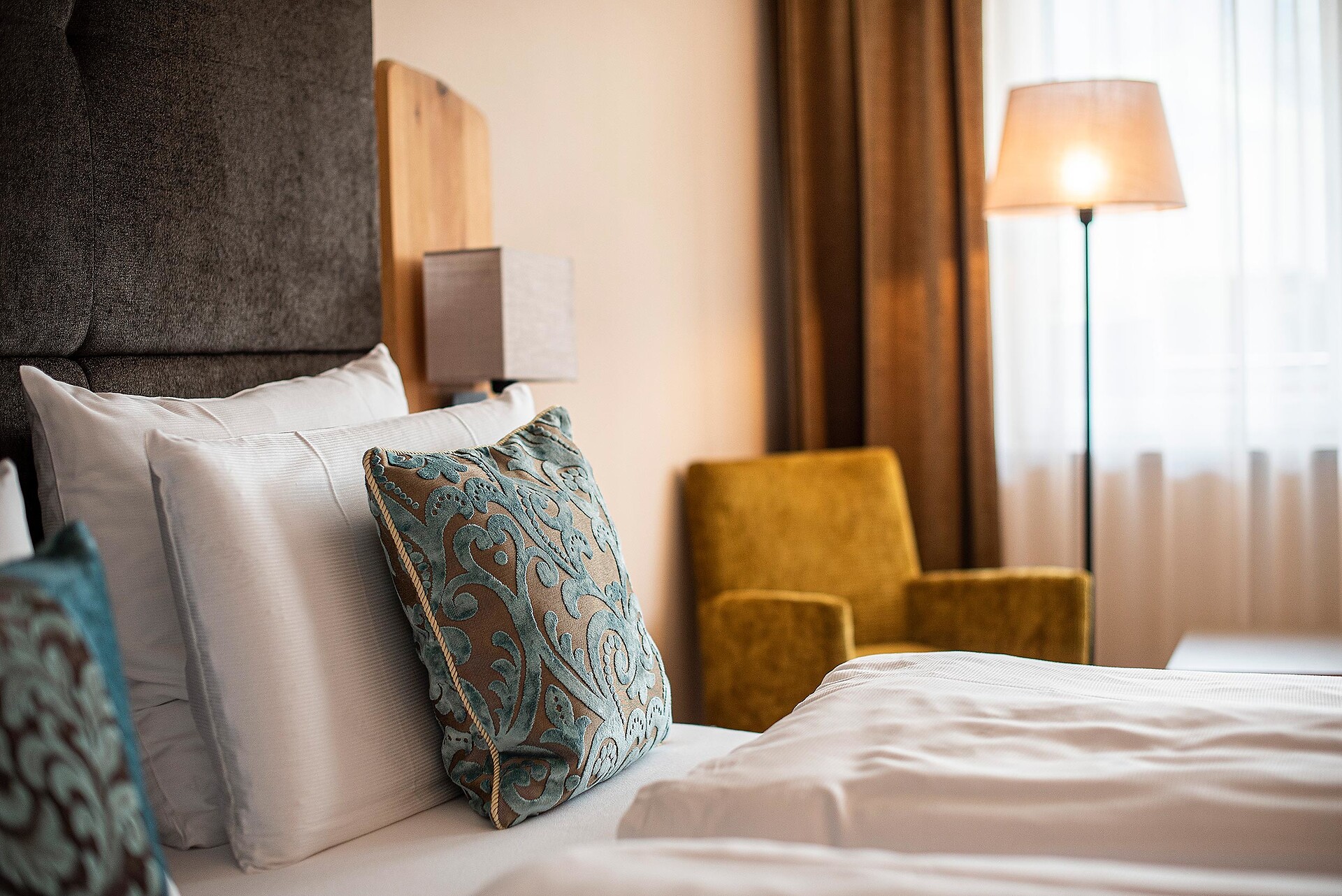 Caratteristiche: aria condizionata, pavimenti in vero legno, mobili in legno di abete rosso dell'Alto Adige, ampio balcone esposto a nord. Zona notte separata, zona giorno con divano e poltrona, letti a castello incassati (2 x 0,80 m) con protezione anticaduta su tutti i lati (come 2° posto letto per adulti senza letto superiore), scrivania, minibar, radio, lettore DVD, TV 50" a schermo piatto, 2° televisore in camera da letto, telefono, cassaforte in camera, connessione WLAN e I-Net gratuita. Bagno (8,5 m²) con finestra, asciugacapelli, accappatoio, doccia, prodotti per la cura (shampoo, balsamo per capelli, gel doccia, sapone per le mani) e zona WC separata con bidet. Pantofole da bagno (su richiesta alla reception). Posto auto in garage.
