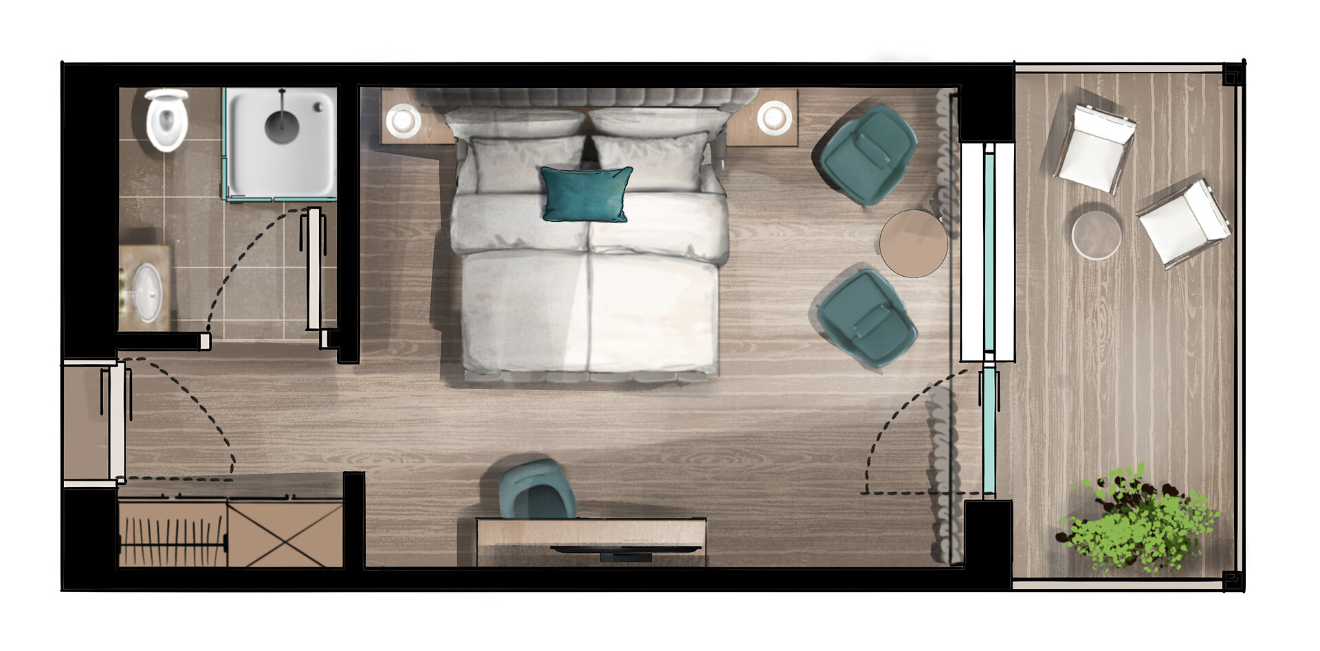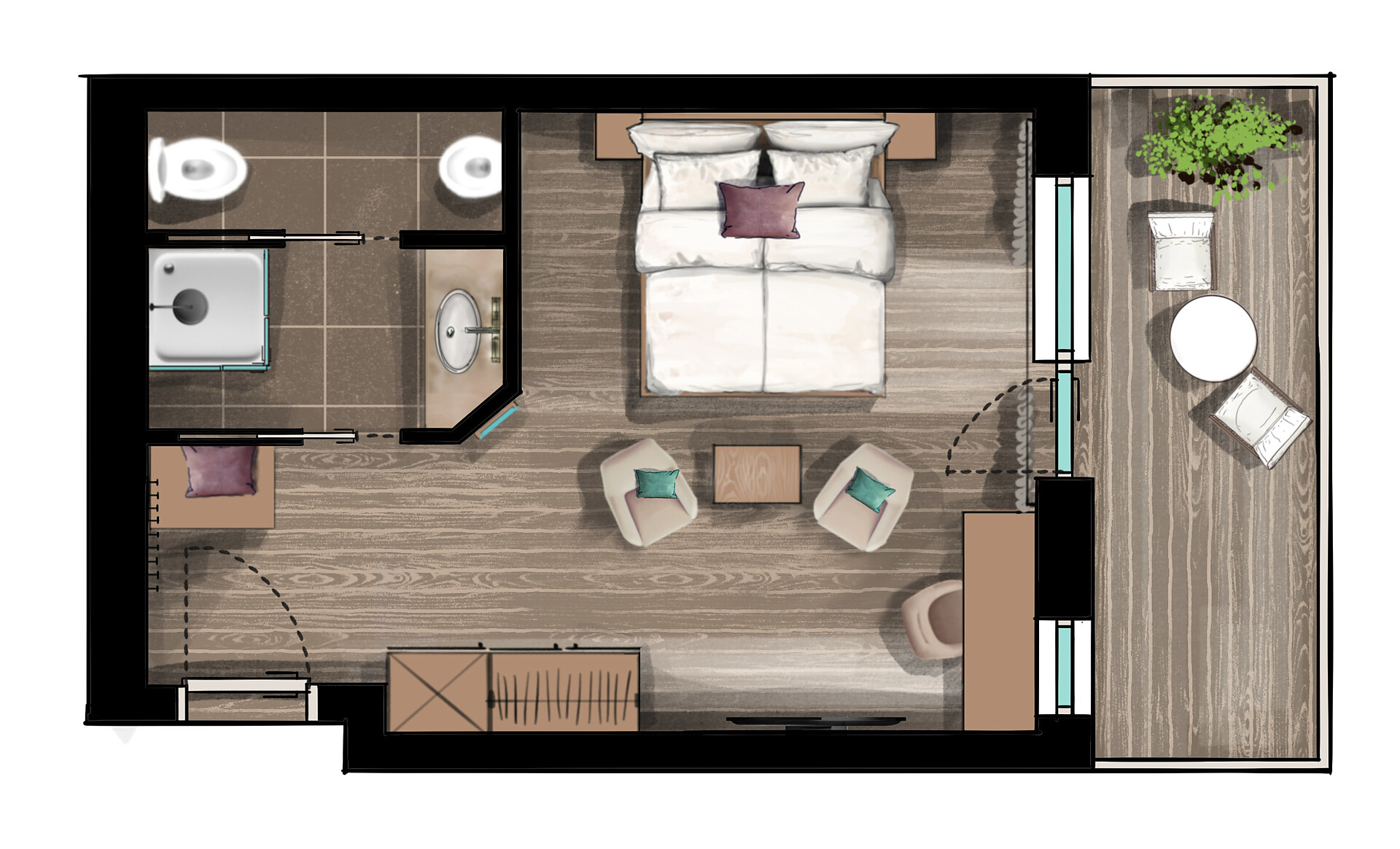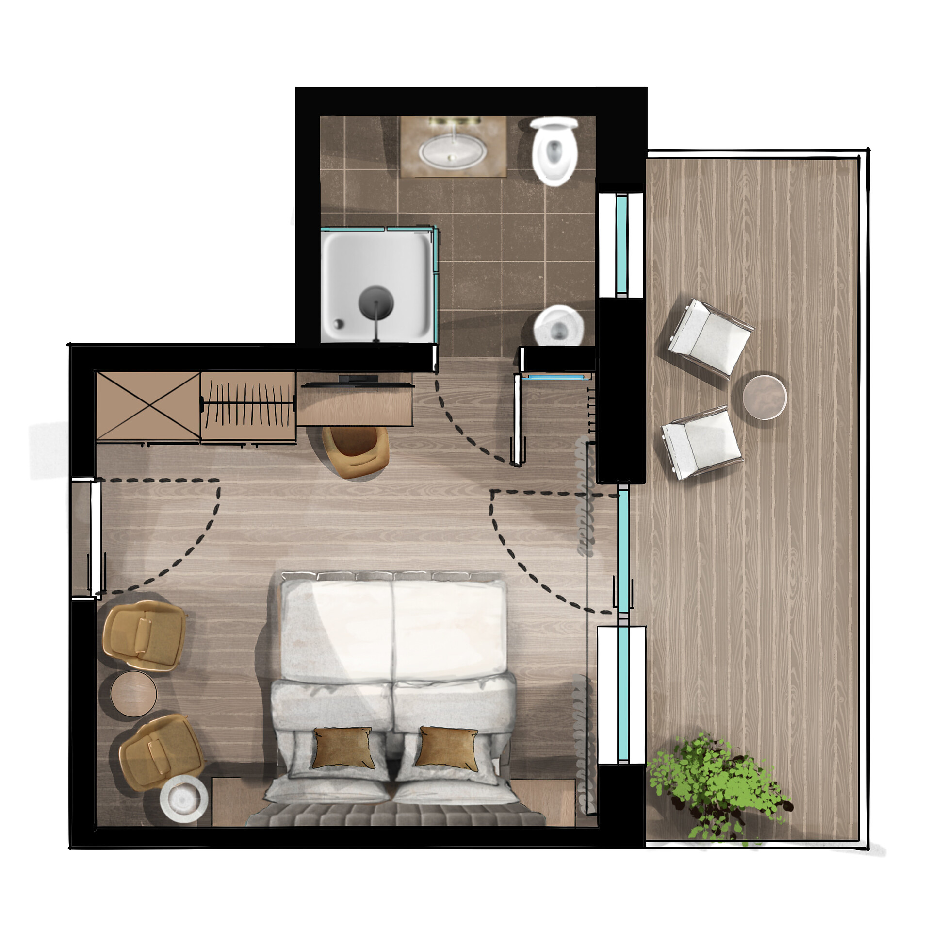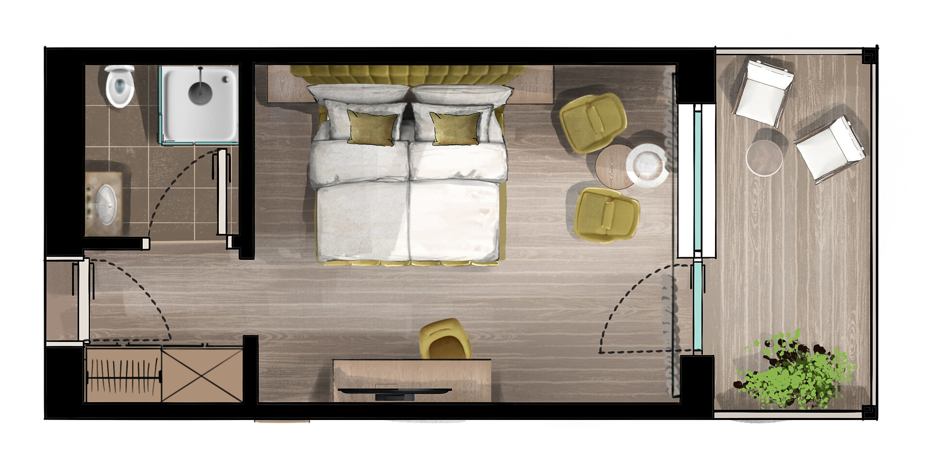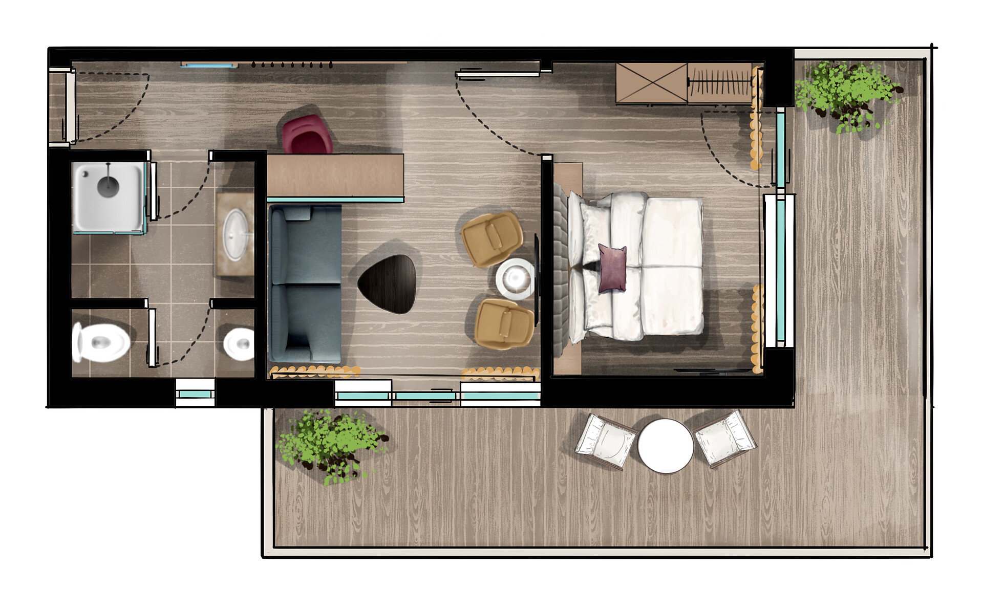 Caratteristiche: aria condizionata, pavimenti in vero legno, mobili in legno di abete rosso dell'Alto Adige, ampio balcone esposto a nord. Zona notte separata, zona giorno con divano e poltrona, letti a castello incassati (2 x 0,80 m) con protezione anticaduta su tutti i lati (come 2° posto letto per adulti senza letto superiore), scrivania, minibar, radio, lettore DVD, TV 50" a schermo piatto, 2° televisore in camera da letto, telefono, cassaforte in camera, connessione WLAN e I-Net gratuita. Bagno (8,5 m²) con finestra, asciugacapelli, accappatoio, doccia, prodotti per la cura (shampoo, balsamo per capelli, gel doccia, sapone per le mani) e zona WC separata con bidet. Pantofole da bagno (su richiesta alla reception). Posto auto in garage.