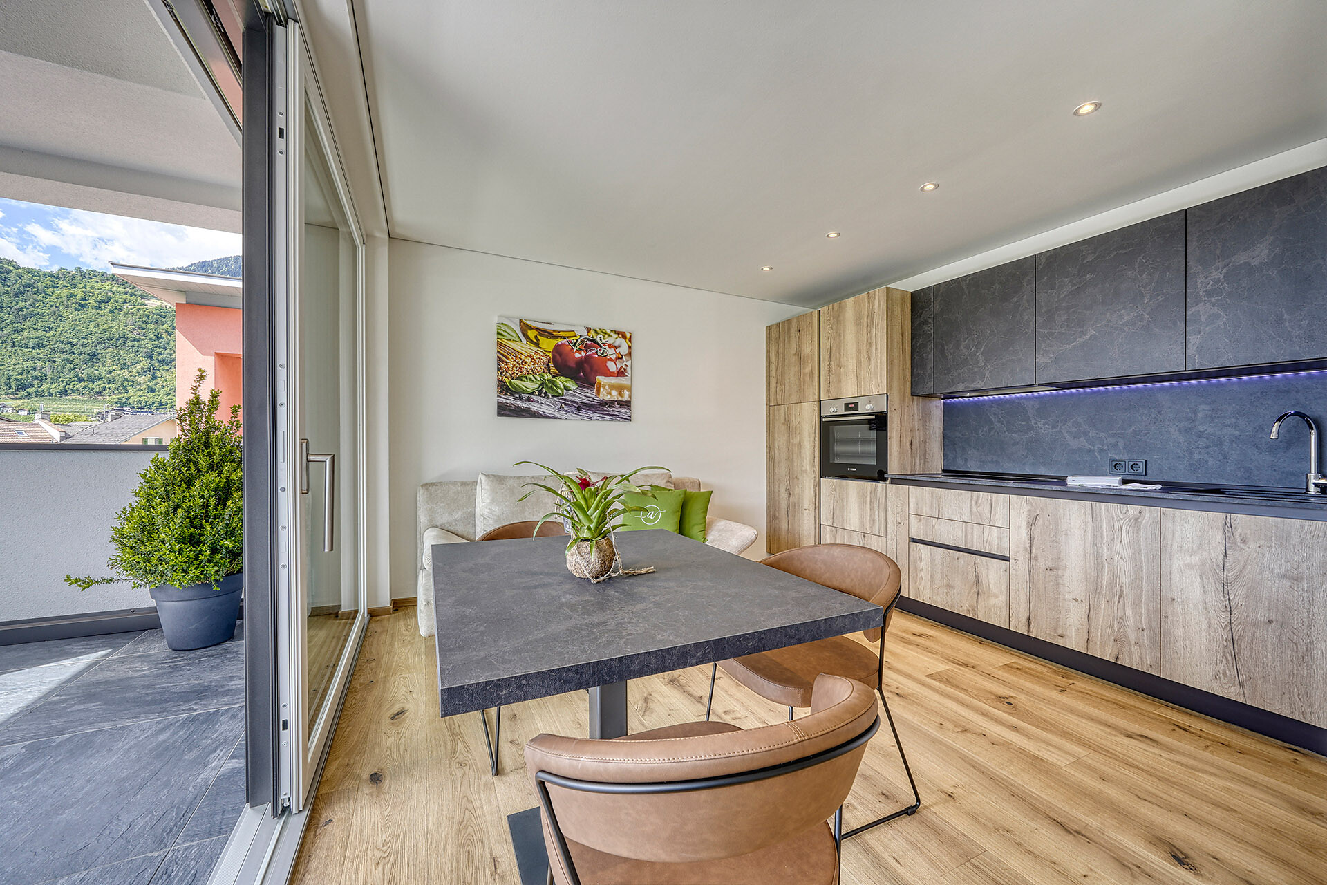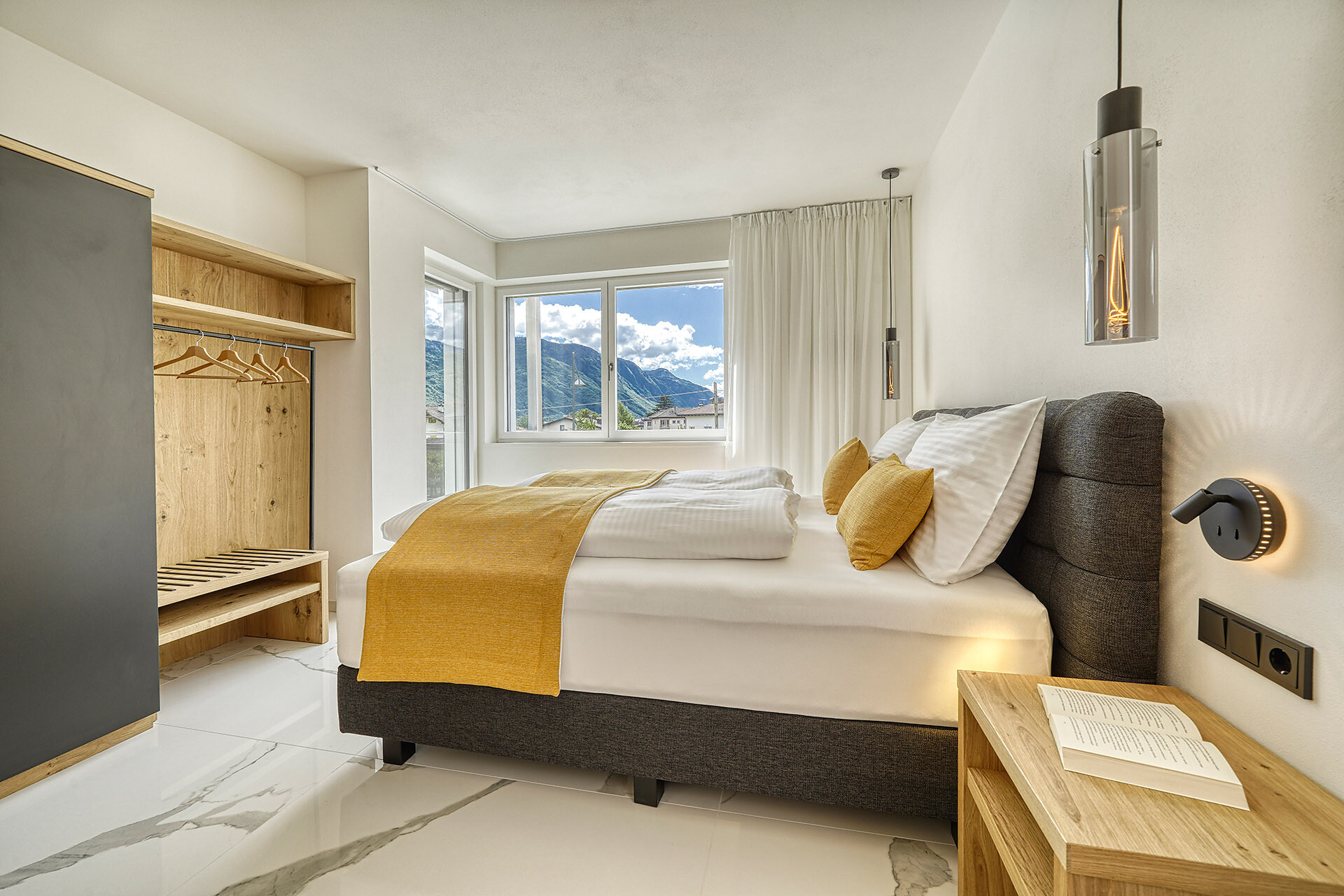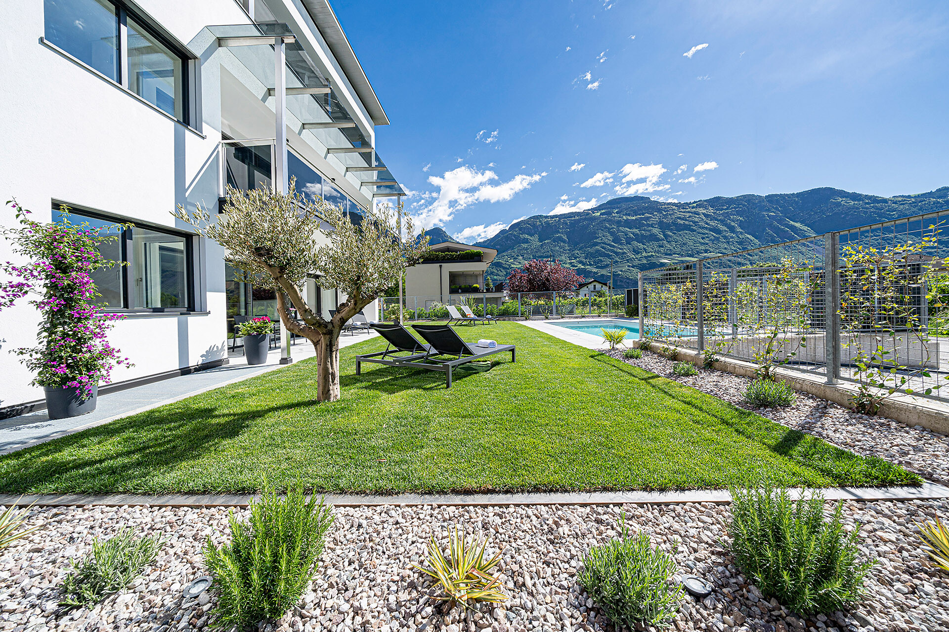 Tanto spazio per sognare, vivere, godersi. L'appartamento "Garden" è la casa vacanza giusta per le famiglie e gli amanti del giardino. Dotato nella zona d'ingresso di un armadio con scarpiera, 2 camere matrimoniali separate con letti boxspring 180x200 cm, lampada da lettura e armadio, oltre a 2 bagni con doccia a pioggia, cascata, lavabo e wc. La spaziosa cucina abitabile è composta da frigo-congelatore, forno e lavastoviglie Bosch, piano cottura a induzione Elica con cappa aspirante, tostapane, bollitore, macchina da caffè, macchina da caffè NESPRESSO, pentole e posate WMF, utensili da cucina, bicchieri, stoviglie, grande tavolo da pranzo con quattro posti, divano letto allungabile con materasso in memory foam (140x200x21 cm) e TV satellitare, garantiscono la giusta intimitá a ogni membro della famiglia. L'ampia terrazza (27 m2) con tavolo e lettini offre accesso diretto al giardino con piscina. Da lì si può godere della splendida vista sulle montagne circostanti. Questo appartamento ha accesso diretto al parcheggio sotterraneo.