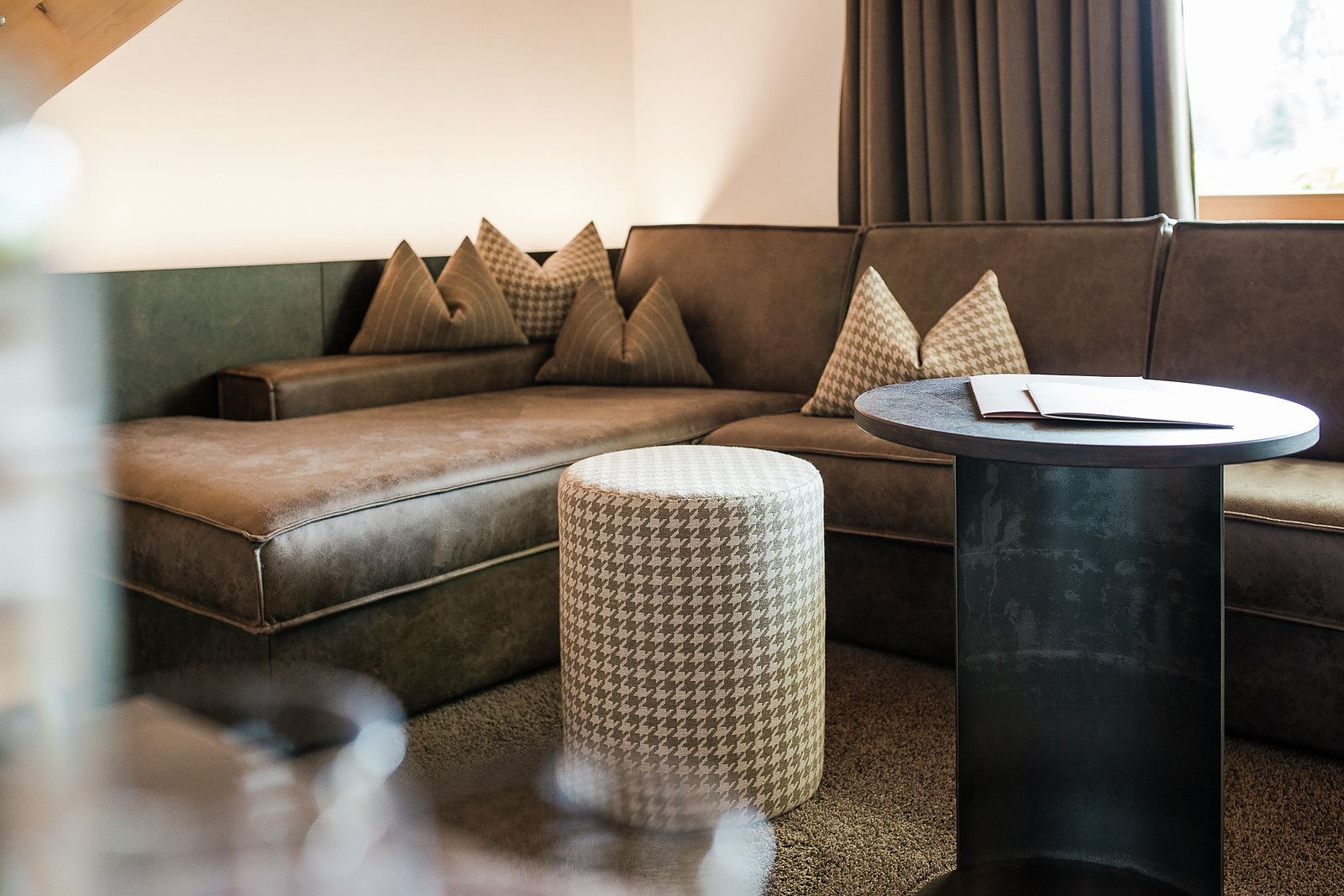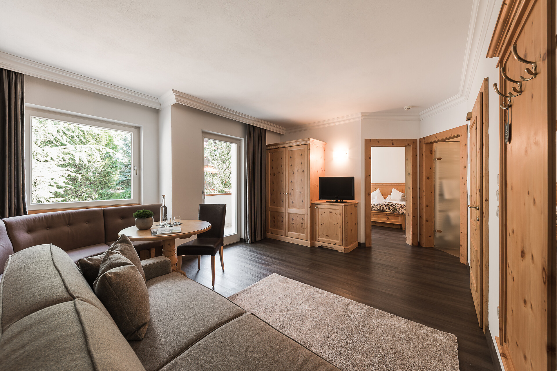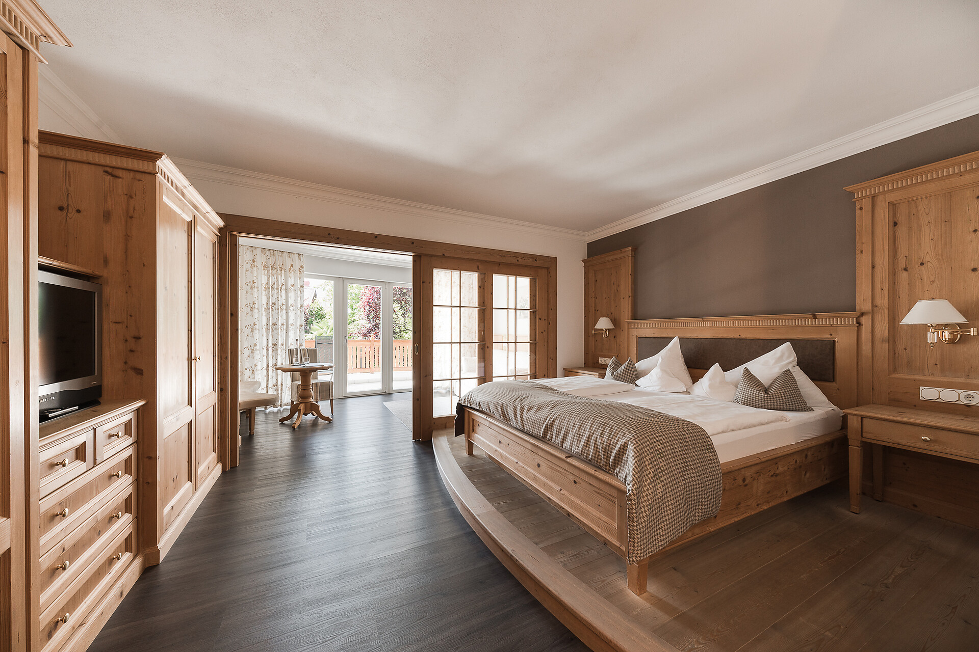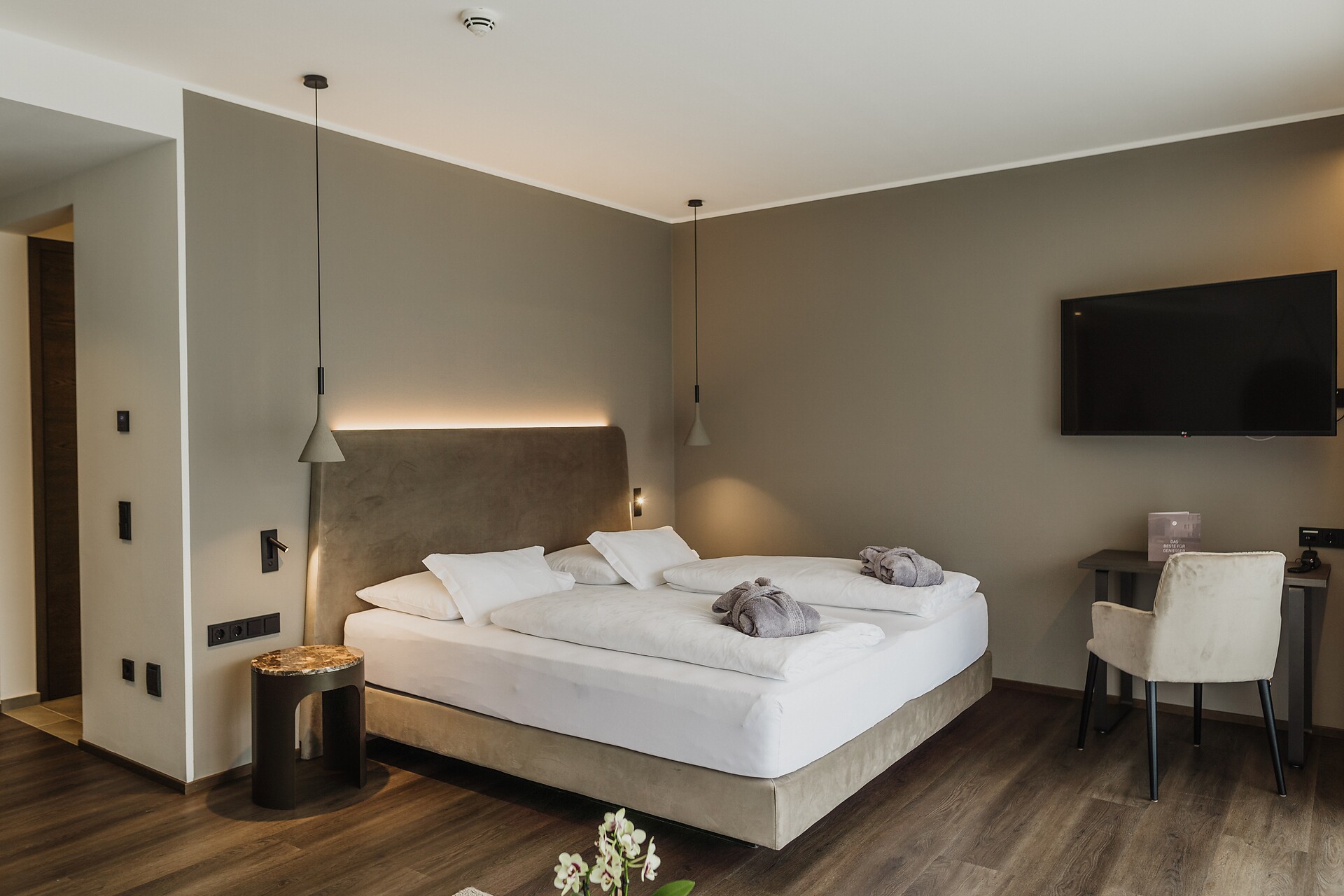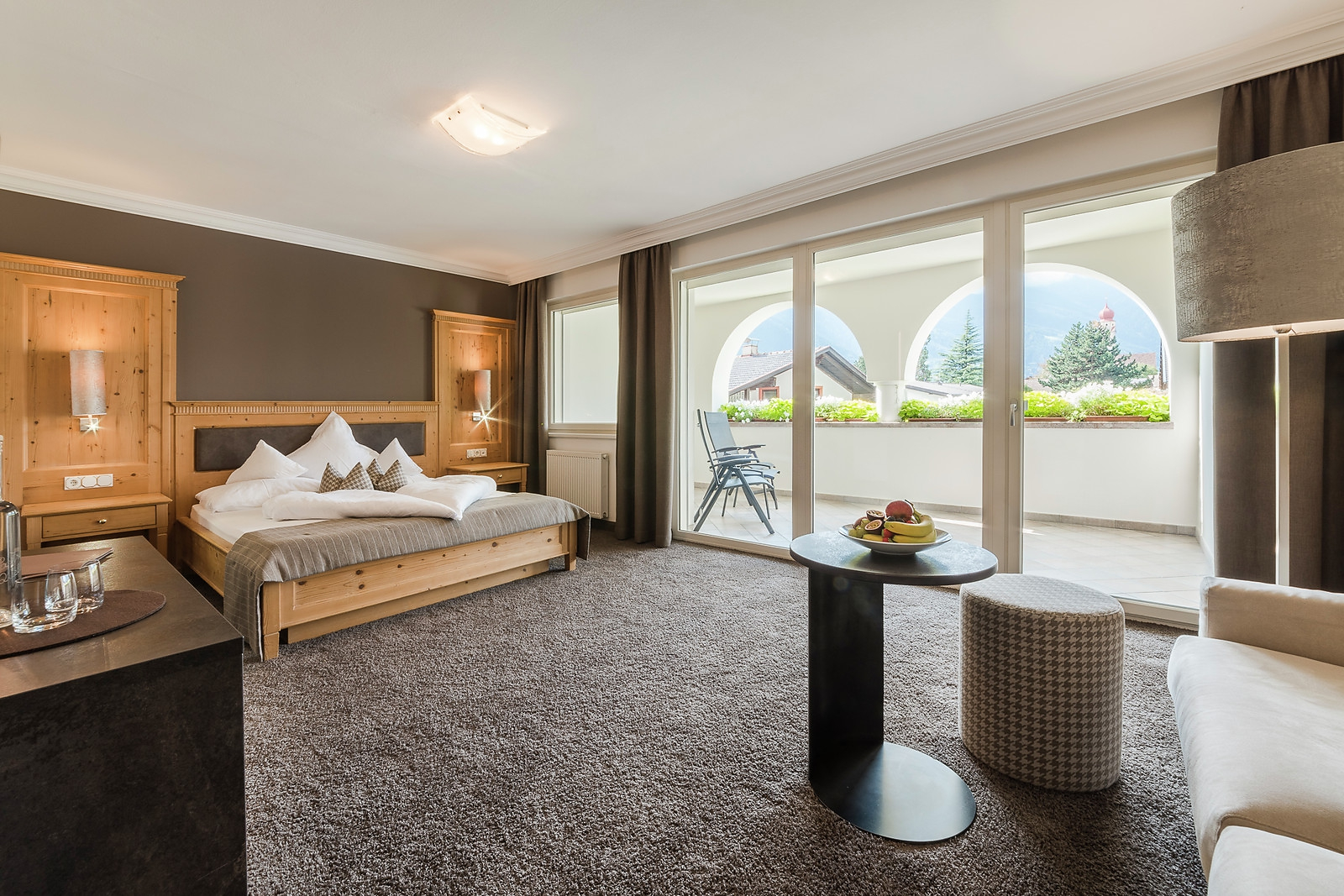 Suite „lussuosa“ (ca. 43 m²) accogliente e moderna con materassi boxspring e aria condizionata situato al primo o secondo piano. Arredamento in materiali naturali, pavimento in legno naturale, divano, scrivania, bagno aperto, doccia, WC separato, tv a schermo piatto, cassaforte, telefono, fon, frigobar, borsa wellness con accappatoio e telo per la sauna. Posto macchina in garage. La Suite è accessibile ai disabili.