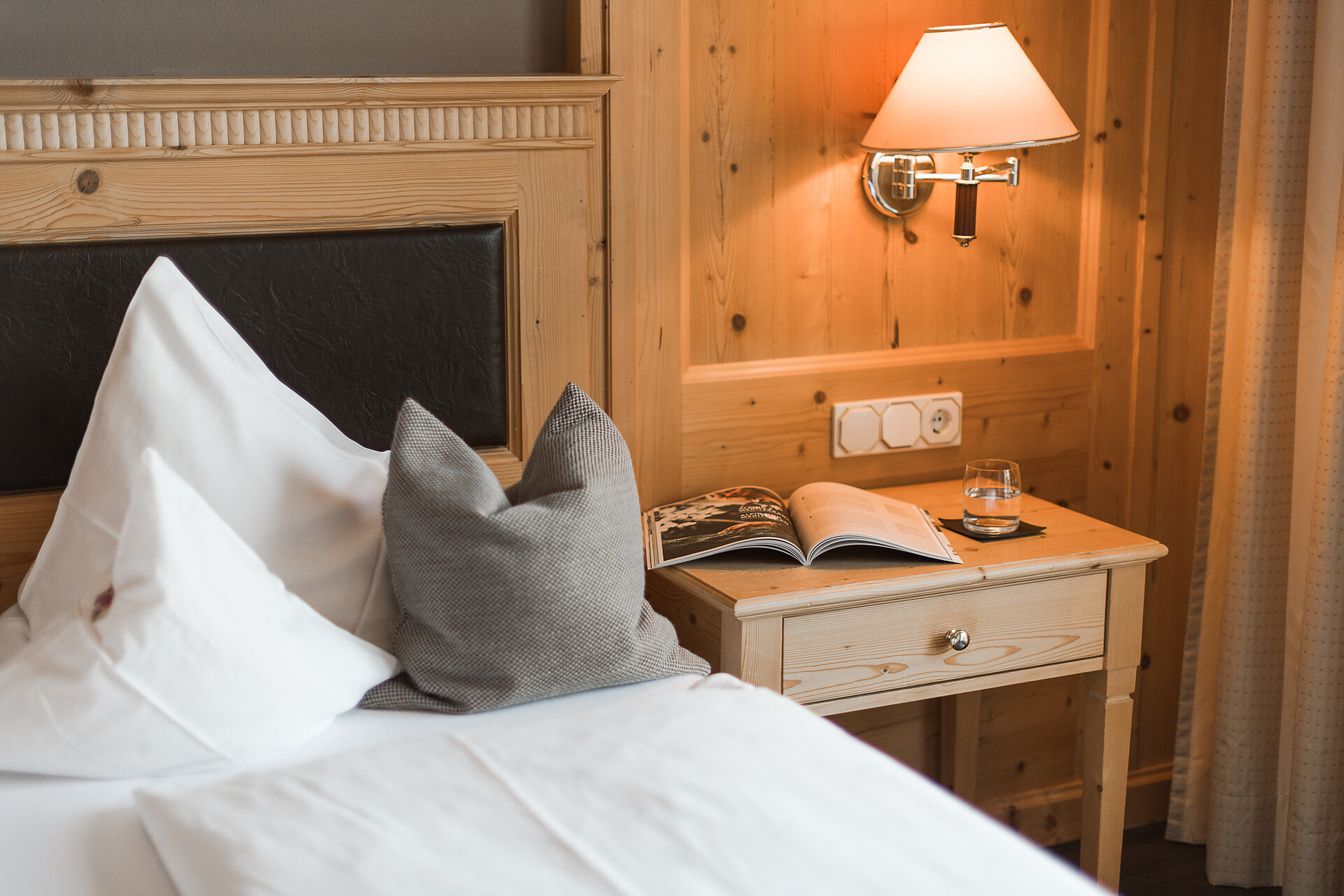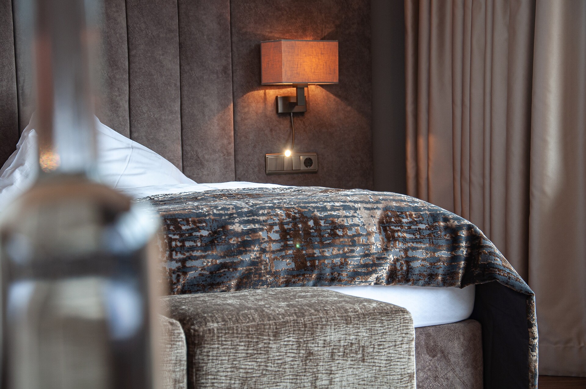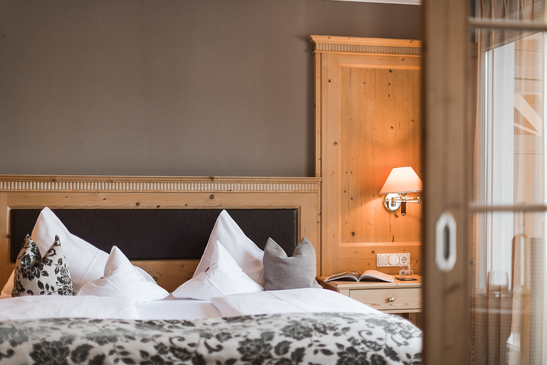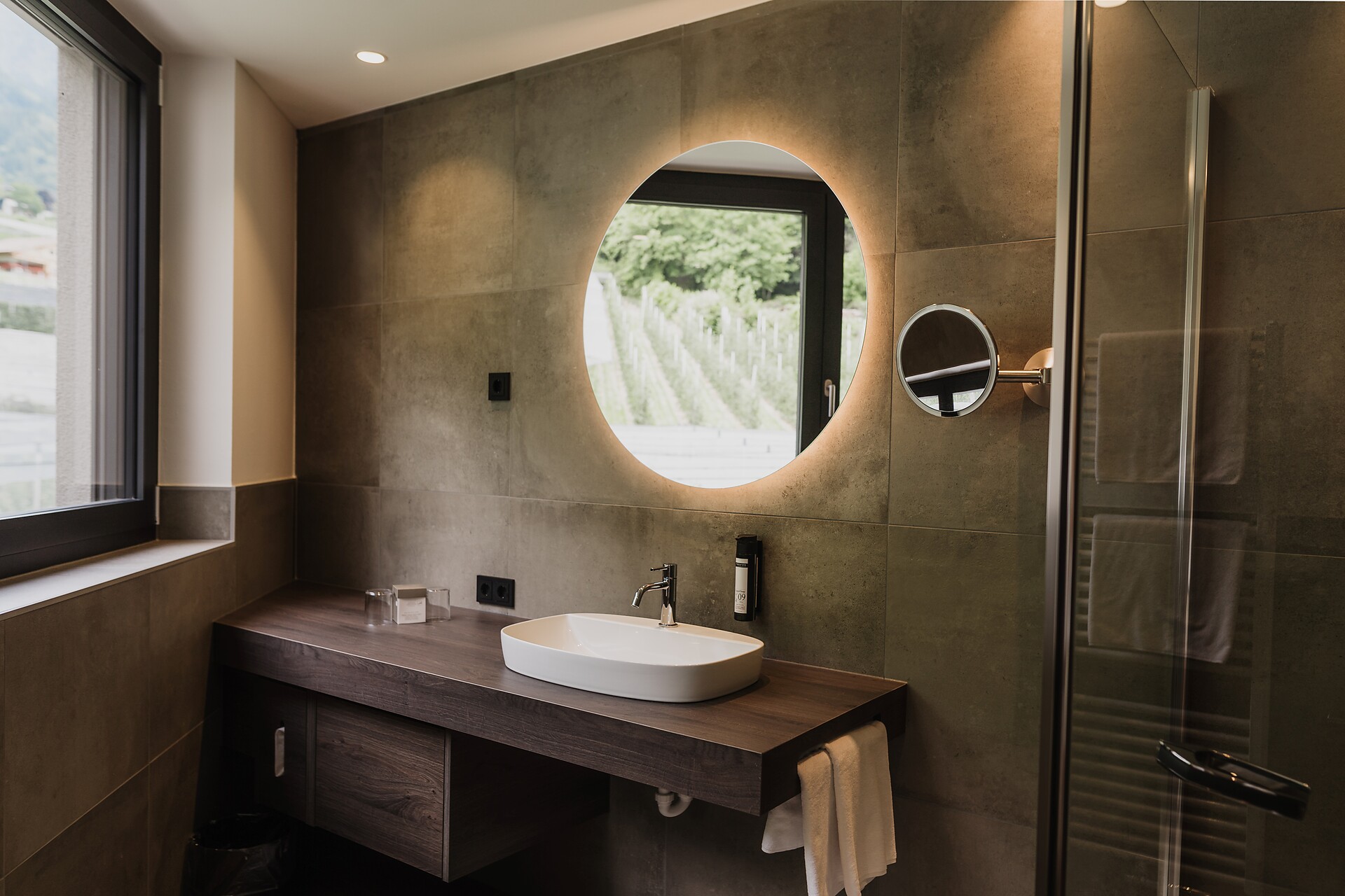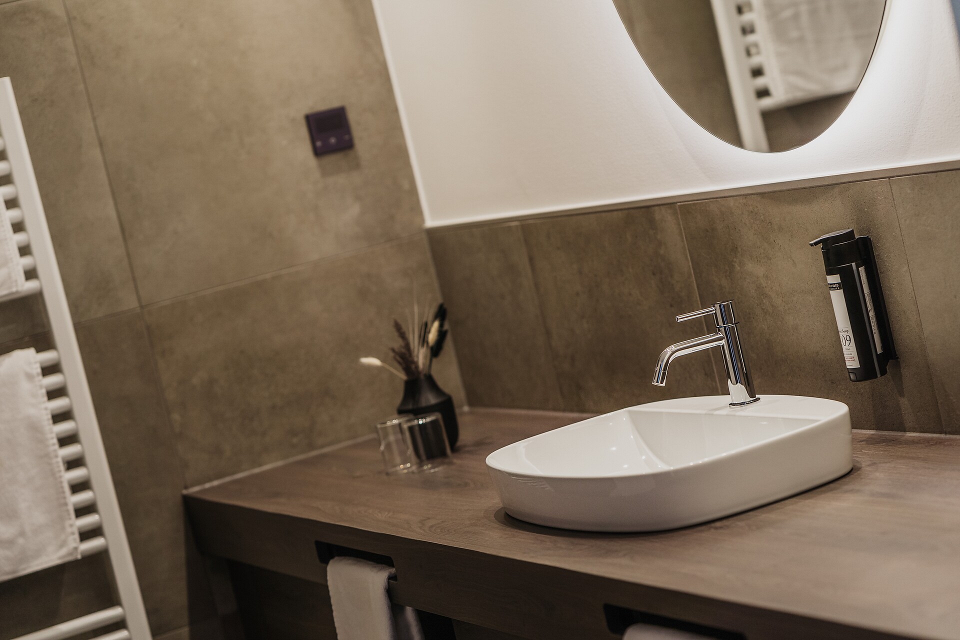 Suite „lussuosa“ (ca. 43 m²) accogliente e moderna con materassi boxspring e aria condizionata situato al primo o secondo piano. Arredamento in materiali naturali, pavimento in legno naturale, divano, scrivania, bagno aperto, doccia, WC separato, tv a schermo piatto, cassaforte, telefono, fon, frigobar, borsa wellness con accappatoio e telo per la sauna. Posto macchina in garage. La Suite è accessibile ai disabili.