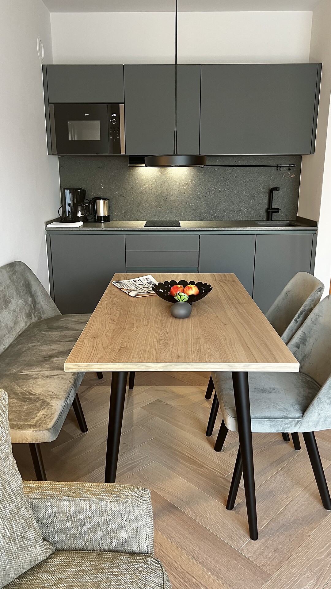 NUOVO: pavimento in rovere oleato biologicalmente, letto matromoniale boxspring di alta qualitá 1,80 m, divano, zona pranzo, TV 50", dab-radio, telefono, cassaforte, cucina con lavastoviglie, mircoonde, 4 piastre, frigo, bancone con sgabelli da bar, bagno con doccia, bidet, wc, fon, grande balcone lato sud 10 m² con panca, tavolo e 2 sedie, 2 sdrai ergonomici, ombrellone, Wifi, stendipanni