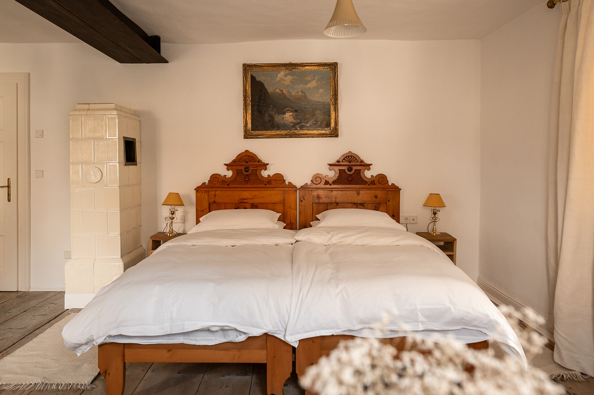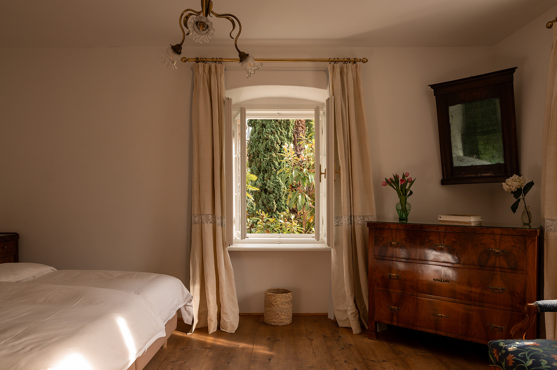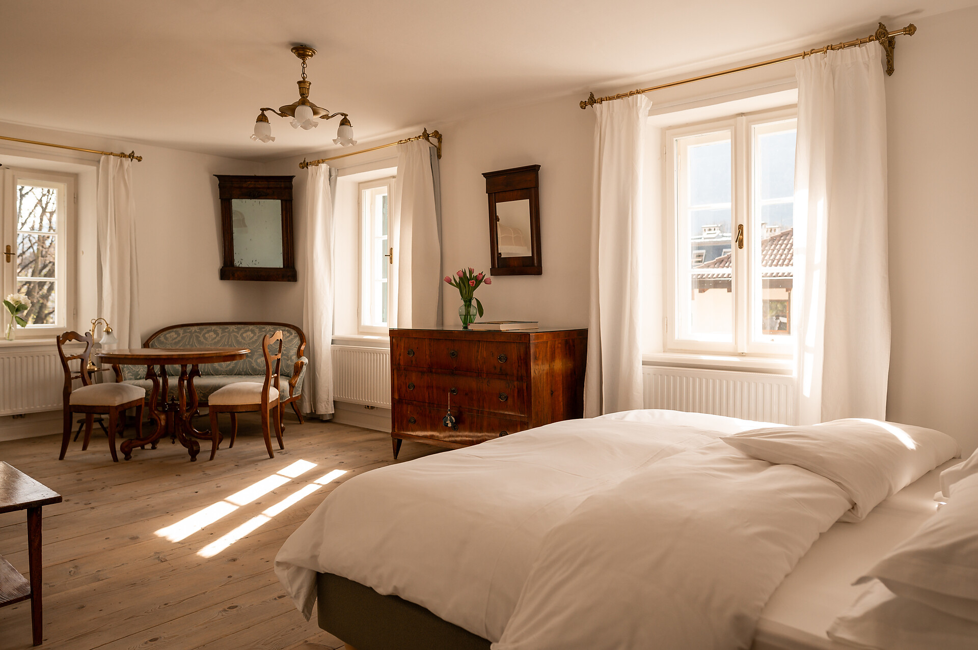 Questa splendida camera assolata in stile Biedermeier costituisce una soluzione particolarmente gradita agli ospiti che amano vivere la storia. La sua posizione angolare rispetto alla casa fa sì che di tardo pomeriggio i raggi del sole illuminino i vecchi listoni del pavimento, addolcendo i contorni e infondendo l’ambiente di un senso di calda accoglienza.