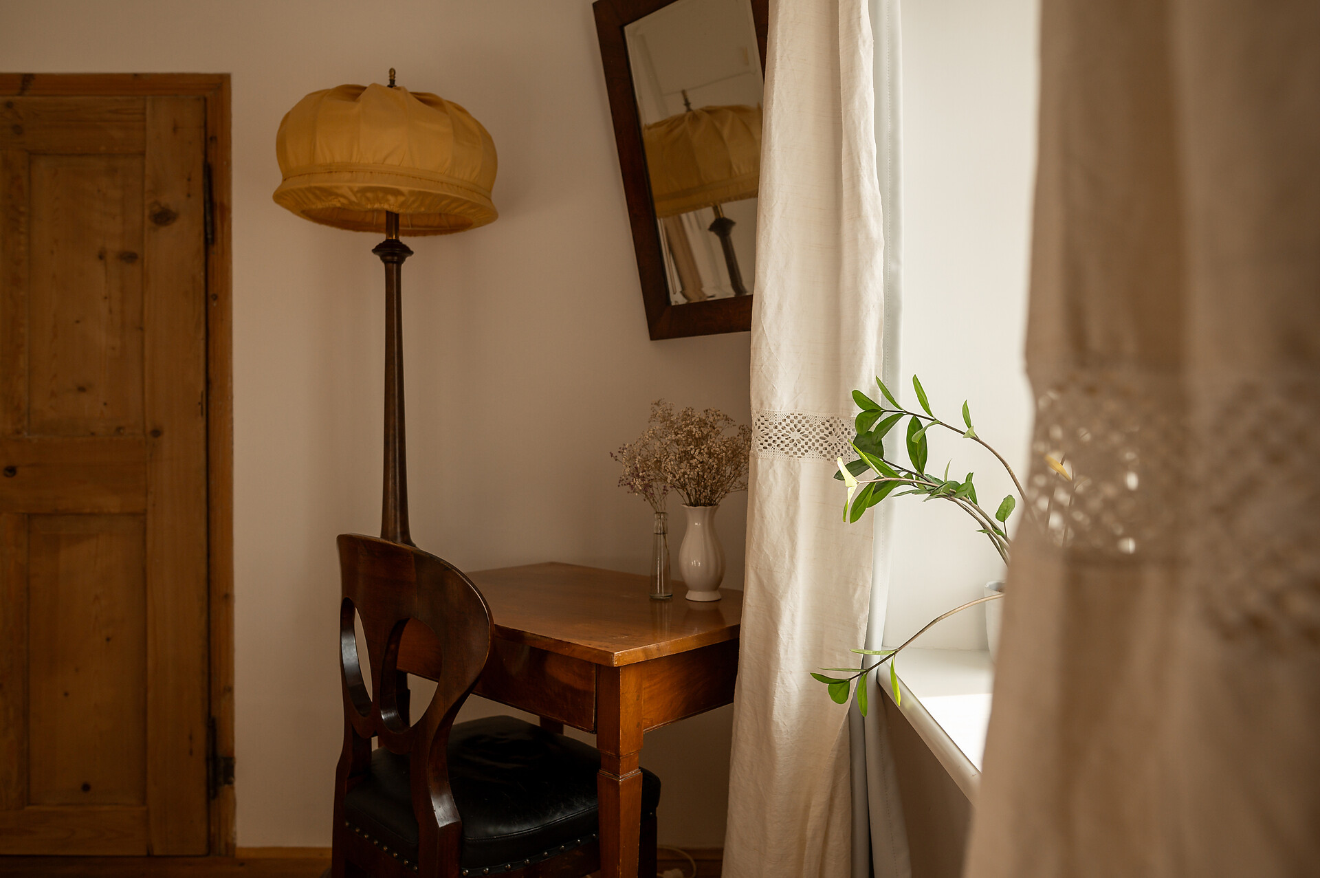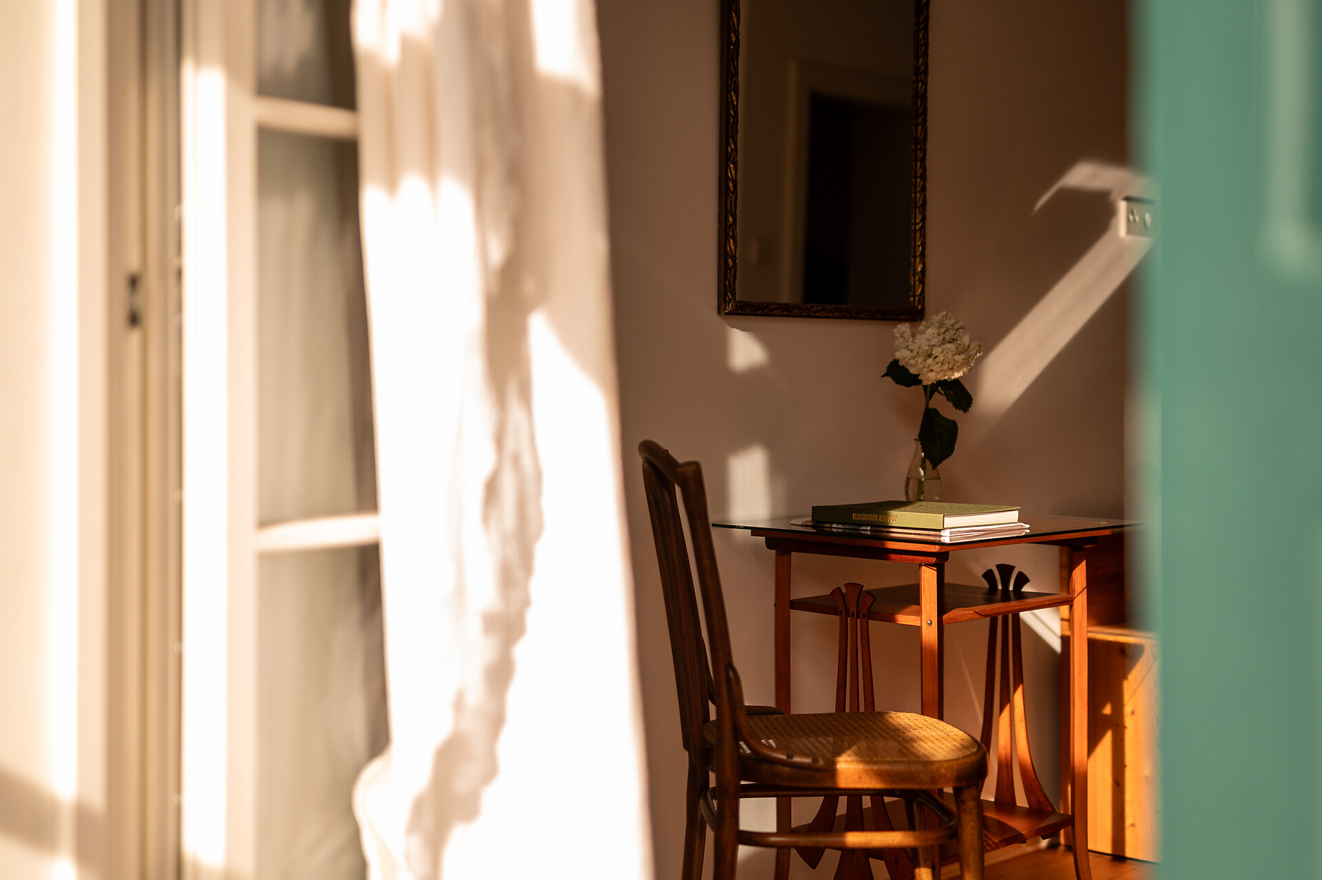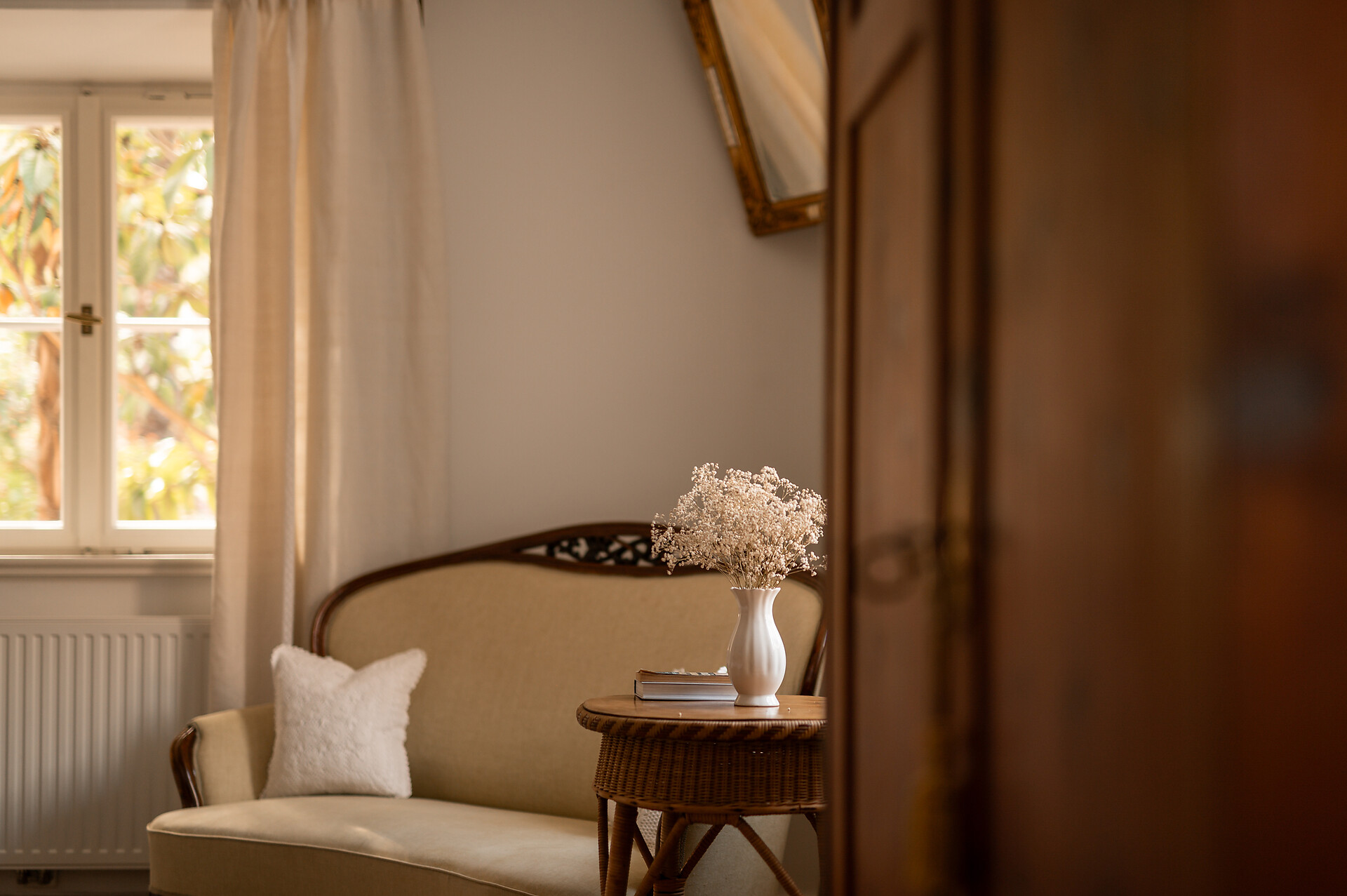 Questa splendida camera assolata in stile Biedermeier costituisce una soluzione particolarmente gradita agli ospiti che amano vivere la storia. La sua posizione angolare rispetto alla casa fa sì che di tardo pomeriggio i raggi del sole illuminino i vecchi listoni del pavimento, addolcendo i contorni e infondendo l’ambiente di un senso di calda accoglienza.