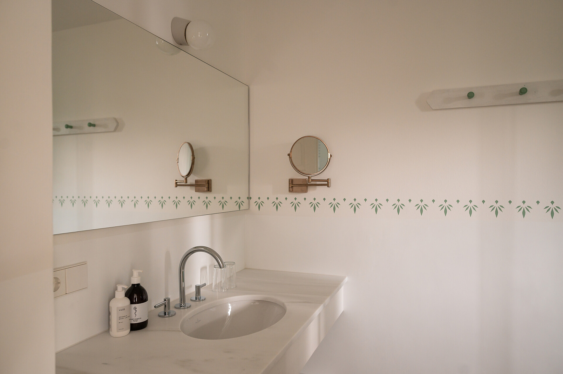 In questa camera si riflettono le diverse gradazioni di verde del giardino. La grande terrazza pertinente alla camera, convoglia la natura all’interno della camera. Sulle antiche doghe, componenti moderne trasportano la mobilia d’epoca giuseppina al tempo presente.