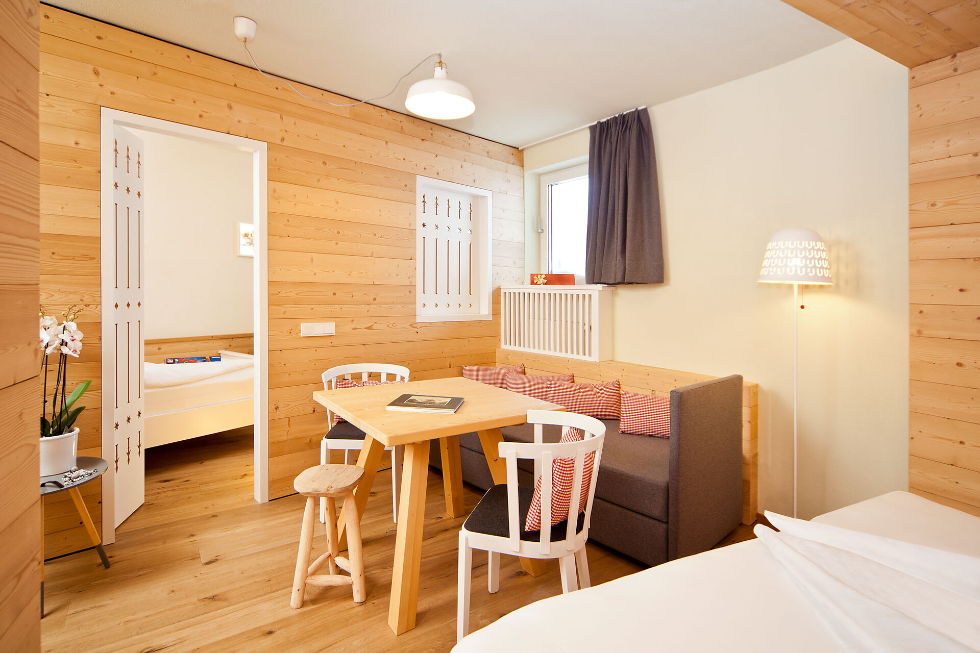 Oltre al comodo letto matrimoniale, la camera dispone anche di un pratico divano letto – perfetto per rilassarsi con un buon libro o come posto letto aggiuntivo per un bambino.