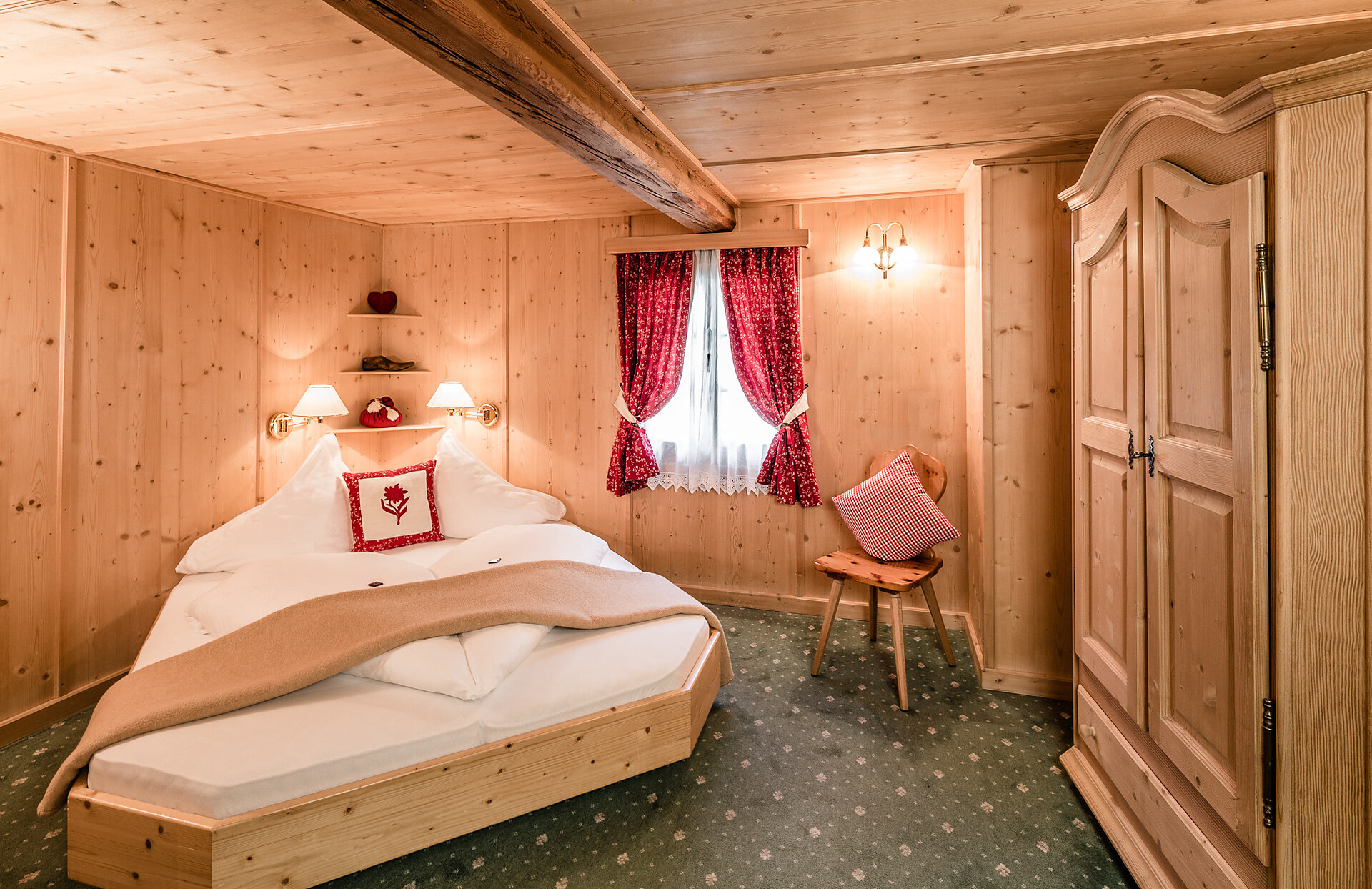 Come già ci svela il nome una camera tradizionale rivestita di cirmolo. Già dall’anno 1900 questa camera era la camera dei ospiti per l’estate- gente di città che veniva a fare vacanza in montagna. Dal balcone si ha una magnifica vista sul gruppo tessa.