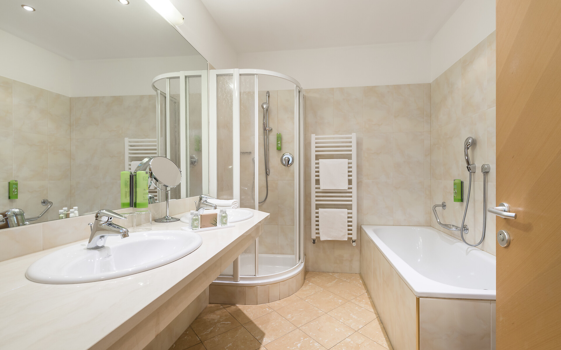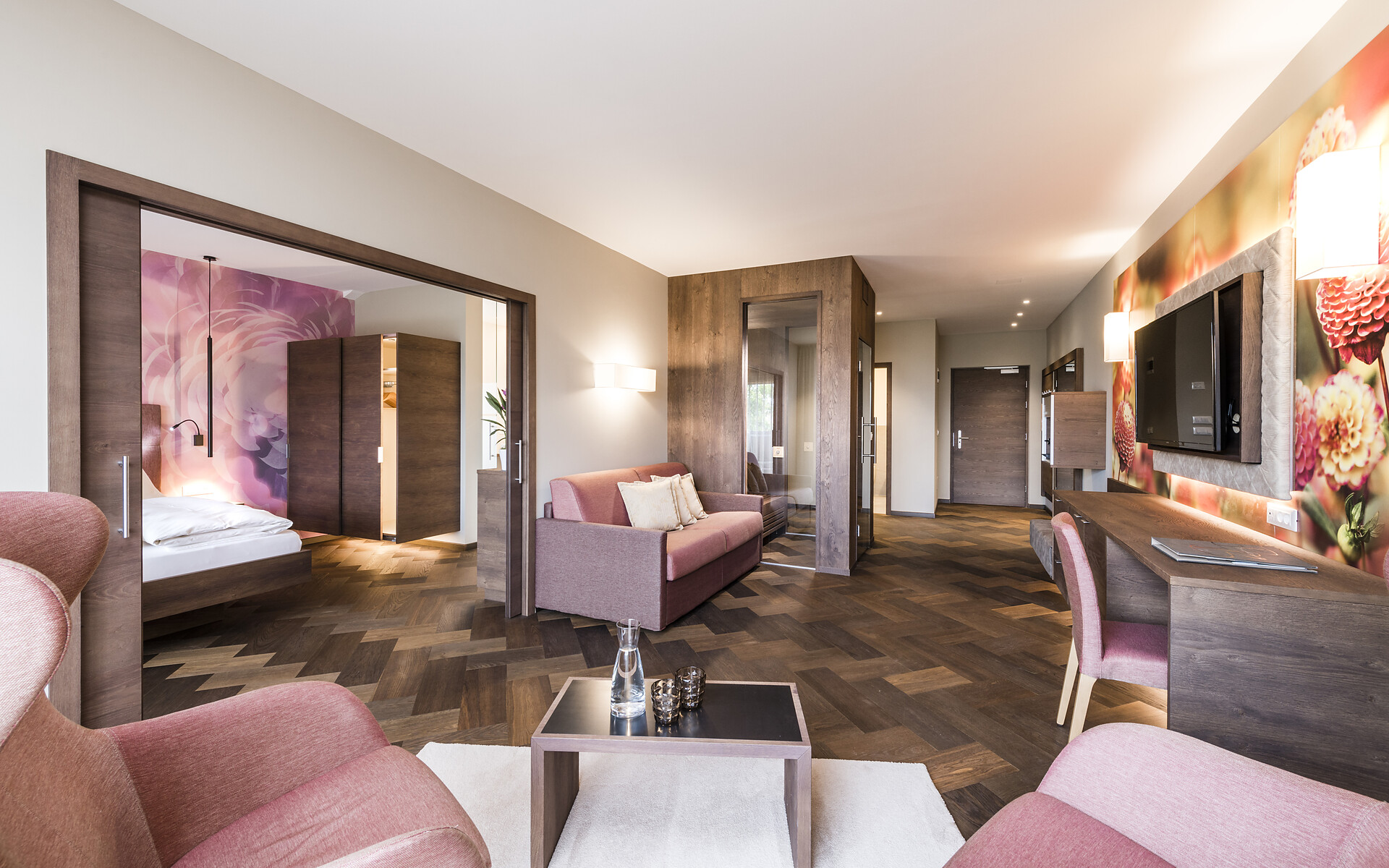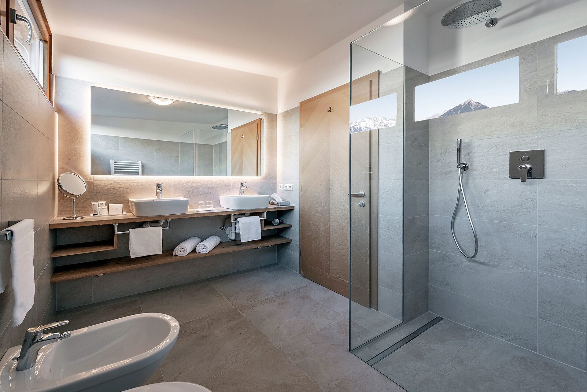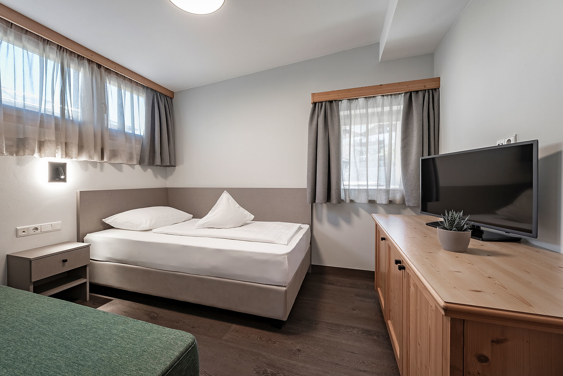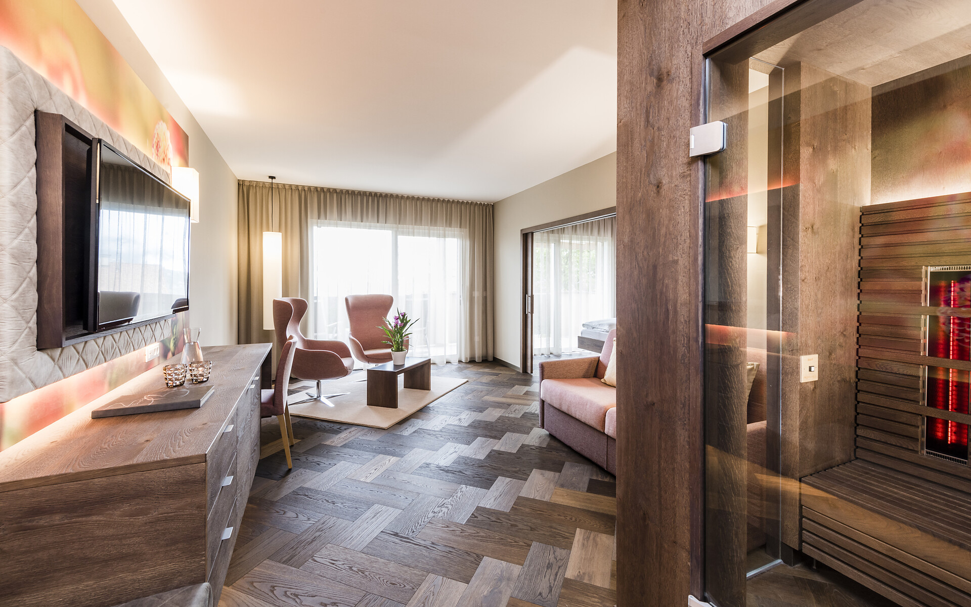 due camere da letto, una camera soggiorno, larghezza del letto nella seconda camera 1,40m, due bagni, doccia, WC, bidè, asciugacapelli, specchio cosmetico, teli per la sauna, accappatoio, climatizzato, infrarossi, pavimento di legno, minibar, macchina cafè Nespresso, 2 x TV satellitare flat, telefono, WiFi, cassetta di sicurezza, balcone a sud-ovest.