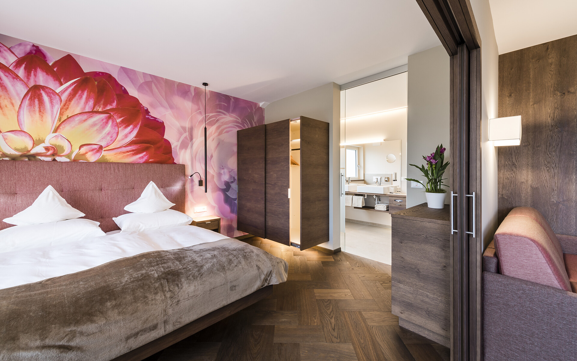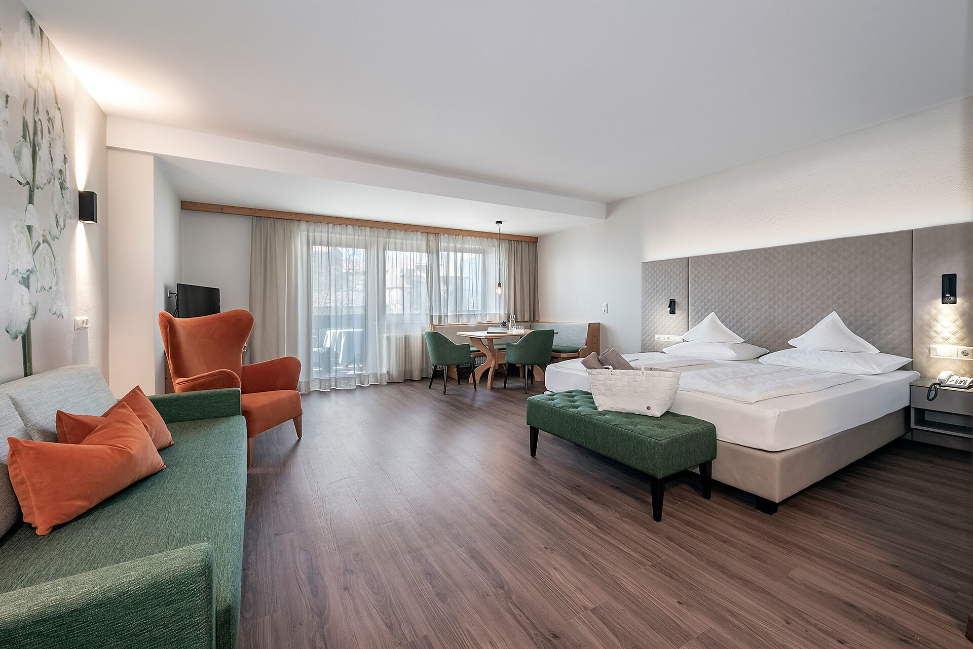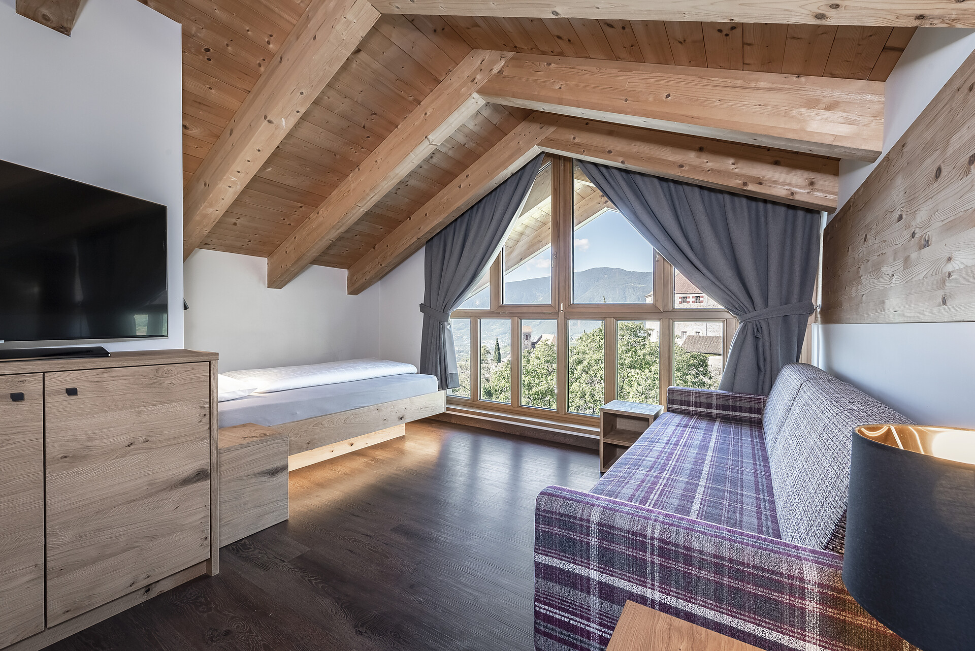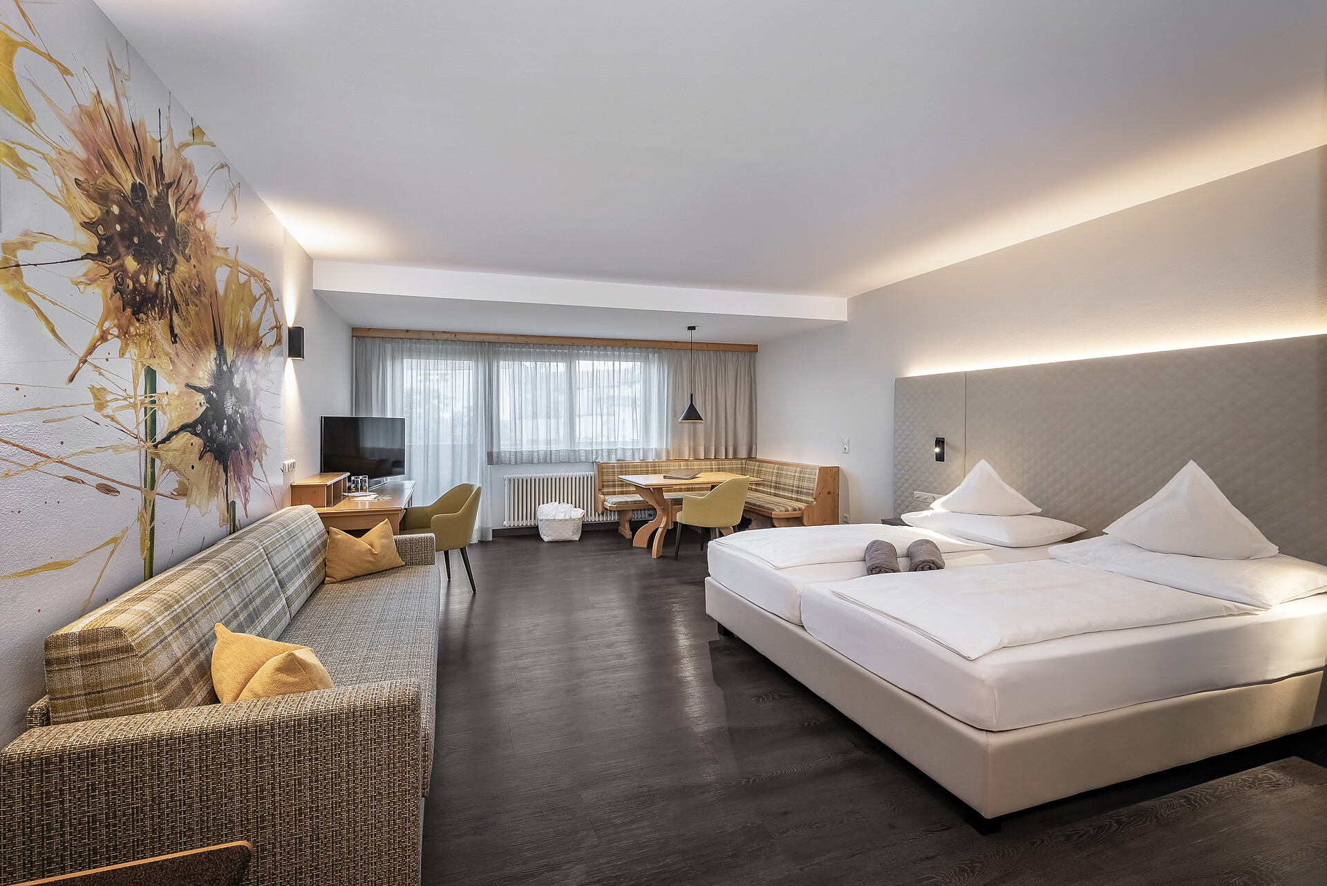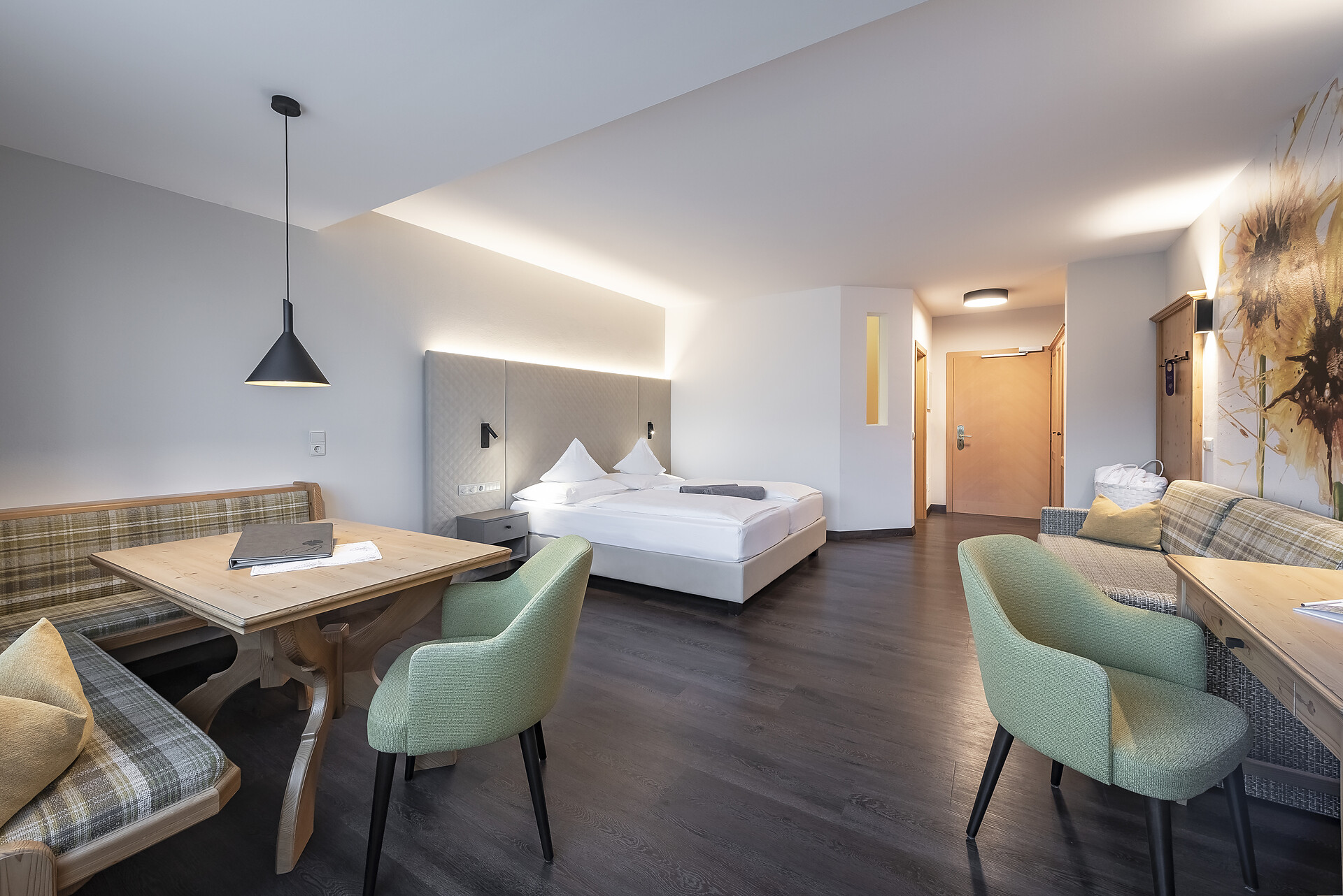 due camere da letto, una camera soggiorno, larghezza del letto nella seconda camera 1,40m, due bagni, doccia, WC, bidè, asciugacapelli, specchio cosmetico, teli per la sauna, accappatoio, climatizzato, infrarossi, pavimento di legno, minibar, macchina cafè Nespresso, 2 x TV satellitare flat, telefono, WiFi, cassetta di sicurezza, balcone a sud-ovest.