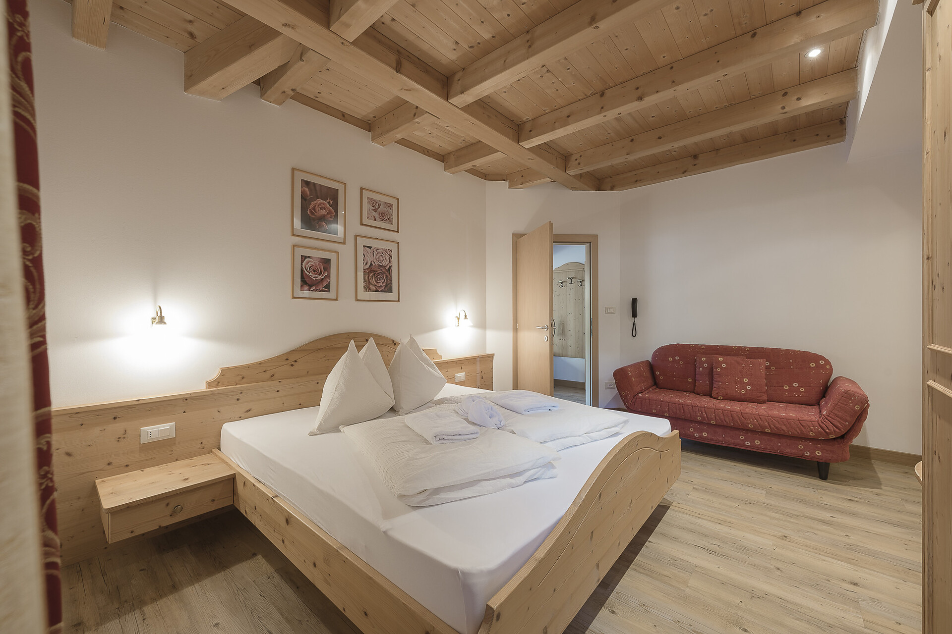 2° piano, 2-4 persone Camera doppia comfort con pavimento in legno, divano letto, angolo soggiorno, TV a schermo piatto, cassaforte, bagno con doppio lavabo, doccia, bidè, asciugacapelli, balcone lato sud con vista panoramica, sole al pomeriggio e alla sera.