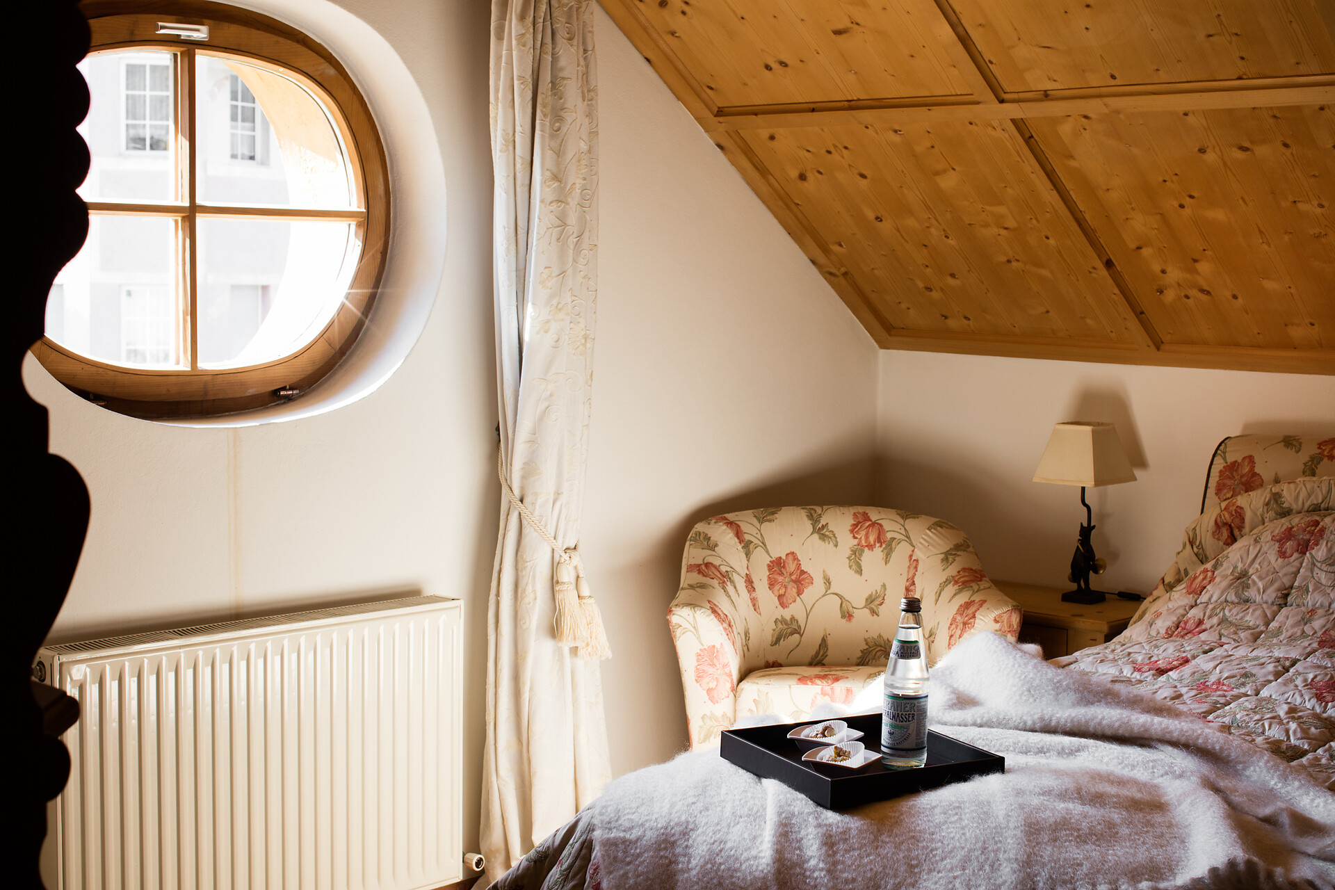 La combinazione armoniosa tra diverse varietà di legno conferisce alla camera in mansarda un’atmosfera intima e famigliare. Le finestre regalano agli ospiti una vista su una piccola Paulonia e lo stabilimento di Birra FORST.