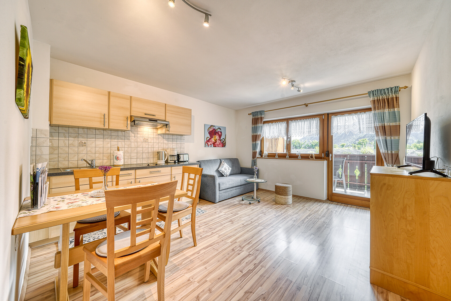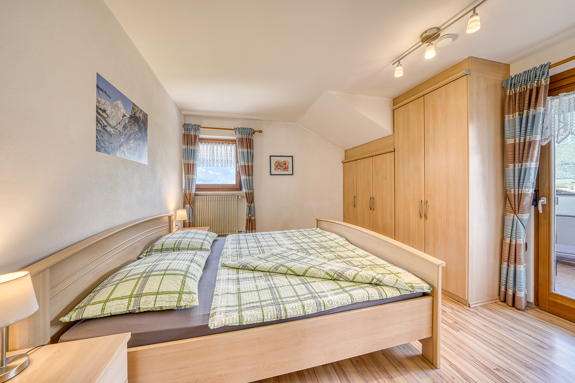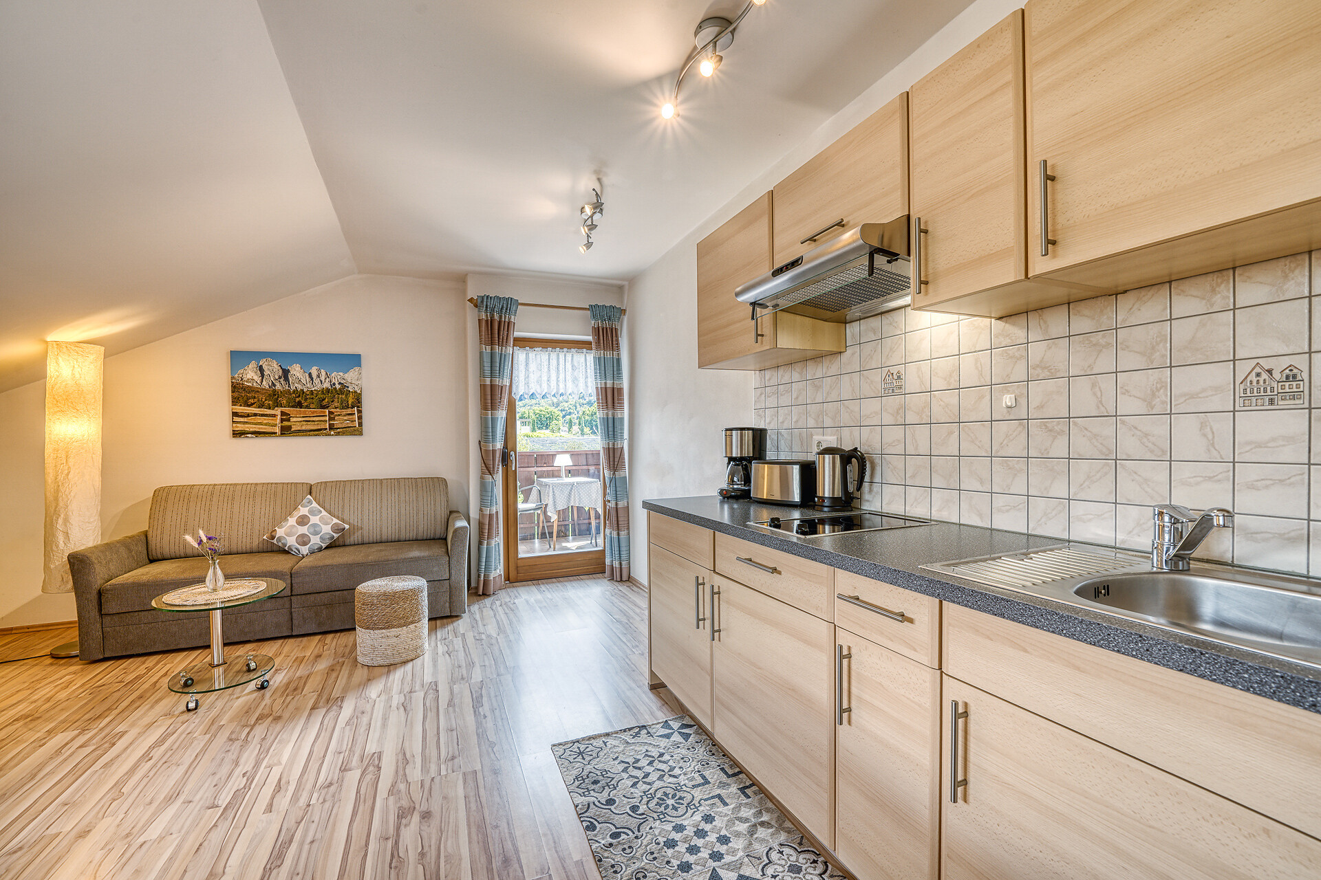 Letto matrimoniale, Divano letto matrimoniale, Balcone, Biancheria da letto disponibile, Cassaforte, Appartamento non fumatori, Cucina separata, Macchina da caffè, Forno a microonde, Stoviglie, Piano cottura, Scaldaacqua, Doccia / bagno, Fon, TV, TV satellitare/via cavo, WLAN, Pulizia finale inclusa, Edificio principale, Lato sud