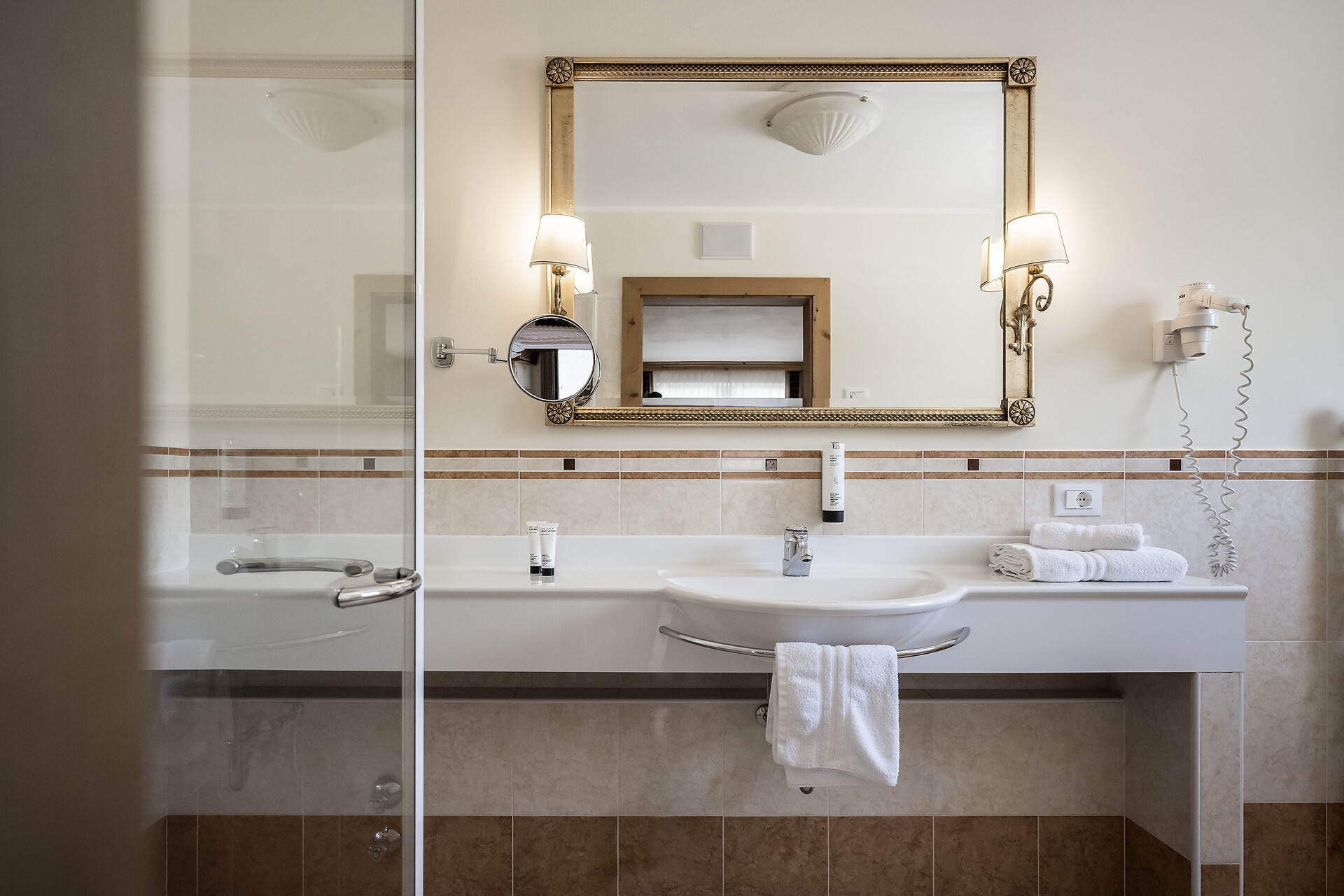 L’Hotel Viktoria è adagiato sull’altopiano di Avelengo e promette una totale immersione nel relax, grazie ai numerosi servizi wellness immersi in un’incantevole paesaggio. Dal parcheggio vicino all’ingresso (2 posti auto riservati) si accede agevolmente all’ascensore (140x110 cm) che conduce alla reception e ai vari piani dell’hotel. La stanza rilevata è luminosa e dotata di balcone panoramico e bagno confortevole. La sala da pranzo con stube, la lounge, la terrazza, il beauty center e i servizi igienici sono accessibili a tutti. Piscina, palestra, saune e parco (con idromassaggio, sauna all’aperto e laghetto) sono raggiungibili tramite scale o tramite percorso esterno che attraversa il parcheggio.